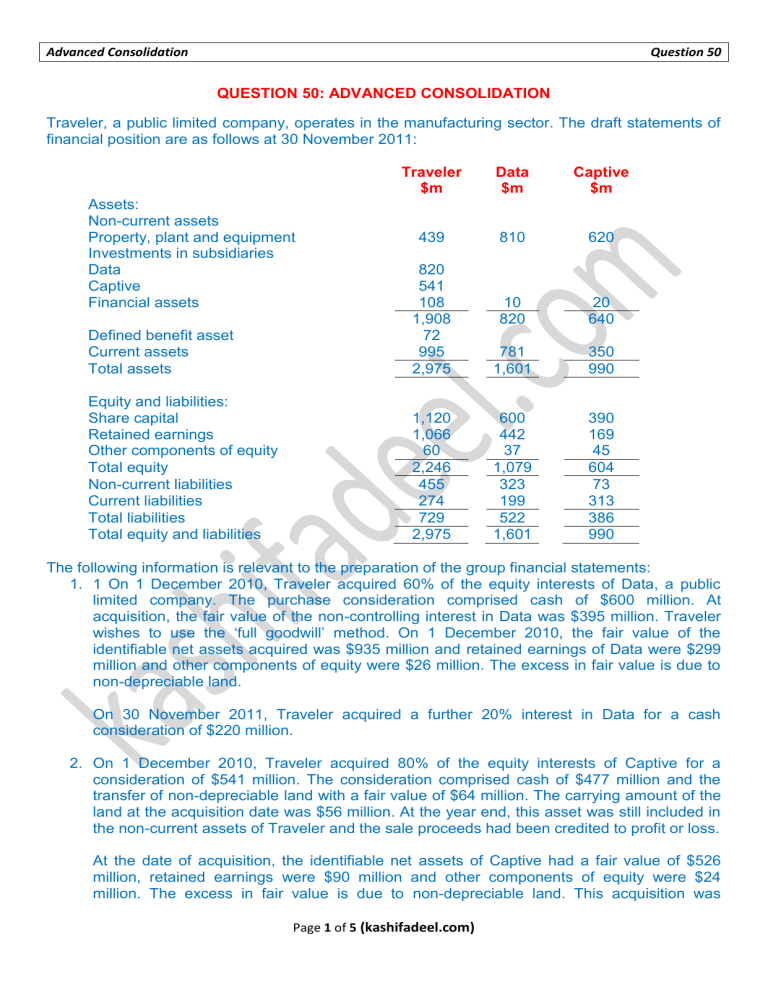 Advanced Consolidation Question 50 QUESTION 50: ADVANCED CONSOLIDATION Traveler, a public limited company, operates in the manufacturing sector. The draft statements of financial position are as follows at 30 November 2011: Assets: Non-current assets Property, plant and equipment Investments in subsidiaries Data Captive Financial assets Traveler $m Data $m Captive $m 439 810 620 10 820 20 640 Defined benefit asset Current assets Total assets 820 541 108 1,908 72 995 2,975 781 1,601 350 990 Equity and liabilities: Share capital Retained earnings Other components of equity Total equity Non-current liabilities Current liabilities Total liabilities Total equity and liabilities 1,120 1,066 60 2,246 455 274 729 2,975 600 442 37 1,079 323 199 522 1,601 390 169 45 604 73 313 386 990 The following information is relevant to the preparation of the group financial statements: 1. 1 On 1 December 2010, Traveler acquired 60% of the equity interests of Data, a public limited company. The purchase consideration comprised cash of $600 million. At acquisition, the fair value of the non-controlling interest in Data was $395 million. Traveler wishes to use the ‘full goodwill’ method. On 1 December 2010, the fair value of the identifiable net assets acquired was $935 million and retained earnings of Data were $299 million and other components of equity were $26 million. The excess in fair value is due to non-depreciable land. On 30 November 2011, Traveler acquired a further 20% interest in Data for a cash consideration of $220 million. 2. On 1 December 2010, Traveler acquired 80% of the equity interests of Captive for a consideration of $541 million. The consideration comprised cash of $477 million and the transfer of non-depreciable land with a fair value of $64 million. The carrying amount of the land at the acquisition date was $56 million. At the year end, this asset was still included in the non-current assets of Traveler and the sale proceeds had been credited to profit or loss. At the date of acquisition, the identifiable net assets of Captive had a fair value of $526 million, retained earnings were $90 million and other components of equity were $24 million. The excess in fair value is due to non-depreciable land. This acquisition was Page 1 of 5 (kashifadeel.com) Advanced Consolidation Question 50 accounted for using the partial goodwill method in accordance with IFRS 3 (Revised) Business Combinations. 3. Goodwill was impairment tested after the additional acquisition in Data on 30 November 2011. The recoverable amount of Data was $1,099 million and that of Captive was $700 million. 4. Included in the financial assets of Traveler is a ten-year 7% loan held at amortised cost. At 30 November 2011, the borrower was in financial difficulties and its credit rating had been downgraded. At this date, the gross carrying amount of the loan asset was $30 million and the loss allowance was $1 million. Traveler has agreed for the loan to be restructured; there will only be three more annual payments of $8 million starting in one year’s time. Current market interest rates are 8%, the original effective interest rate is 6·7% and the effective interest rate under the revised payment schedule is 6·3%. 5. Traveler acquired a new factory on 1 December 2010. The cost of the factory was $50 million and it has a residual value of $2 million. The factory has a flat roof, which needs replacing every five years. The cost of the roof was $5 million. The useful economic life of the factory is 25 years. No depreciation has been charged for the year. Traveler wishes to account for the factory and roof as a single asset and depreciate the whole factory over its economic life. Traveler uses straight-line depreciation. 6. The actuarial value of Traveler’s pension plan showed a surplus at 1 December 2010 of $72 million, represented by plan assets with the fair value of $322 million and, the present value of the defined benefit obligation of $250 million. The aggregate of the current and past service costs and the net interest component amount to $55 for the year ended 30 November 2011. After consulting with the actuaries, the company contributed $45 million into the plan on the last day of the year. No entries had been made in the financial statements for the above amounts. At the year end, the fair values of the plan assets are $340 million and the present value of the obligation amounts to $288 million. At both the start and end of the year, the pension surplus falls below the asset ceiling. Required: Prepare a consolidated statement of financial position for the Traveler Group for the year ended 30 November 2011. (35 marks) ACCA P2 – December 2011 – Q1a Page 2 of 5 (kashifadeel.com) Advanced Consolidation Question 50 ANSWER TO QUESTION 50: ADVANCED CONSOLIDATION Traveler Group Consolidated Statement of Financial Position as at 30 November 2011 $m 1,842 69 130 52 PPE $439+810+620+32 J1 – 56 J3 – 3 J6 Goodwill W3 Financial assets $108+10+20 – 8 J5 Defined benefit assets $72 – 20 J7 Current assets $995+781+350 – 45 J7 2,081 4,174 Share Capital Other reserves W6 Retained earnings W6 1,120 74 1,000 2,194 343 2,537 851 NCI W5 Non-current liabilities $455+323+73 Current Liabilities $274+199+313 786 4,174 W1 GROUP STRUCTURE Data Subsidiary Acquisition: 1 Dec 2010 Captive Subsidiary Acquisition: 1 Dec 2010 Group 60% Group 80% NCI 40% NCI 20% $m W2 NET ASSETS (of subsidiaries) AT ACQUISITION Equity share capital Other reserves (pre) Retained earnings (pre) J1 Data 600 26 299 10 935 Captive 390 24 90 22 526 W3 GOODWILL Investment [820 – 220 J2] ; [541] Less: [935 W2 x 60%] ; [526 W2 x 80%] Data 600 (561) 39 395 (374) 21 60 (50) 10 Captive 541 (421) 120 Fair value of NCI Less: [935 W2 x 40%] Impairment W4 POST ACQUISITION RESERVES Balance OR Data 11 120 (61) 59 RE Captive 21 Page 3 of 5 (kashifadeel.com) Data 143 Captive 79 Advanced Consolidation Question 50 J4 11 21 W5 NON CONTROLLING INTEREST [935 W2 x 40%] ; [5