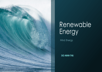 Renewable Energy Wind Energy DO MINH THU Content: I. Overview: 1. 2. What is renewable energy? Why is renewable energy of interest? II. Few common sources of renewable energy. III. Wind energy in Vietnam Source: United Nation & IRENA I. OVERVIEW: 1. What is Renewable Energy? • Renewable energy is energy derived from natural sources that are replenished at a higher rate than they are consumed. • Fossil fuels - coal, oil and gas - on the other hand, are non-renewable resources that take hundreds of millions of years to form I. OVERVIEW: 2. Why is renewable energy of interest? • All around us • Cheaper • Healthier • Creates jobs • Makes economic sense Renewable energy – powering a safer future Renewable energy sources, such as wind and solar, emit little to no greenhouse gases, are readily available and in most cases cheaper than coal, oil or gas. Renewable energy sources are all around us Renewable energy sources are available in all countries, and their potential is yet to be fully harnessed. The International Renewable Energy Agency (IRENA) estimates that 90 percent of the world’s electricity can and should come from renewable energy by 2050. Renewables offer a way out of import dependency, allowing countries to diversify their economies and protect them from the unpredictable price swings of fossil fuels, while driving inclusive economic growth, new jobs, and poverty alleviation. Renewable energy is cheaper Renewable energy actually is the cheapest power option in most parts of the world today. Prices for renewable energy technologies are dropping rapidly. The cost of electricity from solar power fell by 85 percent between 2010 and 2020. Costs of onshore and offshore wind energy fell by 56 percent and 48 percent respectively. Cheap electricity from renewable sources could provide 65 percent of the world’s total electricity supply by 2030. It could decarbonize 90 percent of the power sector by 2050, massively cutting carbon emissions and helping to mitigate climate change. (Says the International Energy Agency (IEA)) Renewable energy is healthier According to the World Health Organization (WHO), about 99 percent of people in the world breathe air that exceeds air quality limits and threatens their health The unhealthy levels of fine particulate matter and nitrogen dioxide originate mainly from the burning of fossil fuels. In 2018, air pollution from fossil fuels caused $2.9 trillion in health and economic costs, about $8 billion a day. Switching to clean sources of energy, such as wind and solar, thus helps address not only climate change but also air pollution and health. Renewable energy creates jobs Every dollar of investment in renewables creates three times more jobs than in the fossil fuel industry. The IEA estimates that the transition towards net-zero emissions will lead to an overall increase in energy sector jobs: while about 5 million jobs in fossil fuel production could be lost by 2030, an estimated 14 million new jobs would be created in clean energy, resulting in a net gain of 9 million jobs. In addition, energy-related industries would require a further 16 million workers, for instance to take on new roles in manufacturing of electric vehicles and hyper-efficient appliances or in innovative technologies such as hydrogen. This means that a total of more than 30 million jobs could be created in clean energy, efficiency, and low-emissions technologies by 2030. Ensuring a just transition, placing the needs and rights of people at the heart of the energy transition, will be paramount to make sure no one is left behind. Renewable energy makes economic sense About $4.5 trillion a year needs to be invested in renewable energy until 2030 – including investments in technology and infrastructure – to allow us to reach net-zero emissions by 2050. The upfront cost can be daunting for many countries with limited resources, and many will need financial and technical support to make the transition. But investments in renewable energy will pay off. The reduction of pollution and climate impacts alone could save the world up to $4.2 trillion per year by 2030. II. FEW COMMON SOURCES OF RENEWABLE ENERGY: 1. SOLAR ENERGY 2. WIND ENERGY 3. GEOTHERMAL ENERGY 4. HYDROPOWER 5. OCEAN ENERGY 6. BIOENERGY 1. SOLAR ENERGY • Solar energy is the most abundant of all energy resources and can even be harnessed in cloudy weather. The rate at which solar energy is intercepted by the Earth is about 10,000 times greater than the rate at which humankind consumes energy. • Solar technologies can deliver heat, cooling, natural lighting, electricity, and fuels for a host of applications. Solar technologies convert sunlight into electrical energy either through photovoltaic panels or through mirrors that concentrate solar radiation. • The cost of manufacturing solar panels has plummeted dramatically in the last decade, making them not only affordable but often the cheapest form of electricity. Solar panels have a lifespan of roughly 30 years, and come in variety of shades depending on the type of material used in manufacturing. 2. WIND ENERGY Wind energy harnesses the kinetic energy of moving air by using large wind turbines located on land (onshore) or in sea- or freshwater (offshore). Wind energy has been used for millennia, but onshore and offshore wind energy technologies have evolved over the last few years to maximize the electricity produced - with taller turbines and larger rotor diameters. • Many parts of the world have strong wind speeds, but the best locations for generating wind power are sometimes remote ones. Offshore wind power offers tremendous potential. • 3. GEOTHERMAL EERGY Geothermal energy utilizes the accessible thermal energy from the Earth’s interior. Heat is extracted from geothermal reservoirs using wells or other means. Reservoirs that are naturally sufficiently hot and permeable are called hydrothermal reservoirs, whereas reservoirs that are sufficien