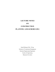 LECTURE NOTES ON CONSTRUCTION PLANNING AND SCHEDULING Emad Elbeltagi, Ph.D., P.Eng., Professor of Construction Management Structural Engineering Department, Faculty of Engineering, Mansoura University Construction Project Management 2012 Copyright © 2012 by the author. All rights reserved. No part of this book may be reproduced or distributed in any form or by any means, or stored in a data base or retrieval system, without the prior written permissions of the author. PREFACE In the Name of ALLAH the Most Merciful, the Most Compassionate All praise is due to ALLAH and blessings and peace be upon His messenger and servant, Muhammad, and upon his family and companions and whoever follows his guidance until the Day of Resurrection. Construction project management is a relatively young field. However, its impact has been quite remarkable. It has become an important practice for improving the efficiency of construction operations around the world. This book deals with some topics and tools of the large field of project management. This book is dedicated mainly to undergraduate engineering students, especially Civil Engineering students where most of the applications are presented in the civil engineering field. It provides the reader with the main knowledge to manage a construction project from preliminary stages to handover. It includes seven chapters: Chapter 1 provides the planning stages of a construction project. Chapter 2 is dedicated for presenting different scheduling techniques along with the schedule representation. Chapter 3 is dedicated to discuss the scheduling methods on non-deterministic activity durations. Chapter 4 is dealing with both the resource scheduling and smoothing problems. The schedule compression is, also, presented in chapter 5. Chapter 6 is dedicated for the project finance and cash flow analysis. Finally, chapter 7 is dedicated for project control. Many solved examples have been added to enable the students to understand the material presented in this book. Also, each chapter is followed by exercises for training purposes. Finally, May ALLAH accepts this humble work and I hope it will be beneficial to its readers. i TABLE OF CONTENTS CHAPTER 1: PROJECT PLANNING 1.1 Introduction 1 1.2 Project Planning Steps 2 1.2.1 Work Breakdown Structure (WBS) 3 1.2.2 Project Activities 7 1.2.3 Activities Relationships 11 1.2.4 Drawing Project Network 17 1.3 Estimating Activity Duration and Direct Cost 24 1.4 Exercises 27 CHAPTER 2: PROJECT SCHEDULING 2.1 The Critical Path Method 34 2.2 Calculations for the Critical Path Method 35 2.2.1 Activity-On-Arrow Networks Calculations 35 2.2.2 Precedence Diagram Method (PDM) 42 2.3 Time-Scaled Diagrams 45 2.4 Schedule Presentation 47 2.5 Criticisms to Network Techniques 48 2.6 Solved Examples 49 2.6.1 Example 1 49 2.6.2 Example 2 50 2.6.3 Example 3 51 2.6.4 Example 4 52 2.7 Exercises 53 ii CHAPTER 3: STOCHASTIC SCHEDULING 3.1 Scheduling with Uncertain Durations 59 3.1.1 Program Evaluation and Review Technique 61 3.1.2 Criticism to Program Evaluation and Review Technique 68 3.3 Exercises 69 CHAPTER 4: RESOURCES MANAGEMENT 4.1 Resource Definition 72 4.2 Resource Management 73 4.3 Resource Allocation 75 4.4 Resource Aggregation (Loading) 75 4.5 Resource Leveling (Smoothing) 77 4.5.1 Method of Moments for Resource Smoothing 78 4.5.2 Heuristic Procedure for Resource Smoothing 79 4.6 Scheduling with Limited Resource 88 4.7 Case Study 90 4.8 Exercises 97 CHAPTER 5: PROJECT TIME-COST TRADE-OFF 5.1 Time-Cost Trade-Off 100 5.2 Activity Time-Cost Relationship 101 5.3 Project Time-Cost Relationship 105 5.4 Shortening Project Duration 106 5.5 Exercises 116 iii CHAPTER 6: PROJECT CASH FLOW 6.1 Contract Cash Flow 118 6.1.1 Construction Project Costs 119 6.1.2 The S-Curve 122 6.1.3 Project Income (Cash-in) 124 6.1.4 Calculating Contract Cash Flow 126 6.1.5 Minimizing Contractor Negative Cash Flow 131 6.1.6 Cost of Borrowing (Return on Investment) 133 6.2 Project Cash Flow 138 6.2.1 Project Profitability Indicators 139 6.3 Discounted Cash Flow 141 6.3.1 Present Value 141 6.3.2 Net Present Value (NPV) 142 6.3.3 Internal Rate of Return (IRR) 143 6.4 Exercises 144 CHAPTER 7: PROJECT CONTROL 7.1 Problems that may Arise During Construction 148 7.2 Schedule Updating 149 7.3 Earned Value Management 153 7.4 Exercises 157 REFERENCES 159 iv CHAPTER 1 PROJECT PLANNING This chapter deals with preparing projects plans in terms of defining: work breakdown structure, activities, logical relations, durations and activities direct cost. Terminology of project planning will be presented and discussed. Project network representation using different graphical methods including: activity on arrow and activity on node are presented. 1.1 Introduction Planning is a general term that sets a clear road map that should be followed to reach a destination. The term, therefore, has been used at different levels to mean different things. Planning involves the breakdown of the project into definable, measurable, and identifiable tasks/activities, and then establishes the logical interdependences among them. Generally, planning answers three main questions: What is to be done? How to do it? Who does it? In construction, for example, plans may exist at several levels: corporate strategic plans, pre-tender plans, pre-contract plans, short-term construction plans, and long-term construction plans. These plans are different from each other; however, all these plans involve four main steps: Planning & Scheduling 1 Dr. Emad Elbeltagi - Performing breakdown of work items involved in the project into activities. - Identifying the proper sequence by which the activities should be executed. - Activities representation. - Estimating the resources, time, and cost of individual activities. Detailed planning for tendering purposes and the preparation of construction needs to be conducted through brainstorming sessions among the planning team. The inputs and outputs of the planning process are shown