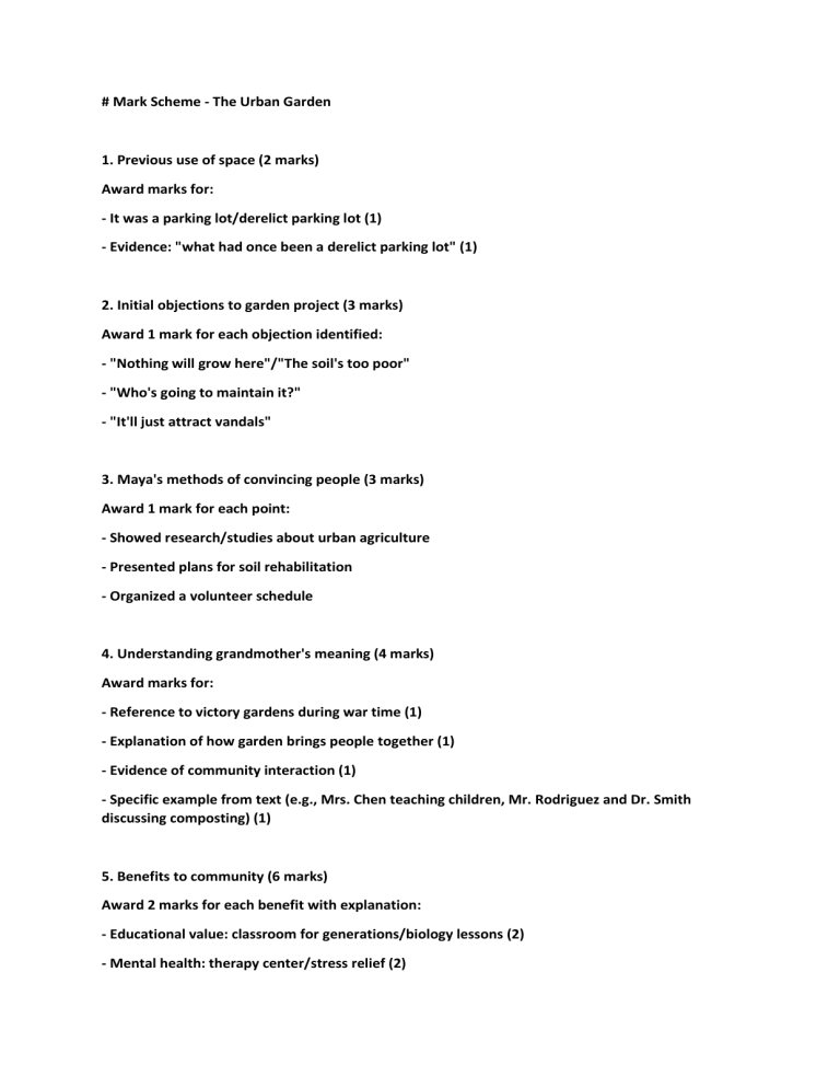 # Mark Scheme - The Urban Garden 1. Previous use of space (2 marks) Award marks for: - It was a parking lot/derelict parking lot (1) - Evidence: "what had once been a derelict parking lot" (1) 2. Initial objections to garden project (3 marks) Award 1 mark for each objection identified: - "Nothing will grow here"/"The soil's too poor" - "Who's going to maintain it?" - "It'll just attract vandals" 3. Maya's methods of convincing people (3 marks) Award 1 mark for each point: - Showed research/studies about urban agriculture - Presented plans for soil rehabilitation - Organized a volunteer schedule 4. Understanding grandmother's meaning (4 marks) Award marks for: - Reference to victory gardens during war time (1) - Explanation of how garden brings people together (1) - Evidence of community interaction (1) - Specific example from text (e.g., Mrs. Chen teaching children, Mr. Rodriguez and Dr. Smith discussing composting) (1) 5. Benefits to community (6 marks) Award 2 marks for each benefit with explanation: - Educational value: classroom for generations/biology lessons (2) - Mental health: therapy center/stress relief (2) - Social connection: meeting place/cultural exchange (2) 6. Aisha's story impact (3 marks) Award marks for: - Initially struggled with language/communication (1) - Gained confidence through gardening (1) - Now shares knowledge with others/contributes to community (1) 7. Cultural diversity in the garden (3 marks) Award 1 mark for each example with explanation: - Italian basil from Mrs. Rossi's family - Chilies from Mr. Patel's village - Indigenous corn varieties 8. "Revolution in miniature" effectiveness (3 marks) Award marks for: - Shows contrast with digital/modern life (1) - Represents social change/community building (1) - Demonstrates transformation of both space and people (1) 9. Word suggesting stress relief (1 mark) Award 1 mark for: - "peace" 10. Development of community theme (2 marks) Award marks for: - Clear explanation of how community develops throughout passage (1) - Relevant supporting evidence from text (1) Additional Marking Guidelines: - Accept any valid alternatives supported by the text - Reward clear expression and detailed analysis - Credit relevant quotations that support answers - For multi-mark questions, award marks for different points (avoid crediting the same point twice) - Responses should demonstrate understanding of explicit and implicit meanings Total: 30 marks
