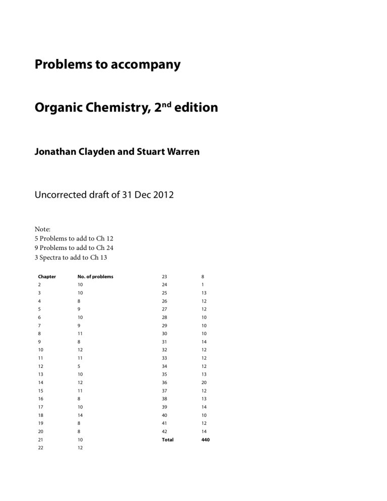 Problems to accompany Organic Chemistry, 2nd edition Jonathan Clayden and Stuart Warren Uncorrected draft of 31 Dec 2012 Note: 5 Problems to add to Ch 12 9 Problems to add to Ch 24 3 Spectra to add to Ch 13 Chapter No. of problems 23 8 2 10 24 1 3 10 25 13 4 8 26 12 5 9 27 12 6 10 28 10 7 9 29 10 8 11 30 10 9 8 31 14 10 12 32 12 11 11 33 12 12 5 34 12 13 10 35 13 14 12 36 20 15 11 37 12 16 8 38 13 17 10 39 14 18 14 40 10 19 8 41 12 20 8 42 14 21 10 Total 440 22 12 2 Problems to accompany Organic Chemistry 2e 2 Problems for Chapter 2 PROB LE M 1 Draw good diagrams of saturated hydrocarbons with seven carbon atoms having (a) linear, (b) branched, and (c) cyclic structures. Draw molecules based on each framework having both ketone and carboxylic acid functional groups in the same molecule. PROB LE M 2 Draw for yourself the structures of amoxicillin and Tamiflu on page 10 of the textbook. Identify on your diagrams the functional groups present in each molecule and the ring sizes. Study the carbon framework: is there a single carbon chain or more than one? Are they linear, branched, or cyclic? NH2 H H N O H S O H3C HO O CH3 N O O H3C HN CO2H SmithKline Beechamʼs amoxycillin !-lactam antibiotic for treatment of bacterial infections H3C O Tamiflu (oseltamivir) invented by Gilead Sciences marketed by Roche NH2 PROB LE M 3 Identify the functional groups in these two molecules O O O O NH Ph O O O O O OH OH the heart drug candoxatril O a derivative of the sugar ribose PROB LE M 4 What is wrong with these structures? Suggest better ways to represent these molecules 4 Problems to accompany Organic Chemistry 2e H H O C C H NH H H 2C OH H N H 2C CH2 CH2 Me H H H NH2 PROB LE M 5 Draw structures for the compounds named systematically here. In each case suggest alternative names that might convey the structure more clearly if you were speaking to someone rather than writing. (a) 1,4-di-(1,1-dimethylethyl)benzene (b) 1-(prop-2-enyloxy)prop-2-ene (c) cyclohexa-1,3,5-triene PROB LE M 6 Translate these very poor structural descriptions into something more realistic. Try to get the angles about right and, whatever you do, don’t include any square planar carbon atoms or any other bond angles of 90°. (a) C6H5CH(OH)(CH2)4COC2H5 (b) O(CH2CH2)2O (c) (CH3O)2CH=CHCH(OCH3)2 PROB LE M 7 Identify the oxidation level of all the carbon atoms of the compounds in problem 6. PROB LE M 8 Draw full structures for these compounds, displaying the hydrocarbon framework clearly and showing all the bonds in the functional groups. Name the functional groups. (a) AcO(CH2)3NO 2 (b) MeO2CCH2OCOEt (c) CH2=CHCONH(CH2)2CN Problems for Chapter 2 – Organic Structures PROB LE M 9 Draw structures for the folllowing molecules, and then show them again using at least one ‘organic element’ symbol in each. (a) ethyl acetate (b) chloromethyl methyl ether (c) pentanenitrile (d) N-acetyl p-aminophenol (e) 2,4,6,-tri-(1,1-dimethylethyl)phenylamine PROB LE M 1 0 Suggest at least six different structures that would fit the formula C4H7NO. Make good realistic diagrams of each one and say which functional groups are present. 5 Problems for Chapter 3 PROB LE M 1 Assuming that the molecular ion is the base peak (100% abundance) what peaks would appear in the mass spectrum of each of these molecules: (a) C2H5BrO (b) C60 (c) C6H4BrCl In cases (a) and (c) suggest a possible structure of the molecule. What is (b)? PROB LE M 2 Ethyl benzoate PhCO2Et has these peaks in its 13C NMR spectrum: 17.3, 61.1, 100-150 (four peaks) and 166.8 ppm. Which peak belongs to which carbon atom? You are advised to make a good drawing of the molecule before you answer. PROB LE M 3 Methoxatin was mentioned on page 44 of the textbook where we said ‘it proved exceptionally difficult to solve the structure by NMR.’ Why is it so difficult? Could anything be gained from the 13C or 1H NMR? What information could be gained from the mass spectrum and the infra red? PROB LE M 4 The solvent formerly used in some correcting fluids is a single compound C2H3Cl 3, having 13C NMR peaks at 45.1 and 95.0 ppm. What is its structure? How would you confirm it spectroscopically? A commercial paint thinner gives two spots on chromatography and has 13C NMR peaks at 7.0, 27.5, 35.2, 45.3, 95.6, and 206.3 ppm. Suggest what compounds might be used in this thinner. PROB LE M 5 The ‘normal’ O–H stretch in the infrared (i.e. without hydrogen bonding) comes at about 3600 cm–1. What is the reduced mass (µ) for O–H? What happens to 3 8 Problems to accompany Organic Chemistry 2e the reduced mass when you double the mass of each atom in turn, i.e. what is µ for O–D and what is µ for S–H? In fact, both O–D and S–H stretches come at about 2,500 cm –1. Why? PROB LE M 6 Three compounds, each having the formula C3H5NO, have the IR data summarized here. What are their structures? Without 13C NMR data it might be easier to draw some or all possible structures before trying to decide which is which. In what ways would 13C NMR data help? (a) One sharp band above 3000 cm–1 and one strong band at about 1700 cm–1 (b) Two sharp bands above 3000 cm–1 and two bands between 1600 and 1700 cm–1 (c) One strong broad band above 3000 cm–1 and a band at about 2200 cm–1 PROB LE M 7 Four compounds having the formula C4H6O2 have the IR and NMR data given below. How many DBEs (double bond equivalents—see p. 75 in the textbook) are there in C4H6O2? What are the structures of the four compounds? You might again find it useful to draw a few structures to start with. (a) IR: 1745 cm–1; 13C NMR 214, 82, 58, and 41 ppm (b) IR: 3300 cm–1 (broad); 13C NMR 62 and 79 ppm. (c) IR: 1770 cm–1; 13C NMR 178, 86, 40, and 27 ppm. (d) IR: 1720 and 1650 cm –1 (strong); 13C NMR 165, 133, 131, and 54 ppm. PROB LE M 8 You have dissolved tert-butanol in MeCN with an acid catalyst, left the solution overnight, and found crystals in the morning with the following characteristics. What are the crystals? OH H