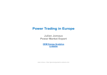 Power Trading in Europe Julien Jomaux Power Market Expert GEM Energy Analytics LinkedIn Julien Jomaux - https://gemenergyanalytics.substack.com/ About myself – Julien Jomaux • Electromechanical engineer from UCL (Belgium). • 10+ years of experience in the electricity sector. • Work experience in Belgium, Rwanda, and Albania. • Writer of a Substack on electricity and markets: GEM Energy Analytics • Currently working as a freelance consultant. My current mission is as a market expert (external) for the Belgian TSO – Elia (balancing markets). Julien Jomaux - https://gemenergyanalytics.substack.com/ GEM Energy Analytics • Personal Substack with more than 50 posts and more than 7000 subscribers. • Currently free-of-charge. • Focus on the energy world / power system / electricity markets. Julien Jomaux - https://gemenergyanalytics.substack.com/ • Part 1: Some physics on electricity Agenda • Part 2: The basics of power trading in Europe • Part 3: Focus on the impact of renewables • Part 4: New trends • Part 5: Particular events Julien Jomaux - https://gemenergyanalytics.substack.com/ Maintaining the equilibrium Source Electricity is all about timing. As electricity is not easily stored (and almost never in electric energy), the equilibrium between the demand and the supply must be maintained at all time. Julien Jomaux - https://gemenergyanalytics.substack.com/ The European grid: a true marvel Julien Jomaux - https://gemenergyanalytics.substack.com/ The birth of the grid • In our present society, it is not imaginable to lack electricity. But it took decades for the grid to reach every house. • It all started by small grids in urban centers and get interconnected more and more. • Interconnections were done as it increases the security of supply while decreasing the cost of maintaining the equilibrium between the supply and demand. The Birth ofJomaux the Grid - by Brian Potter Julien - https://gemenergyanalytics.substack.com/ Towards a global grid ? Global Renewable Energy Grid Project: Integrating Renewables via HVDC and Centralized Storage [PDF] Global Power Grids for Harnessing World Renewable Energy | Semantic Scholar Julien Jomaux - https://gemenergyanalytics.substack.com/ Why are power markets important ? Answer from AI 1. Efficient Resource Allocation: Power markets enable the efficient distribution of electricity by matching supply with demand in real-time. Market mechanisms help ensure that electricity is generated by the most cost-effective sources, leading to overall efficiency in the power system. 2. Price Signals: They provide price signals that reflect the marginal cost of producing electricity. This information is vital for both producers and consumers to make informed decisions. Producers can optimize their generation based on market prices, and consumers can adjust their consumption accordingly. 3. Encouraging Investment: By providing transparent and competitive market prices, power markets create an environment that encourages investment in new generation capacity, including renewable energy sources. This investment is essential for ensuring long-term reliability and sustainability of the power supply. 4. Promoting Competition: Power markets introduce competition among electricity generators, which can lead to lower prices and innovation. Competition drives efficiency improvements and cost reductions, benefiting consumers with more affordable electricity. 5. Integrating Renewables: They play a key role in integrating renewable energy sources, such as wind and solar, into the grid. Power markets can facilitate the balancing of variable renewable energy through mechanisms like ancillary services and real-time balancing markets. 6. Risk Management: Power markets allow participants to manage risks associated with price volatility through various financial instruments such as futures, options, and forward contracts. This helps stabilize revenues for generators and costs for consumers. 7. Demand Response: They enable demand response programs wherein consumers can be incentivized to reduce or shift their electricity usage during peak times. This helps in balancing the grid and avoiding blackouts. 8. Regulatory Transparency: Transparent market operations help regulators monitor and ensure fair practices, prevent market manipulation, and protect consumer interests. Julien Jomaux - https://gemenergyanalytics.substack.com/ • Part 1: Some physics on electricity Agenda • Part 2: The basics of power trading in Europe • Part 3: Focus on the impact of renewables • Part 4: New trends • Part 5: Particular events Julien Jomaux - https://gemenergyanalytics.substack.com/ The screens of electricity traders Julien Jomaux - https://gemenergyanalytics.substack.com/ nanoenergies.cz Organization of the European electricity markets Market rules for different electricity market timeframes | www.acer.europa.eu Different markets depending on the moment to buy compared to delivery Julien Jomaux - https://gemenergyanalytics.substack.com/ Organization of the European electricity markets • Physical constraint: generation must be equal to consumption at all time. • The European solution? • Make the day-ahead market the cornerstone of this equilibrium ( main market). • Intraday market possibilities to adjust positions from day-ahead to real-time. • Balancing markets In real-time (and close to real-time), the TSOs are the ones managing the equilibrium. • • Balancing capacity TSOs pay a fee to be able to modify upwards and downwards. • Balancing energy TSOs pay to activate the balancing capacity. • Imbalance price/settlement mechanism to incentivize market parties to behave correctly. Forward/future markets hedging mechanisms against the day-ahead market. Julien Jomaux - https://gemenergyanalytics.substack.com/ Organization of the European electricity markets • • Forward markets: • Market participants hedge the risk and/or exposure against possible 