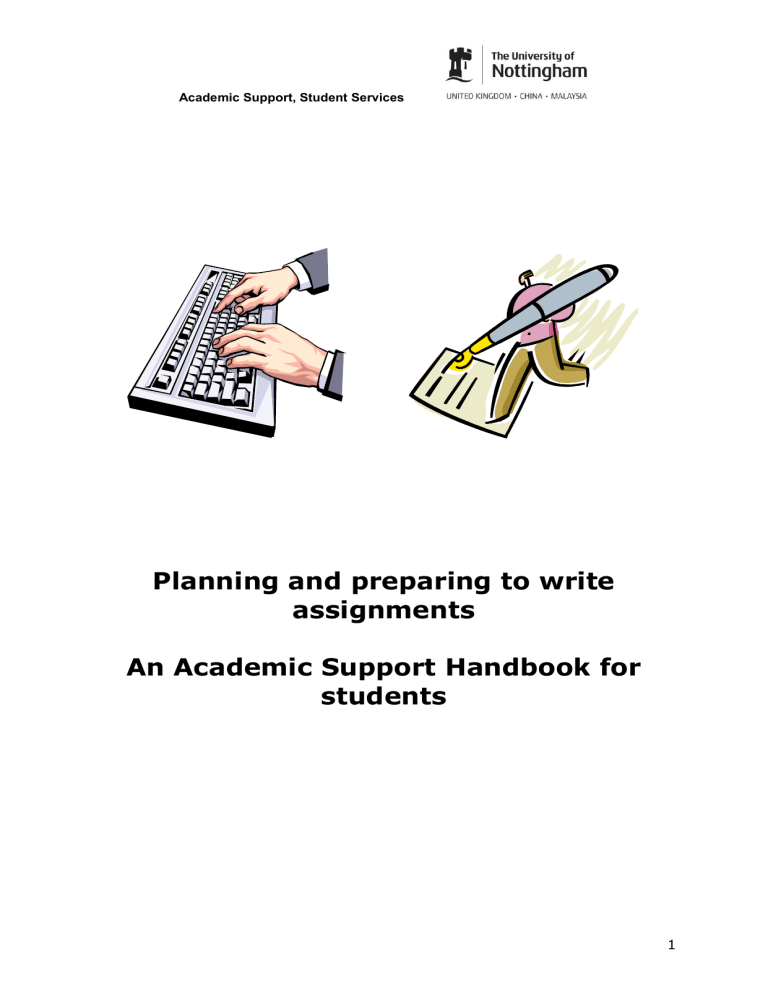 Academic Support, Student Services Planning and preparing to write assignments An Academic Support Handbook for students 1 Academic Support, Student Services Introduction to ‘Planning and preparing to write assignments’ This handbook on preparing to write assignments is designed to help you develop your strategies for planning. Hopefully, it will help you to get the most out of your experience of writing at University and provide encouragement for managing this type of assessment. A list of useful resources referred to here is provided at the end of the handbook. - What sort of writer are you? o Writing University-level assignments o Where and when to work on writing tasks - Understanding the question: Process words o Focusing on the content or topic o Course and subject-specific types of writing - Planning your writing o Types of planning – spider diagrams / Mind Mapping™, outlines, lists o Planning assignments by paragraphs o “Help! Planning does not work for me!” - Start thinking critically o Using SQ3R for reading and notetaking - Gathering information and keeping good records o Building your list of sources - Preparing for writing: presentation and style o Academic conventions About this handbook This handbook has been written and compiled for the students at the University of Nottingham by Dr Lisa Rull with assistance from Lynette Outram and Dr Barbara Taylor. It has drawn on the teaching experience of the University of Nottingham Academic Support team and their associated hand-out material. The package on study skills for mature students produced initially by Dr Mark Dale for the former School of Continuing Education (now Centre for Continuing Education, part of the School of Education) has proven helpful. A list of ‘Useful sources’ is also provided at the end of the document. Updated September 2014 2 Academic Support, Student Services What sort of writer are you? Creme and Lea (1997) identified four types of writer: you may recognise yourself in one of these, or may find you use a combination of approaches. The diver writer The patchwork writer The grand plan writer The architect writer The diver leaps straight in and starts the writing process early on, in order to find out what she wants to say. The diver starts anywhere to see what emerges, before working towards a plan. The writer works on sections (perhaps using headings) quite early in the process, and combines with linking ideas and words later This person reads and makes notes, and leaves writing a plan or beginning writing until they have an almost complete picture of the essay ready in their head The architect has a sense of the structure (perhaps before the content) and could produce a complex plan or spider diagram early in the process 3 Academic Support, Student Services Writing University-level assignments Further advice is available from Studying Effectively which has a section on ‘Writing’ http://www.nottingham.ac.uk/studyingeffectively/writing/index.aspx. This site includes a number of video clips of students talking about writing at University. 4 Academic Support, Student Services Where and when to work on writing tasks (1) It can be helpful to think about where you need to be to prepare, produce and revise your writing. You may not want to work through all the stages in the same location; for example, you may prefer to prepare for writing in the library (so you can easily access resources) or you may prefer to prepare in your room/accommodation (so you are not tempted to gather too many materials). Choosing the right space to work in Your room (study / bedroom) Library / resource centre at University Another room in the house (kitchen / living room table) Computer room at University Elsewhere (e.g. café) What are the benefits of the location e.g. accessibility to materials (lecture notes, books), 24-hour access (opening hours)? What problems may you experience e.g. distractions from family/friends, noise? 5 Academic Support, Student Services Where and when to work on writing tasks (2) The furniture and environment Your desk: have you got a clear working space? Your chair: are you comfortable and supported? Can you sit near a window (for natural light and ventilation)? Is the lighting bright enough / too bright? Do you need a spotlight? Clocks: does it help to have a clock visible? Noise and sound Does listening to music help you concentrate? Sometimes, certain types of music can help with concentration (usually instrumental music, such as classical music). Do you prefer to listen to music on headphones or via speakers? What impact could this have on your neighbours or family? Do you prefer silence? Is the University library too noisy or too quiet for you? Time of day for working: when and how long Is this a productive time of the day to work? You may prefer to do certain tasks at a particular time of the day. Are you a morning person? If you are alert early in the day, you may want to reading or writing tasks now. Do you prefer to work in long chunks of time? Check out our ‘Handbook on Revision and Exams’ which may help you understanding more about your learning style and how memory works. Think carefully about the consequences of working late at night – how this may affect your eating and sleeping patterns, as well as attending lectures. 6 Academic Support, Student Services Understanding the question: Process words It is important to understand what the question is asking you to do. The ‘process word’ or instruction identifies this. Below is a list of common ‘process words’: Account for Analyse Assess Comment on Compare Contrast Compare and contrast Criticise Critically evaluate Define Describe Discuss Distinguish or differentiate between Evaluate Examine Explain How far… Explain why something happens, clarify, give reasons for Identify the main points and significant features. Examine critically and/or in great detail. Identify the value of, weigh up (See also Evaluate) Id