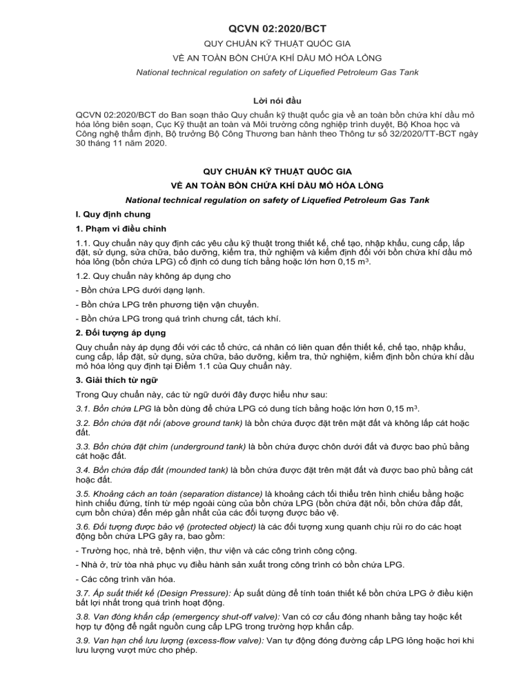 QCVN 02:2020/BCT QUY CHUẨN KỸ THUẬT QUỐC GIA VỀ AN TOÀN BỒN CHỨA KHÍ DẦU MỎ HÓA LỎNG National technical regulation on safety of Liquefied Petroleum Gas Tank Lời nói đầu QCVN 02:2020/BCT do Ban soạn thảo Quy chuẩn kỹ thuật quốc gia về an toàn bồn chứa khí dầu mỏ hóa lỏng biên soạn, Cục Kỹ thuật an toàn và Môi trường công nghiệp trình duyệt, Bộ Khoa học và Công nghệ thẩm định, Bộ trưởng Bộ Công Thương ban hành theo Thông tư số 32/2020/TT-BCT ngày 30 tháng 11 năm 2020. QUY CHUẨN KỸ THUẬT QUỐC GIA VỀ AN TOÀN BỒN CHỨA KHÍ DẦU MỎ HÓA LỎNG National technical regulation on safety of Liquefied Petroleum Gas Tank I. Quy định chung 1. Phạm vi điều chỉnh 1.1. Quy chuẩn này quy định các yêu cầu kỹ thuật trong thiết kế, chế tạo, nhập khẩu, cung cấp, lắp đặt, sử dụng, sửa chữa, bảo dưỡng, kiểm tra, thử nghiệm và kiểm định đối với bồn chứa khí dầu mỏ hóa lỏng (bồn chứa LPG) cố định có dung tích bằng hoặc lớn hơn 0,15 m 3. 1.2. Quy chuẩn này không áp dụng cho - Bồn chứa LPG dưới dạng lạnh. - Bồn chứa LPG trên phương tiện vận chuyển. - Bồn chứa LPG trong quá trình chưng cất, tách khí. 2. Đối tượng áp dụng Quy chuẩn này áp dụng đối với các tổ chức, cá nhân có liên quan đến thiết kế, chế tạo, nhập khẩu, cung cấp, lắp đặt, sử dụng, sửa chữa, bảo dưỡng, kiểm tra, thử nghiệm, kiểm định bồn chứa khí dầu mỏ hóa lỏng quy định tại Điểm 1.1 của Quy chuẩn này. 3. Giải thích từ ngữ Trong Quy chuẩn này, các từ ngữ dưới đây được hiểu như sau: 3.1. Bồn chứa LPG là bồn dùng để chứa LPG có dung tích bằng hoặc lớn hơn 0,15 m 3. 3.2. Bồn chứa đặt nổi (above ground tank) là bồn chứa được đặt trên mặt đất và không lấp cát hoặc đất. 3.3. Bồn chứa đặt chìm (underground tank) là bồn chứa được chôn dưới đất và được bao phủ bằng cát hoặc đất. 3.4. Bồn chứa đắp đất (mounded tank) là bồn chứa được đặt trên mặt đất và được bao phủ bằng cát hoặc đất. 3.5. Khoảng cách an toàn (separation distance) là khoảng cách tối thiểu trên hình chiếu bằng hoặc hình chiếu đứng, tính từ mép ngoài cùng của bồn chứa LPG (bồn chứa đặt nổi, bồn chứa đắp đất, cụm bồn chứa) đến mép gần nhất của các đối tượng được bảo vệ. 3.6. Đối tượng được bảo vệ (protected object) là các đối tượng xung quanh chịu rủi ro do các hoạt động bồn chứa LPG gây ra, bao gồm: - Trường học, nhà trẻ, bệnh viện, thư viện và các công trình công cộng. - Nhà ở, trừ tòa nhà phục vụ điều hành sản xuất trong công trình có bồn chứa LPG. - Các công trình văn hóa. 3.7. Áp suất thiết kế (Design Pressure): Áp suất dùng để tính toán thiết kế bồn chứa LPG ở điều kiện bất lợi nhất trong quá trình hoạt động. 3.8. Van đóng khẩn cấp (emergency shut-off valve): Van có cơ cấu đóng nhanh bằng tay hoặc kết hợp tự động để ngắt nguồn cung cấp LPG trong trường hợp khẩn cấp. 3.9. Van hạn chế lưu lượng (excess-flow valve): Van tự động đóng đường cấp LPG lỏng hoặc hơi khi lưu lượng vượt mức cho phép. II. Quy định về kỹ thuật 1. Tiêu chuẩn, quy chuẩn được viện dẫn - QCVN 02:2019/BCT, Quy chuẩn kỹ thuật Quốc gia về an toàn trạm nạp khí dầu mỏ hóa lỏng. - QCVN 10:2012/BCT, Quy chuẩn kỹ thuật Quốc gia về an toàn trạm cấp khí dầu mỏ hóa lỏng. - QCVN 01:2019/BCA, Quy chuẩn kỹ thuật quốc gia về Hệ thống phòng cháy và chữa cháy cho kho chứa, cảng xuất, nhập và trạm phân phối khí đốt. - TCVN 8366:2010, Bình chịu áp lực - Yêu cầu về thiết kế và chế tạo. - TCVN 6008:2010, Thiết bị áp lực - Mối hàn - Yêu cầu kỹ thuật và phương pháp thử. - TCVN 6155:1996, Bình chịu áp lực - Yêu cầu kỹ thuật an toàn về lắp đặt, sử dụng, sửa chữa. - TCVN 6156:1996, Bình chịu áp lực - Yêu cầu kỹ thuật an toàn về lắp đặt, sử dụng, sửa chữa Phương pháp thử. - TCVN 6486:2008, Khí dầu mỏ hóa lỏng (LPG) - Tồn chứa dưới áp suất - Yêu cầu về thiết kế và vị trí lắp đặt. - TCVN 7441:2004, Hệ thống cung cấp khí dầu mỏ hóa lỏng (LPG) tại nơi tiêu thụ - Yêu cầu thiết kế, lắp đặt và vận hành. - TCVN 5684:2003, An toàn cháy các công trình dầu mỏ và sản phẩm dầu mỏ - Yêu cầu chung. - ASME, Tiêu chuẩn nồi hơi và bình chịu áp lực (Boiler and Pressure Vessel Code. Section II; Section VIII, Division 1 and 2). 2. Phân loại bồn chứa LPG Bồn chứa LPG quy định tại quy chuẩn này được chia làm các loại như sau: - Bồn chứa đặt nổi. - Bồn chứa đặt chìm. - Bồn chứa đắp đất. 3. Yêu cầu chung 3.1. Bồn chứa phải được thiết kế, chế tạo, kiểm tra, thử nghiệm và ghi nhãn theo các quy định tại Quy chuẩn này và các quy định có liên quan. 3.2. Tất cả các thiết bị, phụ kiện làm việc trực tiếp với LPG sử dụng cho bồn chứa LPG phải là loại chuyên dùng cho LPG. 3.3. Các bồn chứa bị lõm, phình, hoặc bị mài nghiêm trọng hoặc bị ăn mòn quá mức phải ngừng hoạt động. 3.4. Việc sửa chữa hoặc cải tạo bồn chứa phải tuân thủ các quy định, tiêu chuẩn, ho