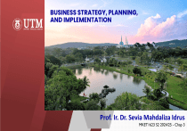 BUSINESS STRATEGY, PLANNING, AND IMPLEMENTATION Prof. Ir. Dr. Sevia Mahdaliza Idrus MKET1623 S2 2024/25 - Chap 3 References: Morse & Babcock Chap3 Robbins & Coulter Chap8 Planning Means LOOKING AHEAD Tun Mahathir Mohamad What is Planning? Planning: • Entrepreneurs function involves setting goals, establishing strategies for achieving those goals, and developing plans to integrate and coordinate business activities • Provides method for identifying objectives • Design sequence of programs and activities to achieve objectives Formal planning • Specific, time-oriented goals • Goals written and shared Effective Planning • Plan to plan • People implementing plan should be involved in preparing plan Why Do Entrepreneurs Plan? • Provides business direction • Reduces uncertainty • Minimizes waste and risks • Establishes the goals and standards for controlling 1 What must be done? 2 Questions for Entreprenuer How will it be done? When must it be done? 4 Why Do Entrepreneur Plan 5 6 7 8 How much will it cost? What is the problem & purpose? How to establish Goal & Objectives? How to satisfied Client? What is the business success criteria Planning and Performance • Formal planning is associated with positive financial results • Quality of planning/implementation more important than the extent of it • External factors can reduce the impact of planning on performance • Planning-performance relationship seems to be influenced by the planning time frame Types of Plans The most popular ways to describe organizational plans. (Fig 8-1, Robbins & Coulter) STRATEGIC PLANS plans that apply to the company and establish the company’s overall goals OPERATIONAL PLANS LONG TERM PLANS plans that encompass a particular operational area of the company plans with a time frame beyond three years SHORT TERM PLANS plans covering one year or less SPECIFIC PLANS plans that are clearly defined and leave no room for interpretation DIRECTIONAL PLANS plans that are flexible and set out general guidelines SINGLE USE PLANS a one-time plan specifically designed to meet the needs of a unique situation STANDING PLANS ongoing plans that provide guidance for activities performed repeatedly The Foundation for Planning Missio 1 n INFOGRAPHIC Purpose or Goal All Customer Driven 2 INFOGRAPHIC INFOGRAPHIC 3 Strategies 4 Objectives With Captain Izham, GCEO Malaysia Airlines promoting IUSB services Strategic Planning…… what’s this all about? • How a company meets its needs and objectives • Strategy helps to: – Establish priorities – Choose actions – Create a plan – Allocate resources – Be proactive What is a strategic plan? • A document that says why a company exists, what it aims to do, and how it will do it • It helps to focus the company’s vision and priorities • Suggests ways (strategies) to identify and to move toward desired future states • Consists of the process of developing and implementing plans to reach goals and objectives Strategic planning does not… • Predict the future • Replace good leadership and judgment • Follow a smooth, straightforward process A strategic plan is a living document — you can adapt it as needed! Assess organization Develop vision and mission Monitor and evaluate Implement Developing Strategic Planning Write it all down! Agree on priorities Assess environment Keys To Effective Strategic Planning • Focus only on the most important issues • Be willing to question • Produce a document Where do we want to go? The Vision What community do we dream of? What do we want to achieve? What do we want to be? VISION A Vision Statement describes the desired future position of the company or organization. MISSION A Mission Statement defines the company's business or organization purposes, its objectives and its approach to reach those objectives. Elements of Mission and Vision Statements are often combined to provide a statement of the company’s or organization’s purposes, goals and values. https://www.utm.my/about/vision-mission/ Strategic Planning Cycle Assessing Our Environment Internal External Setting Priorities How can we be most effective? How do we use our strengths to take advantage of opportunities? SWOT How do we use our strengths to make us less vulnerable to threats? How do we overcome our weaknesses to take advantage of opportunities? How do we overcome the weaknesses that make us vulnerable to threats? Our Reason for Being • Communicate to the world what your company do and why • Different from goals or objectives • Balance the head and the heart—inspire! How to conduct a SWOT Analysis for your own Vision and Mission. Difficult to do LATER How? Easy to do Impact-Effort Grid… for Goal Setting Now Wow! Low impact High impact Goals vs. Objectives Goal Objective • A greater purpose • A long-term outcome • May not be easy to measure • A specific, short-term action that will contribute to achieving a goal • Must be measurable [Example: to market iSmarUrus Sdn Bhd consultation services to all GLCs.] [Example: Create a website with accurate and current information about iSmartUrus Sdn Bhd expertise.] Well Written Goal Characteristics Written in terms of outcomes rather than actions Measurable and quantifiable Clear as to a time frame Challenging yet attainable Written down Communicated to all necessary business partners SMART Objectives Specific – Who? What? Where? How? Measurable – How many? How can this be measured? Achievable – Is it possible? Realistic – Is it possible given our time and resources available? Timebound – When? Each objective should be written in precise terms that leave no room for misinterpretation. Goals vs. Objectives Planning Objective Planning Goal Statement More detailed goal statement Clarifies goal How do we go about it? Consistent with business Gives purpose and direction Used as continual point of reference for questions regarding scope or purpose Goal Develop Goal Why? Wha