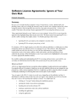 Software License Agreements: Ignore at Your Own Risk Edward Desautels Summary By now you’ve heard all about computer viruses, Trojan horses, worms, identity theft, and phishing scams, and you’re taking the necessary steps to secure your computer and privacy when using the internet. One boring little item, however, can undo your good work—if you’re not careful. That item is the end user license agreement (EULA) covering the software you use. These agreements themselves can’t harm you or your computer. In fact, EULAs can do just the opposite: they highlight things that can put you at risk. The harm comes from ignoring EULAs— and the subtle warnings they might contain—by blindly agreeing to their terms: • Ignoring EULAs can expose your computer to security risks. • Ignoring EULAs can put your privacy at risk. For instance, a EULA might require you to allow the software publisher or a third party to collect information about your internet activity in exchange for use of the software. This information could include not only the web sites you visit, but also information you supply in online transactions, such as your name, address, credit card number, and items purchased. Once collected, the security of this information is out of your control (a fact highlighted by the number of recent, high-profile database attacks). By carefully reading and understanding the EULA covering software before you install it, you can make an informed decision that takes into account any privacy and security issues. What is a EULA? A EULA is a legal contract between you and the software publisher. It spells out the terms and conditions for using the software. For instance, it might say you can only install the software on one computer for your personal use, a fairly common stipulation. However, it might also say that by using the software you agree to third-party monitoring or to allowing other users to access parts of your computer. You can agree to the EULA’s terms in several ways, depending on the publisher and how it distributes its software. Some of the ways you can “agree” may surprise you, however, because they don’t look or feel anything like signing a contract. You might agree by • clicking an “I accept” button during the installation process • opening the shrink wrap software packaging • breaking the seal on the software CD • mailing a registration card to the software publisher • installing the application • using the application 1 US-CERT End-User License Agreements: Security and Privacy Implications You can refuse to accept the terms and conditions of the EULA, but then you can’t legally use the software. Why EULAs are Important EULAs can include a number of items you should seriously consider before installing the software. In general, you should note the following facts about EULAs: • EULAs are legally binding. Some consumer advocates have challenged the legality of EULAs, especially long agreements clouded in complicated “legalese.” The advocates argue these EULAs are a strategy for discouraging careful review and hiding controversial terms and conditions. However, a number of influential court decisions have upheld the legality of EULAs, so you need to assume you’re entering into legal agreements when you accept their terms. • EULAs restrict how you can use the software. EULAs often include clauses that limit the number of computers you can load the software on. They sometimes also prohibit reverse engineering for the purpose of creating compatible software. In some cases they prohibit software testing and even publishing the results of this testing. • EULAs may force you to agree to certain conditions when using the software. Many software bundles force you to use all bundled components, including software produced by third-party publishers. They may also require you to agree to monitoring of your internet activity and/or sharing your computer’s resources. • EULAs can limit your ability to sue for damages. Most EULAs include a clause that says you cannot sue the publisher for any damages caused by using the software. The above items are detailed in the section “A Closer Look: EULAs, Security, and Privacy.” What to Look Out For Because software EULAs can impose terms and conditions that affect your online security and privacy, you should carefully consider what you’re willing to allow in exchange for the use of the software. You should be particularly concerned about EULAs that • allow the software publisher or third parties to monitor your internet activity • allow the software publisher or third parties to collect your personal information • allow the software publisher or third parties to use your computing resources • hold you to the terms of EULAs governing third-party software components What You Should Do The following list presents recommendations for protecting yourself from the security and privacy problems associated with EULAs. These recommendations are explained in detail in the section “What You Can Do to Protect Yourself.” 2 US-CERT End-User License Agreements: Security and Privacy Implications • Read the EULA before you install the software. It can be painfully boring reading, but this is the only way to know exactly what privacy and security risks you might be taking by agreeing to the EULA’s terms. • Consider the software publisher. If you don’t know about the publisher or if you have any question about its integrity, review the EULA covering its software with extra care. • Beware of firewall prompts when installing software. Firewall prompts asking you to allow certain traffic to pass may be cause for concern. Review the EULA to find out why this traffic must be allowed and whether you wish to allow it. • Beware of “free” software, especially peer-to-peer (P2P) file-sharing software. Rarely is anything truly free. Review the EULA to find out what you need to do or allow in exchange for u