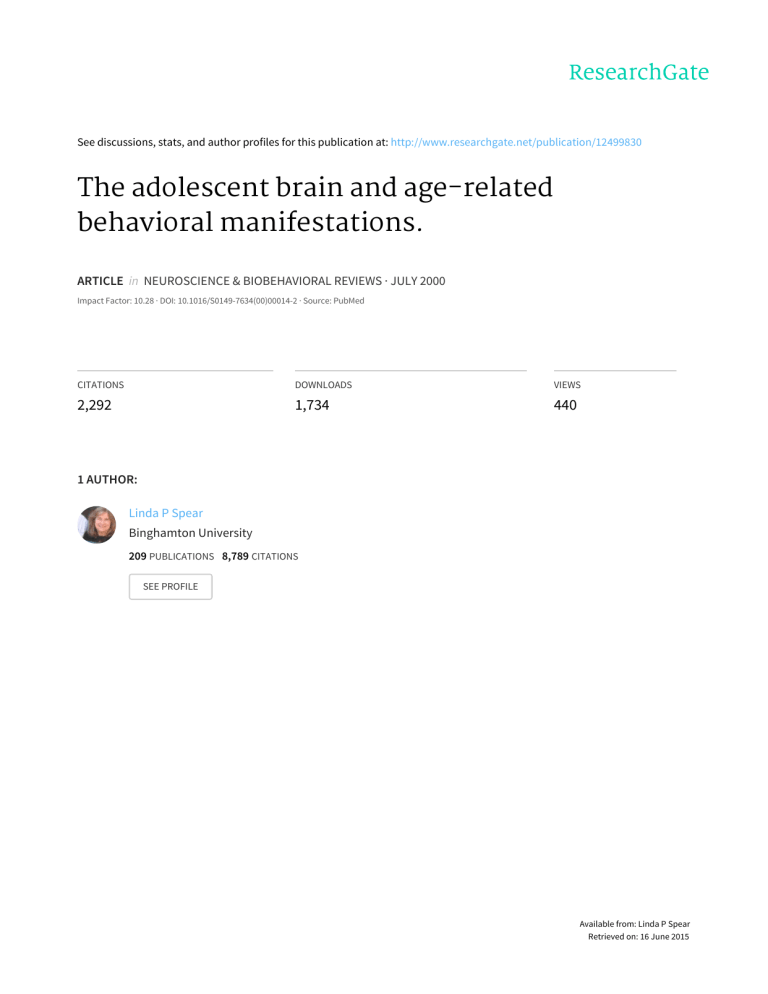 See discussions, stats, and author profiles for this publication at: http://www.researchgate.net/publication/12499830 The adolescent brain and age-related behavioral manifestations. ARTICLE in NEUROSCIENCE & BIOBEHAVIORAL REVIEWS · JULY 2000 Impact Factor: 10.28 · DOI: 10.1016/S0149-7634(00)00014-2 · Source: PubMed CITATIONS DOWNLOADS VIEWS 2,292 1,734 440 1 AUTHOR: Linda P Spear Binghamton University 209 PUBLICATIONS 8,789 CITATIONS SEE PROFILE Available from: Linda P Spear Retrieved on: 16 June 2015 NEUROSCIENCE AND BIOBEHAVIORAL REVIEWS PERGAMON Neuroscience and Biobehavioral Reviews 24 (2000) 417–463 www.elsevier.com/locate/neubiorev The adolescent brain and age-related behavioral manifestations L.P. Spear* Department of Psychology and Center for Developmental Psychobiology, Binghamton University, Binghamton, NY 13902-6000, USA Received 11 May 1999; received in revised form 27 January 2000; accepted 2 February 2000 Abstract To successfully negotiate the developmental transition between youth and adulthood, adolescents must maneuver this often stressful period while acquiring skills necessary for independence. Certain behavioral features, including age-related increases in social behavior and risk-taking/novelty-seeking, are common among adolescents of diverse mammalian species and may aid in this process. Reduced positive incentive values from stimuli may lead adolescents to pursue new appetitive reinforcers through drug use and other risk-taking behaviors, with their relative insensitivity to drugs supporting comparatively greater per occasion use. Pubertal increases in gonadal hormones are a hallmark of adolescence, although there is little evidence for a simple association of these hormones with behavioral change during adolescence. Prominent developmental transformations are seen in prefrontal cortex and limbic brain regions of adolescents across a variety of species, alterations that include an apparent shift in the balance between mesocortical and mesolimbic dopamine systems. Developmental changes in these stressor-sensitive regions, which are critical for attributing incentive salience to drugs and other stimuli, likely contribute to the unique characteristics of adolescence. 䉷 2000 Elsevier Science Ltd. All rights reserved. Keywords: Adolescence; Brain; Behavior; Stress; Hormones; Mesocorticolimbic dopamine; Prefrontal cortex; Risk taking; Social behavior; Puberty; Drug abuse; Alcohol 1. Introduction The central thesis of this review is that maturational changes in brain contribute to the age-specific behavioral characteristics of adolescence, including an increase in propensity to use drugs. Certain behavioral features common among adolescents of a variety of species may have evolved to promote attainment of the necessary skills for independence; these age-related behaviors, such as an adolescent-associated increase in risk taking, may be promoted less by increases in pubertal hormones than by developmental events occurring in brain during adolescence. These age-related neural alterations provide a partial biological basis for the unique behavioral strategies of adolescence, although they are not deterministic. Rather, these transient neuronal features may predispose adolescents to behave in particular ways, and make them particularly likely to initiate use of alcohol and other drugs relative to individuals at other ages. 1.1. Adolescence versus puberty more temporally restricted phase of puberty. Although the timing of these periods overlap, the terms are not synonymous. Puberty refers to the attainment of sexual maturation (i.e. gonadarche) [210]. In contrast, adolescence is the gradual period of transition from childhood to adulthood, and thus is a process or series of “soft events” [422] rather being defined by a discrete event or events. As such, it is difficult to characterize the precise onset and offset of adolescence. Although “one may define puberty in specific neuroendocrinological terms,…adolescence is, of its essence, a period of transitions rather than a moment of attainment” ([468], p. 63). Puberty is but one of these adolescent transitions. In humans, the onset of the biological changes associated with puberty often has been considered to signal the onset of adolescence (e.g. Ref. [409]), although the timing of puberty within the adolescent period varies notably among human adolescents (e.g. Ref. [144]). Indeed, the timing and tempo of puberty may be of considerably psychosocial significance for adolescent humans, with early maturation advantageous in several respects for boys but associated with several negative outcomes for girls (see Ref. [212] for review and references). The focus of this review is on adolescence rather than the 1.2. Animal models of adolescence * Tel.: ⫹ 1-607-777-2825; fax: ⫹ 1-607-777-6418. E-mail address: lspear@binghamton.edu (L.P. Spear). 0149-7634/00/$ - see front matter 䉷 2000 Elsevier Science Ltd. All rights reserved. PII: S0149-763 4(00)00014-2 Developing mammals of many species undergo an 418 L.P. Spear / Neuroscience and Biobehavioral Reviews 24 (2000) 417–463 ontogenetic transition from the dependence of youth to the (relative) independence of adulthood. During this transition, individuals across a variety of species undergo puberty and are faced with similar developmental challenges of acquiring the necessary skills to permit survival away from parental caretakers. As discussed later in this review, human adolescents and many of their counterparts in other species exhibit certain characteristic behaviors, including increases in peer-directed social interactions and elevations in novelty-seeking and risk-taking behaviors. These transient behavioral features may represent ontogenetic adaptations [391] to help adolescents survive in the limbo between childhood and adulthood, while also serving to assist them in acquiring the necessary skills to permit survival away from parental caretakers. Increased af