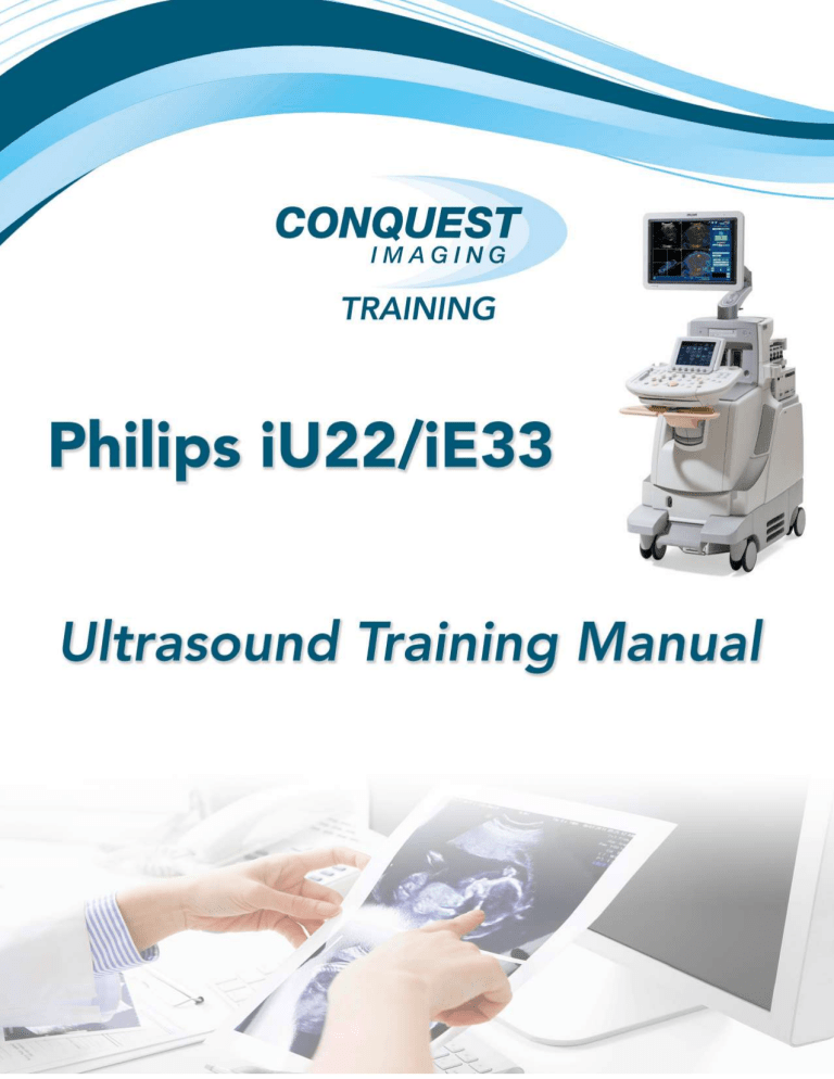TABLE OF CONTENTS THEORY OF OPERATION 1 OPERATIONAL TESTING 2 HARDWARE ACCESS 3 ADJUSTMENTS 4 PREVENTATIVE MAINTENANCE 5 TROUBLESHOOTING 6 DICOM OPTIONS 7 PARTS LIST 8 SYSTEM BLOCK DIAGRAMS Conquest Imaging Ultrasound Sales Service Repair Training 1815 Industrial Drive, Suite 100 Stockton, CA 95206 PH: 209-942-2654 FAX: 209-942-2572 Rev3 070208.dms Appendix A: -3- This Page Intentionally Left Blank Conquest Imaging Ultrasound Sales Service Repair Training 1815 Industrial Drive, Suite 100 Stockton, CA 95206 PH: 209-942-2654 FAX: 209-942-2572 Rev3 070208.dms -4- iU22/iE33™ Chapter 1 Theory of Operation Conquest Imaging Ultrasound Sales Service Repair Training 1815 Industrial Drive, Suite 100 Stockton, CA 95206 PH: 209-942-2654 FAX: 209-942-2572 Rev3 070208.dms -5- This Page Intentionally Left Blank Conquest Imaging Ultrasound Sales Service Repair Training 1815 Industrial Drive, Suite 100 Stockton, CA 95206 PH: 209-942-2654 FAX: 209-942-2572 Rev3 070208.dms -6- iU22/iE33™ Theory of Operation Operating System The operating system used on the Host and the Signal and Image-Processing (SIP) motherboards is Microsoft Windows XP Embedded (XP-E). The embedded XP version allows customization of components and system behavior. Much of the operating system is hidden from the user, as the Philips applications use XP-E as a vehicle for implementing system behavior through custom graphical user interfaces (GUI). The operating system on the host is primarily used for system interaction with the user or network and as an application platform for implementing the iU22 operation and behavior. The SIP operating system is configured for headless operation (no graphics subsystem). The primary functions of the SIP operating system include: Process estimate data to native format data (scan converted but not scaled to display size) Process estimate data flow components to sweeping display data and digital Doppler audio Process estimate data to M-mode sweeping display data Implement the Cineloop function for save/recall/review System Functional Architecture The Applications layer comprises software to perform administrative functions and miscellaneous non-imaging tasks necessary to operate the ultrasound system. The Virtual Ultrasound System comprises all proprietary technologies developed by Philips that are involved in ultrasound imaging and the related physiological signals. These include hardware, firmware, and software. The Platform layer comprises the hardware and infrastructure required to run the applications and virtual ultrasound systems. Conquest Imaging Ultrasound Sales Service Repair Training 1815 Industrial Drive, Suite 100 Stockton, CA 95206 PH: 209-942-2654 FAX: 209-942-2572 Rev3 070208.dms -7- Signal Flow Ultrasound data (RF) is acquired from each transducer element and beamformed (summed) into a coherent data stream. This RF data stream is moved over the RF bus between the Front-End Controller (FEC) and the Host resident Dual Signal Conditioning (DSC) PCB. The DSC processes the RF data to estimate space data, commonly referred to as R-Theta data. This estimate data (2D, Doppler, and so on.) is sent to the SIP Motherboard to be further processed into each final display data type supported by the system (2D, 3D, 4D, Doppler, Audio, M-mode, and so on). The SIP Motherboard stores these data types locally in the SIP hard drive sub-system (Cineloop images). From Cineloop images, this data is time-aligned by a streaming data manager application and provided to Frame Composition processing for composite image display and real-time annotation. Frame Composition uses the Host AGP card to compose each image element into a composite display containing image, text and graphical elements. Conquest Imaging Ultrasound Sales Service Repair Training 1815 Industrial Drive, Suite 100 Stockton, CA 95206 PH: 209-942-2654 FAX: 209-942-2572 Rev3 070208.dms -8- Conquest Imaging Ultrasound Sales Service Repair Training 1815 Industrial Drive, Suite 100 Stockton, CA 95206 PH: 209-942-2654 FAX: 209-942-2572 Rev3 070208.dms -9- Scanhead Select V D External Network CP/UIF Modem Acquisition Subsystem Channel Boards AIM+ FEC D DVD drive Motor Control Hard Drive iU 22 Basic Block Diagram Acquisition Front Plane RFB RFA AVIO CAD DSC Hard Drives SIP Dolphin Dolphin PCI Bus - 32 Bit PCI Bus - 64 Bit HOST AVIO RIP IEP AGP USB Display OEMs Power Subsystem Note: The power subsystem used on initially released systems is designated for “A.x systems.” The subsequently released power subsystem is designated for “B.0 systems.” Release A.x and B.0 systems are identified by a green or blue LED, respectively, on the rear of the AC Tray. Power Subsytem (A.x Systems) The A.x power subsystem contains: Platform Power Supply (PPS) Platform Power Distribution Board (PPDB) • Acquisition Power Supply (APS) AC Tray HV Switcher (used on A.x and B.0 systems) Power enters the iU22 system via the AC receptacle, located on the AC Tray. The AC Tray includes an EMI filter, circuit breaker, OEM isolation transformer and OEM power relay. AC voltage is also routed to both custom power supplies (Acquisition and Platform). The Power Subsystem is controlled by the On/Standby switch, located next to the DVD drive. The On/Standby switch, in conjunction with the Host Motherboard power control circuitry generates a PS_ON# signal, which activates the two system power supplies. The power supplies are interlocked, which controls voltage application during power up. The Acquisition and Platform supplies contain monitoring hardware, which prevent sustained over- or under-voltage or over-current conditions. If one of the supplies does not meet specification, the Power Subsystem shuts down.This condition requires the AC mains to be disconnected for at least one minute to discharge the power supply internal voltages and reset the fault circuitry. There are no power supply adjustments. The power supplies are factory set and sealed. Conquest Imaging Ultrasound Sale