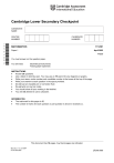 Cambridge Lower Secondary Checkpoint *2912725807* MATHEMATICS 1112/01 Paper 1 April 2022 1 hour You must answer on the question paper. You will need: Geometrical instruments Tracing paper (optional) INSTRUCTIONS • Answer all questions. • Use a black or dark blue pen. You may use an HB pencil for any diagrams or graphs. • Write your name, centre number and candidate number in the boxes at the top of the page. • Write your answer to each question in the space provided. • Do not use an erasable pen or correction fluid. • Do not write on any bar codes. • You should show all your working in the booklet. • You are not allowed to use a calculator. INFORMATION • The total mark for this paper is 50. • The number of marks for each question or part question is shown in brackets [ ]. This document has 16 pages. Any blank pages are indicated. IB22 05_1112_01/6RP © UCLES 2022 [Turn over 2 1 (a) Complete the table of values for y = 2x + 3 x 0 y 3 1 2 3 4 7 [1] (b) Draw the graph of y = 2x + 3 y 12 11 10 9 8 7 6 5 4 3 2 1 0 2 1 2 3 4 5 6 x [2] Chen has three pieces of metal. The masses are 6 kg, 3.3 kg and 0.75 kg. Work out the total mass, in kilograms. kg © UCLES 2022 1112/01/A/M/22 [1] 3 3 Write out 3 as a decimal. 5 [1] 4 The diagram shows a straight line crossing two parallel lines. There are no right angles in the diagram. NOT TO SCALE BC A D F G EH Tick ( ) to show if each of these statements are true or false. True False Angle A is the same size as angle E. Angle C is the same size as angle H. Angle A and angle F are alternate angles. [1] 5 Work out the value of 49 + 6 2 [1] © UCLES 2022 1112/01/A/M/22 [Turn over 4 6 Complete these fraction calculations. (a) 2 1 – = 3 4 12 [1] (b) 8 + 5 19 = 24 12 [1] (c) 2 + 1 = 13 20 [1] © UCLES 2022 1112/01/A/M/22 5 7 Samira is measuring the capacity of a fish tank. Draw a ring around the most suitable unit for this measurement. mm³ m³ l ml [1] 8 The table shows some statistics for the number of words per page in two different books. Mean Range Book A 19.2 8 Book B 18.6 11 Complete the sentences using two words from the list. A Book B means has a more consistent number of words per page. We know this from comparing the © UCLES 2022 ranges . 1112/01/A/M/22 [1] [Turn over 6 9 Angelique has 12 sweets. Mia has 3 more sweets than Angelique. Oliver has 5 less sweets than Mia. Find how many sweets they have altogether. [1] 10 a = 3b – c Find the value of a when b = 11 and c = 4 a = [1] 11 Here is a sequence of numbers. 80, 40, 20, 10… Find the term-to-term rule for this sequence. [1] © UCLES 2022 1112/01/A/M/22 7 12 Triangle B is drawn on the grid. y 6 5 4 3 2 1 –6 –5 –4 –3 –2 –1 0 –1 –2 –3 1 2 3 4 5 6 x B –4 –5 –6 –7 –8 –9 Triangle A is translated 3 right and 5 down to give triangle B. Draw and label triangle A on the grid. © UCLES 2022 [2] 1112/01/A/M/22 [Turn over 8 13 Simplify these expressions. 9x + 2y − 4x − 8y 3 + 2(5x − 6) [3] 14 Mike throws an ordinary 6-sided dice and spins a coin at the same time. One possible outcome is a 4 and a tail. Work out the total number of possible outcomes. [1] © UCLES 2022 1112/01/A/M/22 9 15 A group of people each complete two puzzles, A and B. The time taken for each person to complete the puzzles is recorded. The results are shown on the graphs. The scales on each graph are the same. Number of people Number of people 0 0 Time taken to complete puzzle A Time taken to complete puzzle B Complete the sentence. The graphs show that puzzle is more difficult because [1] 16 Write 31.4649 (a) correct to two decimal places, [1] (b) correct to one significant figure. [1] 17 The area of a rectangle is 30 cm2. Work out this area in mm2. mm2 © UCLES 2022 1112/01/A/M/22 [1] [Turn over 10 18 A bag contains some counters. Each counter is either red or green or yellow or blue. A counter is taken from the bag at random. The table shows the probabilities of taking a red counter, a green counter and a yellow counter. Colour Red Green Yellow Probability 0.25 0.5 0.15 Blue Tick () to show if each of these statements is true, false or whether you cannot tell. True False Cannot tell One quarter of the counters in the bag are red. The bag contains 100 counters altogether. The bag contains more blue counters than yellow. t [2] 19 Here is a five-digit number with one digit missing. 3__567 The five-digit number is a multiple of 9 Work out the missing digit. [1] © UCLES 2022 1112/01/A/M/22 11 20 Here are the heights, h metres, of 15 students in Mia’s class. 1.56 1.49 1.05 1.75 1.63 1.47 1.25 1.16 1.45 1.29 1.40 1.02 1.67 1.72 1.93 Use the data to complete the group, tally and frequency columns in the table. All group intervals must have equal width. Group 1.00 1.80 < h ≤ < h ≤ < h ≤ < h ≤ < h ≤ Tally Frequency 1.20 2.00 [2] 21 Draw a line to match each calculation to the correct value. 74 70 × 72 73 70 × 70 72 76 ÷ 72 7 2 7 ×7 1 [2] © UCLES 2022 1112/01/A/M/22 [Turn over 12 22 The area of a piece of land is 4.5 hectares. Convert 4.5 hectares into square metres. m2 [1] 23 Solve these simultaneous equations. 5x + 2y = 26 10x – y = 37 Use an algebraic method to work out your answer. x= y= © UCLES 2022 1112/01/A/M/22 [3] 13 24 Calculate. (a) 4.52 × 22 [2] (b) 28 × 16 + 14 × 16 14 [2] © UCLES 2022 1112/01/A/M/22 [Turn over 14 25 Here is a number fact. 5478 × 64 = 350 592 Use this to work out 54.78 × 6.4 3505.92 ÷ 64 [2] 26 Naomi uses three lines to make a pattern by connecting dots on a grid. The pattern has rotational symmetry but no line symmetry. Use three lines to make a pattern with rotational symmetry and line symmetry. [1] © UCLES 2022 1112/01/A/M/22 15 27 Work out. 72 × 105 × 10−6 [1] 28 The diagram shows a regular pentagon and a regular hexagon. NOT TO SCALE E A B C D A, B and E are vertices of the pentagon. C, D and E are vertices of the hexagon. ABCD is a straight line. Calculate the size of angle BEC. ° [3] © UCLES 2022 1112/01/A/M/22 [Turn o