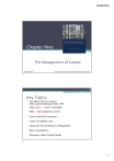 09/08/2020 Chapter Nine The Management of Capital McGraw-Hill/Irwin Copyright © 2010 by The McGraw-Hill Companies, Inc. All rights reserved. 1 15-2 Key Topics • The Many Tasks of Capital • CAR: Capital Adequacy Ratio 10% • CAR=(Tier1 + Tier2)/Total RWA • RWA = Risk-Weighted-Assets • Capital and Risk Exposures • Types of Capital In Use • Capital as the Centerpiece of Regulation • Basel I and Basel II • Planning to Meet Capital Needs McGraw-Hill/Irwin Bank Management and Financial Services, 7/e © 2008 The McGraw-Hill Companies, Inc., All Rights Reserved. 2 1 09/08/2020 3 CAR: Capital Adequacy Ratio CAR=(Tier1 + Tier2)/Total RWA Tier1= Equity + Surplus equity + Retained earning Total RWA= Total On-Balance + Total Off-Balance Total RWA on-balance= Asseti x Risk-Weighti Thông tư 36/NHNN/2014 McGraw-Hill/Irwin Bank Management and Financial Services, 7/e © 2008 The McGraw-Hill Companies, Inc., All Rights Reserved. 3 15-4 Tasks Performed By Capital • Provides a Cushion Against Risk of Failure • Provides Funds to Help Institutions Get Started • Promotes Public Confidence (credit crisis 2007-2009 showed importance) • Provides Funds for Growth • Regulator of Growth • Role in Growth of Bank Mergers • Regulatory Tool to Limit Risk Exposure • Protects the Government’s Deposit Insurance System McGraw-Hill/Irwin Bank Management and Financial Services, 7/e © 2008 The McGraw-Hill Companies, Inc., All Rights Reserved. 4 2 09/08/2020 15-5 Key Risks in Financial Institutions Management • Credit Risk ▫ Probability of default on any promised payments of interest or principal or both • Liquidity Risk ▫ Probability of being unable to raise cash when needed at reasonable cost • Interest Rate Risk ▫ Probability that changes in interest rates will adversely affect the value of net worth • Operational Risk ▫ Probability of adverse affect of earnings due to failures in computer systems, management errors, etc. • Exchange Risk ▫ Probability of loss due to fluctuating currency prices • Crime Risk McGraw-Hill/Irwin Bank Management and Financial Services, 7/e © 2008 The McGraw-Hill Companies, Inc., All Rights Reserved. ▫ Due to embezzlement, robbery, fraud, identity theft 5 15-6 Defenses Against Risk • Quality Management • Diversification ▫ Geographic ▫ Portfolio • Deposit Insurance (increased from $100K to $250K in the Fall of 2008 through Dec 2009) • Owners’ Capital McGraw-Hill/Irwin Bank Management and Financial Services, 7/e © 2008 The McGraw-Hill Companies, Inc., All Rights Reserved. 6 3 09/08/2020 15-7 Types of Capital • Common Stock • Preferred Stock • Surplus • Undivided Profits • Equity Reserves McGraw-Hill/Irwin Bank Management and Financial Services, 7/e • Subordinated Debentures • Minority Interest in Consolidated Subsidiaries • Equity Commitment Notes © 2008 The McGraw-Hill Companies, Inc., All Rights Reserved. 7 15-8 Relative Importance of Different Sources of Capital McGraw-Hill/Irwin Bank Management and Financial Services, 7/e © 2008 The McGraw-Hill Companies, Inc., All Rights Reserved. 8 4 09/08/2020 15-9 Reasons for Capital Regulation The underlying assumption is that the private marketplace does not correctly price the impact of systemic failures. Thus, the purpose of capital regulation is: • To Limit the Risk of Failures • To Preserve Public Confidence • To Limit Losses to the Federal Government Arising from Deposit Insurance Claims McGraw-Hill/Irwin Bank Management and Financial Services, 7/e © 2008 The McGraw-Hill Companies, Inc., All Rights Reserved. 9 15-10 The Basel Agreement on International Capital Standards An International Treaty Involving the U.S., Canada, Japan and the Nations of Western Europe to Impose Common Capital Requirements On All Banks Based in Those Countries McGraw-Hill/Irwin Bank Management and Financial Services, 7/e © 2008 The McGraw-Hill Companies, Inc., All Rights Reserved. 10 5 09/08/2020 15-11 Quick Quiz • What forms of capital are in use today? What are the key differences between the different types of capital? • What are the most important and least important forms of capital held by U.S.-insured banks? How do small banks differ from large banks in the composition of their capital accounts and in the total volume of capital they hold relative to their assets? • What is the rationale for having the government set capital standards for financial institutions as opposed to letting the private marketplace set those standards? McGraw-Hill/Irwin Bank Management and Financial Services, 7/e © 2008 The McGraw-Hill Companies, Inc., All Rights Reserved. 11 15-12 The Basel Agreement • Historically, the minimum capital requirements for banks were independent of the riskiness of the bank ▫ Prior to 1990, banks were required to maintain: a primary capital-to-asset ratio of at least 5% to 6%, and a minimum total capital-to-asset ratio of 6% • The Basel Agreement of 1988 includes riskbased capital standards for banks in 12 industrialized nations; designed to: ▫ Encourage banks to keep their capital positions strong ▫ Reduce inequalities in capital requirements between countries ▫ Promote fair competition ▫ Account for financial innovations (OBS, etc.) McGraw-Hill/Irwin Bank Management and Financial Services, 7/e © 2008 The McGraw-Hill Companies, Inc., All Rights Reserved. 12 6 09/08/2020 15-13 The Basel Agreement • A Bank’s Minimum Capital Requirement is Linked to its Credit Risk ▫ The greater the credit risk, the greater the required capital • Stockholders' equity is deemed to be the most valuable type of capital • Minimum capital requirement increased to 8% total capital to risk-adjusted assets • Capital requirements were approximately standardized between countries to ‘level the playing field‘ • Capital is divided into Two Tiers McGraw-Hill/Irwin Bank Management and Financial Services, 7/e © 2008 The McGraw-Hill Companies, Inc., All Righ