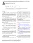 This international standard was developed in accordance with internationally recognized principles on standardization established in the Decision on Principles for the Development of International Standards, Guides and Recommendations issued by the World Trade Organization Technical Barriers to Trade (TBT) Committee. Designation: E1444/E1444M − 22a Standard Practice for Magnetic Particle Testing for Aerospace1 This standard is issued under the fixed designation E1444/E1444M; the number immediately following the designation indicates the year of original adoption or, in the case of revision, the year of last revision. A number in parentheses indicates the year of last reapproval. A superscript epsilon (´) indicates an editorial change since the last revision or reapproval. This standard has been approved for use by agencies of the U.S. Department of Defense. 1.6 This standard does not purport to address all of the safety concerns, if any, associated with its use. It is the responsibility of the user of this standard to establish appropriate safety, health, and environmental practices and determine the applicability of regulatory limitations prior to use. 1.7 This international standard was developed in accordance with internationally recognized principles on standardization established in the Decision on Principles for the Development of International Standards, Guides and Recommendations issued by the World Trade Organization Technical Barriers to Trade (TBT) Committee. 1. Scope* 1.1 This practice establishes minimum requirements for magnetic particle testing used for the detection of surface or slightly subsurface discontinuities in ferromagnetic material. This practice is intended for aerospace applications using the wet fluorescent method. Refer to Practice E3024/E3024M for industrial applications. Guide E709 can be used in conjunction with this practice as a tutorial. NOTE 1—This practice replaces MIL-STD-1949. 1.2 The magnetic particle testing method is used to detect cracks, laps, seams, inclusions, and other discontinuities on or near the surface of ferromagnetic materials. Magnetic particle testing may be applied to raw material, billets, finished and semi-finished materials, welds, and in-service parts. Magnetic particle testing is not applicable to non-ferromagnetic metals and alloys such as austenitic stainless steels. See Appendix X1 for additional information. 2. Referenced Documents 2.1 The following documents form a part of this practice to the extent specified herein. 2.2 ASTM Standards:2 E543 Specification for Agencies Performing Nondestructive Testing E709 Guide for Magnetic Particle Testing E1316 Terminology for Nondestructive Examinations E2297 Guide for Use of UV-A and Visible Light Sources and Meters used in the Liquid Penetrant and Magnetic Particle Methods E3022 Practice for Measurement of Emission Characteristics and Requirements for LED UV-A Lamps Used in Fluorescent Penetrant and Magnetic Particle Testing E3024/E3024M Practice for Magnetic Particle Testing for General Industry 1.3 Portable battery powered electromagnetic yokes are outside the scope of this practice. 1.4 All areas of this practice may be open to agreement between the cognizant engineering organization and the supplier, or specific direction from the cognizant engineering organization. 1.5 This standard is a combined standard, an ASTM standard in which rationalized SI units and inch-pound units are included in the same standard, with each system of units to be regarded separately as standard. 1.5.1 Units—The values stated in either SI units or inchpound units are to be regarded separately as standard. The values stated in each system are not necessarily exact equivalents; therefore, to ensure conformance with the standard, each system shall be used independently of the other, and values from the two systems shall not be combined. 2.3 ASNT Documents:3 SNT-TC-1A Personnel Qualification and Certification in Nondestructive Testing ANSI/ASNT CP-189 Standard for Qualification and Certification of NDT Personnel 1 This practice is under the jurisdiction of ASTM Committee E07 on Nondestructive Testing and is the direct responsibility of Subcommittee E07.03 on Liquid Penetrant and Magnetic Particle Methods. Current edition approved July 1, 2022. Published July 2022. Originally approved in 1991. Last previous edition approved in 2022 as E1444/E1444M – 22. DOI: 10.1520/E1444_E1444M-22A. 2 For referenced ASTM standards, visit the ASTM website, www.astm.org, or contact ASTM Customer Service at service@astm.org. For Annual Book of ASTM Standards volume information, refer to the standard’s Document Summary page on the ASTM website. 3 Available from American Society for Nondestructive Testing (ASNT), P.O. Box 28518, 1711 Arlingate Ln., Columbus, OH 43228-0518, http://www.asnt.org. *A Summary of Changes section appears at the end of this standard Copyright © ASTM International, 100 Barr Harbor Drive, PO Box C700, West Conshohocken, PA 19428-2959. United States 1 E1444/E1444M − 22a 2.4 SAE-AMS Documents:4,5 AMS 2175 Castings, Classification and Inspection of AMS 2641 Magnetic Particle Inspection Vehicle AMS 3044 Magnetic Particles, Fluorescent, Wet Method, Dry Powder AMS 3045 Magnetic Particles, Fluorescent, Wet Method, Oil Vehicle, Ready-To-Use AMS 3046 Magnetic Particles, Fluorescent, Wet Method, Oil Vehicle, Aerosol Packaged5 AMS 5355 Investment Castings AS 4792 Water Conditioning Agents for Aqueous Magnetic Particle Inspection AS 5282 Tool Steel Ring Standard for Magnetic Particle Inspection AS 5371 Reference Standards Notched Shims for Magnetic Particle Inspection SAE AMS-STD-595 Colors Used in Government Procurement 2.5 Federal Standard:4,6 FED-STD-313 Material Safety Data, Transportation Data and Disposal Data for Hazardous Materials Furnished to Government Activities 2.6 Military Standards:4,6 A-A-59230 Fluid, Magnetic Particle Inspection, Suspension MIL-STD-1949 Inspection, Magnetic Particle 