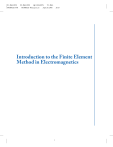 P1: IML/FFX MOBK021-FM P2: IML/FFX QC: IML/FFX MOBK021-Polycarpou.cls T1: IML April 29, 2006 20:15 Introduction to the Finite Element Method in Electromagnetics i P1: IML/FFX MOBK021-FM P2: IML/FFX QC: IML/FFX MOBK021-Polycarpou.cls T1: IML April 29, 2006 20:15 Copyright © 2006 by Morgan & Claypool All rights reserved. No part of this publication may be reproduced, stored in a retrieval system, or transmitted in any form or by any means—electronic, mechanical, photocopy, recording, or any other except for brief quotations in printed reviews, without the prior permission of the publisher. Introduction to the Finite Element Method in Electromagnetics Anastasis C. Polycarpou www.morganclaypool.com 1598290460 paper Polycarpou 1598290479 ebook Polycarpou DOI 10.2200/S00019ED1V01Y200604CEM004 A Publication in the Morgan & Claypool Publishers’ series SYNTHESIS LECTURES ON COMPUTATIONAL ELECTROMAGNETICS Lecture #4 First Edition 10 9 8 7 6 5 4 3 2 1 Printed in the United States of America ii P1: IML/FFX P2: IML/FFX MOBK021-FM QC: IML/FFX MOBK021-Polycarpou.cls T1: IML April 29, 2006 20:15 Introduction to the Finite Element Method in Electromagnetics Anastasis C. Polycarpou Intercollege, Cyprus SYNTHESIS LECTURES ON COMPUTATIONAL ELECTROMAGNETICS #4 M Mor gan & Cl aypool Publishers &C iii P1: IML/FFX MOBK021-FM P2: IML/FFX QC: IML/FFX MOBK021-Polycarpou.cls T1: IML April 29, 2006 20:15 To my parents, and to my wife and daughter iv P1: IML/FFX MOBK021-FM P2: IML/FFX QC: IML/FFX MOBK021-Polycarpou.cls T1: IML April 29, 2006 20:15 v ABSTRACT This series lecture is an introduction to the finite element method with applications in electromagnetics. The finite element method is a numerical method that is used to solve boundary-value problems characterized by a partial differential equation and a set of boundary conditions. The geometrical domain of a boundary-value problem is discretized using sub-domain elements, called the finite elements, and the differential equation is applied to a single element after it is brought to a “weak” integro-differential form. A set of shape functions is used to represent the primary unknown variable in the element domain. A set of linear equations is obtained for each element in the discretized domain. A global matrix system is formed after the assembly of all elements. This lecture is divided into two chapters. Chapter 1 describes one-dimensional boundaryvalue problems with applications to electrostatic problems described by the Poisson’s equation. The accuracy of the finite element method is evaluated for linear and higher order elements by computing the numerical error based on two different definitions. Chapter 2 describes two-dimensional boundary-value problems in the areas of electrostatics and electrodynamics (time-harmonic problems). For the second category, an absorbing boundary condition was imposed at the exterior boundary to simulate undisturbed wave propagation toward infinity. Computations of the numerical error were performed in order to evaluate the accuracy and effectiveness of the method in solving electromagnetic problems. Both chapters are accompanied by a number of Matlab codes which can be used by the reader to solve one- and twodimensional boundary-value problems. These codes can be downloaded from the publisher’s URL: www.morganclaypool.com/page/polycarpou This lecture is written primarily for the nonexpert engineer or the undergraduate or graduate student who wants to learn, for the first time, the finite element method with applications to electromagnetics. It is also targeted for research engineers who have knowledge of other numerical techniques and want to familiarize themselves with the finite element method. The lecture begins with the basics of the method, including formulating a boundary-value problem using a weighted-residual method and the Galerkin approach, and continues with imposing all three types of boundary conditions including absorbing boundary conditions. Another important topic of emphasis is the development of shape functions including those of higher order. In simple words, this series lecture provides the reader with all information necessary for someone to apply successfully the finite element method to one- and two-dimensional boundary-value problems in electromagnetics. It is suitable for newcomers in the field of finite elements in electromagnetics. P1: IML/FFX MOBK021-FM P2: IML/FFX QC: IML/FFX MOBK021-Polycarpou.cls T1: IML April 29, 2006 20:15 KEYWORDS Boundary-value problems (BVPs), Finite element method (FEM), Galerkin approach, Higher order elements, Linear elements, Numerical methods, Shape/interpolation functions, Weak formulation vi P1: IML/FFX MOBK021-FM P2: IML/FFX QC: IML/FFX MOBK021-Polycarpou.cls T1: IML April 29, 2006 20:15 vii Contents 1. One-Dimensional Boundary-Value Problems . . . . . . . . . . . . . . . . . . . . . . . . . . . . . . . . . . . 1 1.1 Introduction . . . . . . . . . . . . . . . . . . . . . . . . . . . . . . . . . . . . . . . . . . . . . . . . . . . . . . . . . . . . . 1 1.2 Electrostatic BVP and the Analytical Solution . . . . . . . . . . . . . . . . . . . . . . . . . . . . . . . 1 1.3 The Finite Element Method . . . . . . . . . . . . . . . . . . . . . . . . . . . . . . . . . . . . . . . . . . . . . . 3 1.4 Domain Discretization . . . . . . . . . . . . . . . . . . . . . . . . . . . . . . . . . . . . . . . . . . . . . . . . . . . . 5 1.5 Interpolation Functions . . . . . . . . . . . . . . . . . . . . . . . . . . . . . . . . . . . . . . . . . . . . . . . . . . . 5 1.6 The Method of Weighted Residual: The Galerkin Approach . . . . . . . . . . . . . . . . . 7 1.7 Assembly of Elements . . . . . . . . . . . . . . . . . . . . . . . . . . . . . . . . . . . . . . . . . . . . . . . . . . . 13 1.8 Imposition of Boundary Conditions . . . . . . . . . . . . . . . . . . . . . . . . . . . . . . . . . . . . . . . 19 1.8.1 Dirichlet Boundary Conditions . . . . . . . . . . . . . . . . . . . .
