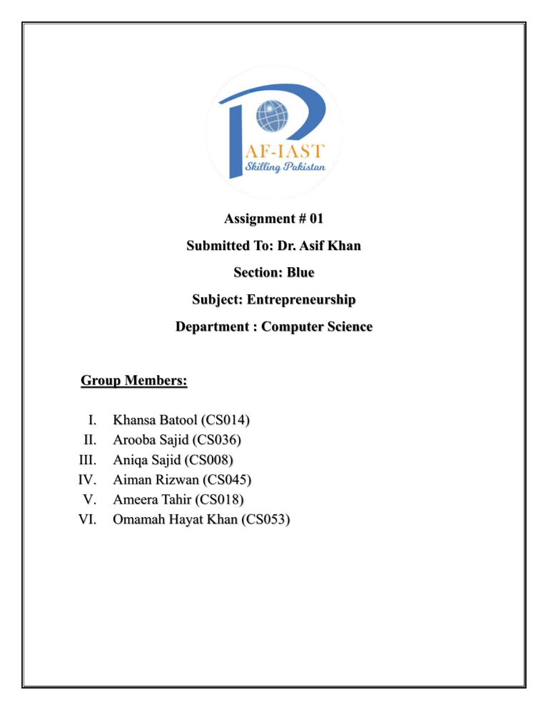 Assignment # 01 Submitted To: Dr. Asif Khan Section: Blue Subject: Entrepreneurship Department : Computer Science Group Members: I. II. III. IV. V. VI. Khansa Batool (CS014) Arooba Sajid (CS036) Aniqa Sajid (CS008) Aiman Rizwan (CS045) Ameera Tahir (CS018) Omamah Hayat Khan (CS053) SWOT ANALYSIS OF GOOGLE: HISTORY OF GOOGLE: Google started in 1996 as a research project by two students, Larry Page and Sergey Brin, at Stanford University in the USA. They wanted to create a better way to search the internet. At that time, search engines were not very good at finding the right information. ➢ Strength: • Over 90 percent people use google engine (large market). • Strong brand and reputation. • AI leadership. • Innovative product and consistency. • Many companies use google for advertisement. ➢ Weaknesses: • Heavy dependence on Ads. • Increasing competition. • Primary concern. • Failed product launched like (google +). ➢ Opportunities: • growing demand of cloud computing. • Expansion of gemini Ap. • Digital payment. • Growth in hardware market. ➢ Threat: • Cyber security threats. • Increasing competition. • Repetitive algorithm. • Growing social media and video competition.