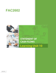 FAC2602 Open Rubric LEARNING OUTCOME You should be able to draft the statement of cash flows for a company in accordance with International Financial Reporting Standards (IFRS). OVERVIEW 10.1 INTRODUCTION ............................................................................................... 2 10.2 PURPOSE AND PRESENTATION OF A STATEMENT OF CASH FLOWS .... 2 10.3 ELEMENTS AND FRAMEWORK OF A STATEMENT OF CASH FLOWS ...... 3 10.4 EXERCISES ..................................................................................................... 18 SELF-ASSESSMENT.................................................................................................... 30 KEY CONCEPTS • • • • • • Preparation of a cash flow statement Cash and cash equivalents Non-cash items Direct method Indirect method Operating vs investing vs financing activities ASSESSMENT CRITERIA After studying this learning unit, you should be able to: • draft a statement of cash flows, with accompanying notes, for a company using the direct method in accordance with IFRS • draft a statement of cash flows, with accompanying notes, for a company using the indirect method in accordance with IFRS • distinguish between cash and non-cash items 1 10.1 INTRODUCTION In Accounting I, we introduced you to company annual financial statements. You studied aspects such as the statement of financial position and the statement of profit or loss and other comprehensive income. In Accounting II, you will be studying the above aspects in greater detail and will acquire knowledge of IFRS. Although the sections of the Companies Act and the IFRS statements are very important for your studies, we don’t expect you to read them all. However, in order to equip you thoroughly, we will refer to them in the learning unit from time to time. Cash flow information involves the meaningful presentation of the cash that the entity generated and applied. We present this information to the readers of financial statements in the form of a statement of cash flows. A complete set of financial statements comprises the following: • • • • • statement of financial position statement of profit or loss and other comprehensive income statements of changes in equity statement of cash flows, and notes to the financial statements Users of financial statements are interested in the information on cash flow, which can be derived from the statement of cash flows. As the name indicates, this statement has to do with the cash flows in an enterprise, which implies that we omit all the items in the annual financial statements that have nothing to do with the cash flow when we compile the statement of cash flows. 10.2 PURPOSE AND PRESENTATION OF A STATEMENT OF CASH FLOWS The purpose of the statement of cash flows is to provide information to the various users of financial statements. Each enterprise presents its cash flows from operations, investment and financing in the way most suitable for its business. 2 The following represents the logical presentation: Net cash flow from operating activities o cash receipts from customers o cash paid to suppliers and employees o investment income o interest paid o income tax paid o dividends paid o proceeds from the sale of financial assets at fair value through profit or loss: held for trading Net cash flow from investing activities Net cash flow from financing activities Net change in cash and cash equivalents Operating activities are the principal income-producing activities of the enterprise as well as other activities which are not investing or financing activities. Investing activities include the acquisition and sale of non-current assets and other investments not included in cash flow equivalents. Financing activities are activities that result in changes in the size and composition of the equity capital and borrowings to the enterprise. 10.3 ELEMENTS AND FRAMEWORK OF A STATEMENT OF CASH FLOWS The elements of a statement of cash flows are the following: • • • operating activities investing activities financing activities Operating activities The amount of cash arising from operating activities is a key indicator of the extent to which the operations of the entity have generated sufficient cash to repay loans, maintain the operating capability of the entity, pay dividends and make new investments without recourse to external financing. 3 Cash flows from operating activities are derived primarily from the principal revenueproducing activities of the entity. Therefore, they generally result from the transactions and other events that determine profit or loss. The following are examples of cash flows from operating activities: • • • • cash receipts from the sale of goods and the rendering of services cash payments to suppliers for goods and services cash payments to and on behalf of employees cash payments and refunds in respect of income taxes Investing activities It is important to disclose cash flows from investing activities because they represent the extent to which payments have been made for resources intended to generate future receipts and cash flows. The following are examples of cash flows arising from investing activities: • • cash payments to acquire property, plant and equipment and other non-current assets cash receipts from sales of property, plant and equipment and other non-current assets Financing activities It is important to disclose cash flows arising from financing activities because they are useful in predicting claims from providers of capital to the entity on future cash flows. The following are examples of cash flows arising from financing activities: • • • • cash proceeds from issuing shares cash payments to owners to acquire or redeem the entity's shares cash proceeds from issuing debentures, loans, mortgage bonds and current or noncurrent borrowings cash repayments for amounts borrowed 4 We can represent a statement of cash flows schematically as fol