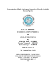 Determination of Basic Mechanical Properties of Locally Available Bamboo Species. RESEARCH REPORT BACHELOR OF ENGINEERING IN CIVIL ENGINEERING By Choeying Dema – 02200008 Dechen Wangchuk – 02200009 Dechen Zangmo – 02200010 Under the guidance of Mr. Tshewang Nidup (Guide) DEPARTMENT OF CIVIL ENGINEERING COLLEGE OF SCIENCE AND TECHNOLOGY ROYAL UNIVERSITY OF BHUTAN PHUENTSHOLING: BHUTAN 2022 Acknowledgement First and foremost, we would like to express our deep and heartfelt gratitude to Mr. Tshewang Nidup, our research guide, for his patient guidance, enthusiastic encouragement and continued support. It was a great privilege and honor to work under his guidance. This research could not have been accomplished without his supervision. We are also sincerely thankful to our module tutor Dr. Sangey Passang for introducing us to this field of study. Moreover, for helping in keeping and maintaining our development on track. We would also like to extend our gratitude to the college of science and technology for giving us this opportunity to conduct such research that helped us develop valuable lessons and strengthening our knowledge in this field. We would like to thank all of our research panel members, Dr. Chimi Wangmo, Mr. Nimesh Chettri and Mr. Rigzin Norbu for their constructive criticism which helped us to work on our research better. The guidance and support received from all the members was vital for the success of this research. We are extremely grateful for the time and knowledge that you have given us to conduct this research. We are deeply grateful to all the people who were involved in this research work directly or indirectly. Their contributions are sincerely appreciated and delightedly acknowledged. 2 Abstract Bamboo has emerged as a possible material to be used instead of steel as it is found to be versatile and inexpensive in contrast to other building materials. They are the largest members of the grass family and are the fastest growing in the world. In Bhutan, the use of bamboo has mostly been restricted to non-structural and lower grade buildings due to insufficient information about them. Due to high demand of existing construction material like steel and the wood, bamboo is the good alternative material. Bamboo is natural, cheap and widely available material and the most importantly bamboo has strong tension and compression in strength that can be used in construction. The main objective of this paper is to determine the various physical properties of bamboo and to compare it with other materials. In order to compare bamboo with other materials, the mechanical properties of steel and concrete were collected. We will be collecting a material known as “So” by the locals, which is found within the campus. Various mechanical and physical properties of the sample will be tested in order to compare it with other materials. Key Words: Bamboo, building material, non-structural, physical property and mechanical property. 3 Table of content 1. Introduction……………………………………………………………………5-9 1.1 Conventional construction materials……………………………………..5 1.1.1 Properties of conventional construction materials………………....5 1.1.2 Drawbacks of conventional construction materials……………….. 5 1.2 General introduction on bamboo…………………………………………5-6 1.2.1 Bamboo structures in the world…………………………………....6 1.2.2 Properties on bamboo………………………………………………6 1.2.3 Advantage of bamboo over other materials………………………..6-7 1.2.4 Limitations of bamboo……………………………………………..7 1.2.5 Types of bamboo species found in Bhutan………………………...8 1.3 Problem statement………………………………………………………..9 1.4 Aim……………………………………………………………………….9 1.5 Objective…………………………………………………………………9 2. Materials and method………………………………………………………...10-12 2.1 Conduct of experiment…………………………………………………...11 2.1.1 Selection and preparation of bamboo……………………………....11-13 3. Result and data analysis………………………………………………………13-17 3.1 Tensile strength test………………………………………………………13-14 3.2 Flexural strength test……………………………………………………..14-15 3.2.1 Load and deflection analysis……………………………………..15-16 3.3 Moisture content test……………………………………………………..17 4. Conclusion……………………………………………………………………..18 References……………………………………………………………………..19-20 4 Introduction Conventional construction materials The existing construction industry is heavily dependent on two materials, concrete and steel. However, the two materials prove out to have several disadvantages over bamboo (Shastry & Unnikrishnan, 2017).The selection of construction materials is based mainly on the price and the type of facility used for production or processing. Industrialized materials, such as ordinary Portland cement (OPC) and steel, find applications in all sectors and in the world to which a road leads. Properties of conventional construction materials Steel and concrete being one of the widely used construction materials have numerous mechanical properties like strength in tension, strength in compression, strength in shear, yield strength, durability, hardness and many more. Steel is said to have equal strength in both tension and compression making them more suitable for construction purposes whereas concrete is much stronger in compression