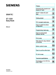 Easy Book ___________________ Preface Introducing the powerful and 1 ___________________ flexible S7-1200 SIMATIC S7-1200 Easy Book Manual STEP 7 makes the work 2 ___________________ easy ___________________ 3 Getting started ___________________ 4 PLC concepts made easy Easy to create the device ___________________ 5 configuration ___________________ 6 Programming made easy Easy to communicate ___________________ 7 between devices ___________________ 8 PID is easy Web server for easy Internet ___________________ 9 connectivity ___________________ 10 Motion control is easy ___________________ 11 Easy to use the online tools ___________________ 12 IO-Link is easy ___________________ A Technical specifications Exchanging a V3.0 CPU for ___________________ B a V4.1 CPU 01/2015 A5E02486774-AG Legal information Warning notice system This manual contains notices you have to observe in order to ensure your personal safety, as well as to prevent damage to property. The notices referring to your personal safety are highlighted in the manual by a safety alert symbol, notices referring only to property damage have no safety alert symbol. These notices shown below are graded according to the degree of danger. DANGER indicates that death or severe personal injury will result if proper precautions are not taken. WARNING indicates that death or severe personal injury may result if proper precautions are not taken. CAUTION indicates that minor personal injury can result if proper precautions are not taken. NOTICE indicates that property damage can result if proper precautions are not taken. If more than one degree of danger is present, the warning notice representing the highest degree of danger will be used. A notice warning of injury to persons with a safety alert symbol may also include a warning relating to property damage. Qualified Personnel The product/system described in this documentation may be operated only by personnel qualified for the specific task in accordance with the relevant documentation, in particular its warning notices and safety instructions. Qualified personnel are those who, based on their training and experience, are capable of identifying risks and avoiding potential hazards when working with these products/systems. Proper use of Siemens products Note the following: WARNING Siemens products may only be used for the applications described in the catalog and in the relevant technical documentation. If products and components from other manufacturers are used, these must be recommended or approved by Siemens. Proper transport, storage, installation, assembly, commissioning, operation and maintenance are required to ensure that the products operate safely and without any problems. The permissible ambient conditions must be complied with. The information in the relevant documentation must be observed. Trademarks All names identified by ® are registered trademarks of Siemens AG. The remaining trademarks in this publication may be trademarks whose use by third parties for their own purposes could violate the rights of the owner. Disclaimer of Liability We have reviewed the contents of this publication to ensure consistency with the hardware and software described. Since variance cannot be precluded entirely, we cannot guarantee full consistency. However, the information in this publication is reviewed regularly and any necessary corrections are included in subsequent editions. Siemens AG Division Digital Factory Postfach 48 48 90026 NÜRNBERG GERMANY A5E02486774-AG Ⓟ 12/2014 Subject to change Copyright © Siemens AG 2015. All rights reserved Preface Welcome to the world of S7-1200. The SIMATIC S7-1200 compact controller is the modular, space-saving controller for small automation systems that require either simple or advanced functionality for logic, HMI and networking. The compact design, low cost, and powerful features make the S7-1200 a perfect solution for controlling small applications. As part of the SIMATIC commitment to "totally integrated automation" (TIA), the S7-1200 product family and the TIA Portal programming software give you the flexibility you need to solve your automation needs. The S7-1200 helps to make the most challenging tasks easy! The SIMATIC S7-1200 controller solution, designed for the "compact" controller class, is comprised of the SIMATIC S7-1200 controller and SIMATIC HMI Basic panels that can both be programmed with the TIA Portal engineering software. The ability to program both devices using the same engineering software significantly reduces development costs. The TIA Portal includes STEP 7 for S7-1200 programming and WinCC for designing Basic panel projects. The S7-1200 compact controller includes: • Built-in PROFINET • High-speed I/O capable of motion control, onboard analog inputs to minimize space requirements and the need for additional I/O, 4 pulse generators for pulse-train and pulse-width applications (Page 70), and up to 6 high-speed counters (Page 129) • On-board I/O points built into the CPU modules provide from 6 to 14 input points and from 4 to 10 output points. Signal modules for DC, relay, or analog I/O expand the number of I/O points, and innovative signal boards snap onto the front of the CPU to provide additional I/O (Page 18). The SIMATIC HMI Basic panels (Page 20) were designed specifically for the S7-1200. This Easy Book provides an introduction to the S7-1200 PLC. The following pages offer an overview of the many features and capabilities of the devices. For additional information, refer to the S7-1200 Programmable Controller System Manual. For information about UL and FM certification, CE labeling, C-Tick and other standards, refer to the Technical specifications (Page 361). Easy Book Manual, 01/2015, A5E02486774-AG 3 Preface This manual describes the following products: ● STEP 7 V13 SP1 Basic and Professional ● S7-1200 CPU firmware release V4.1 Documentation and information S7-1200 and STEP 7 provide a variety of d