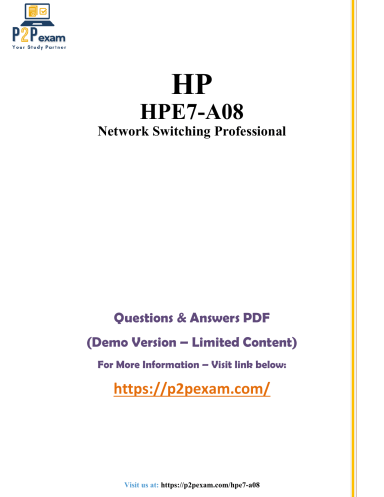 HP HPE7-A08 Network Switching Professional Questions & Answers PDF (Demo Version – Limited Content) For More Information – Visit link below: https://p2pexam.com/ Visit us at: https://p2pexam.com/hpe7-a08 Latest Version: 6.0 Question: 1 Which HPE Aruba switch models support stacking? (Select two.) Response: A. 2930M B. 2530 C. 8320 D. 3810M Answer: A,D Question: 2 A customer wants to deploy a switch with integrated PoE support and Layer 3 capabilities. Which HPE Aruba switch series should they choose? Response: A. Aruba 2530 B. Aruba 2930M C. Aruba 5400R D. Aruba 3810M Answer: C Question: 3 Which network design principle ensures that a network remains operational even when a component fails? Response: A. Scalability B. Redundancy C. Convergence D. Segmentation Answer: B Visit us at: https://p2pexam.com/hpe7-a08 Question: 4 Which logs should be reviewed after an unexpected network outage? (Select two.) Response: A. Spanning-tree topology changes B. DHCP server logs C. VLAN pruning logs D. NetEdit backup logs Answer: A,D Question: 5 Which steps should be followed to configure Layer 2 VLANs on Aruba switches? (Select two.) Response: A. Assign VLAN ID to the switch interface B. Enable LLDP globally C. Create a VLAN and assign it a name D. Enable DHCP relay Answer: A,C Question: 6 A network administrator needs to audit the configuration changes made to an Aruba switch over the past week. Which tools or methods should be used? Response: A. Review NetEdit configuration history B. Check VLAN assignments manually C. Restart the switch to apply new logs D. Disable STP to verify past changes Answer: A Question: 7 Visit us at: https://p2pexam.com/hpe7-a08 Which issue occurs if an access port is incorrectly set as a trunk port? Response: A. Devices connected to it receive untagged VLAN traffic B. The port stops forwarding traffic C. The port enters blocking mode D. All VLANs are merged into one Answer: A Question: 8 Which multicast protocol is recommended for enterprise networks? Response: A. OSPF B. IGMP C. MPLS D. LACP Answer: B Question: 9 A network administrator needs to deploy Aruba switches using a centralized cloud-based solution. Which tool should be used? Response: A. AirWave B. Aruba Central C. NetEdit D. CLI Answer: B Question: 10 Which logs can help identify network issues on Aruba switches? (Select two.) Response: Visit us at: https://p2pexam.com/hpe7-a08 A. Syslog messages B. Port security violations C. VLAN pruning logs D. DHCP Snooping logs Answer: A,D Visit us at: https://p2pexam.com/hpe7-a08 For More Information – Visit link below: https://p2pexam.com/ Thanks for Using Our Product Pass Your Certification With p2pexam Guarantee Use coupon code “20off” for 20USD discount Sales: sales@p2pexam.com Support: support@p2pexam.com Visit us at: https://p2pexam.com/hpe7-a08