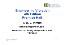 Engineering Vibration 4th Edition Prentice Hall © D. J. Inman daninman@umich.edu We make our living in dynamics and vibration University of Michigan © D. J. Inman 1/43 Vibrations are Everywhere University of Michigan © D. J. Inman 2/43 (Show movies) Modeling and Degrees of Freedom The examples on the previous slide many degrees of freedom and many parts, we will start with one degree of freedom and work towards many. • Recall from your study of statics and physics that a degree of freedom is the independent parameter needed to describe the configuration of a physical system • So single degree of freedom system, which is where we start, is a system whose position in time and space can be defined by one coordinate, a displacement Lack of consideration of here dynamic loads and vibrationor caused this to relatively new bridge to vibrate wildly position. University of Michigan © D. J. Inman 3/43 Degrees of Freedom: The Minimum Number of coordinates to specify a configuration • For a single particle confined to a line, one coordinate suffices so it has one degree of freedom • For a single particle in a plane two coordinates define its location so it has two degrees of freedom • A single particle in space requires three coordinates so it has three degrees of freedom University of Michigan © D. J. Inman 4/43 Example 1.1.1 The Pendulum • Sketch the structure or part of interest • Write down all the forces and make a “free body diagram” • Use Newton’s Law and/or Euler’s Law to find the equations of motion ∑ M = J α , J = m 0 University of Michigan © D. J. Inman 0 2 0 5/43 The problem is one dimensional, hence a scalar equation results J 0α (t) = −mgl sin θ (t) ⇒ m θ(t) + mg θ (t) = 0 sin 2 restoring force Here the over dots denote differentiation with respect to time t This is a second order, nonlinear ordinary differential equation We can linearize the equation by using the approximation sin θ ≈ θ g ⇒ m θ (t) + mgθ (t) = 0 ⇒ θ (t) + θ (t) = 0 2 Requires knowledge of θ (0) and θ(0) University of Michigan © D. J. Inman the initial position and velocity. 6/43 Next consider a spring mass system and perform a static experiment: • From strength of materials recall: FBD: nonlinear linear A plot of force versus displacement: University of Michigan © D. J. Inman experiment ⇒ fk = kx 7/43 Free-body diagram and equation of motion •Newton’s Law: University of Michigan © D. J. Inman m x(t) = −kx(t) ⇒ m x(t) + kx(t) = 0 = v0 x(0) = x0 , x(0) (1.2) Again a 2nd order ordinary differential equation 8/43 Stiffness and Mass Vibration is cause by the interaction of two different forces one related to position (stiffness) and one related to acceleration (mass). Proportional to displacement Stiffness (k) Displacement x fk = −kx(t) Mass (m) k statics fm = ma(t) = m x(t) m Mass Spring dynamics University of Michigan © D. J. Inman Proportional to acceleration 9/43 Examples of Single-Degree-ofFreedom Systems Pendulum Shaft and Disk l =length Gravity g θ Torsional Stiffness k m θ g θ (t) + θ (t) = 0 l University of Michigan © D. J. Inman Moment of inertia J Jθ(t) + kθ (t) = 0 10/43 Solution of 2nd order DEs x(t) Lets assume a solution: x(t) = Asin(ω nt + φ ) (1.3) t Differentiating twice gives: = ω n A cos(ω nt + φ ) x(t) (1.4) x(t) = −ω n2 Asin(ω nt + φ ) = -ω n2 x(t) (1.5) Substituting back into the equations of motion gives: −mω n2 Asin(ω nt + φ ) + kAsin(ω nt + φ ) = 0 −mω + k = 0 2 n University of Michigan © D. J. Inman or ωn = k m Natural frequency rad/s 11/43 Summary of simple harmonic motion x(t) Period 2π T= ωn x0 Amplitude A Slope here is v0 φ t Maximum Velocity ωn ωn A ω n rad/s ω n cycles ω n fn = = = Hz 2π rad/cycle 2π s 2π University of Michigan © D. J. Inman 12/43 Initial Conditions If a system is vibrating then we must assume that something must have (in the past) transferred energy into to the system and caused it to move. For example the mass could have been: •moved a distance x0 and then released at t = 0 (i.e. given Potential energy) or •given an initial velocity v0 (i.e. given some kinetic energy) or •Some combination of the two above cases From our earlier solution we know that: x0 = x(0) = Asin(ω n 0 + φ ) = Asin(φ ) = ω n A cos(ω n 0 + φ ) = ω n A cos(φ ) v0 = x(0) University of Michigan © D. J. Inman 13/43 Initial Conditions Determine the Constants of Integration Solving these two simultaneous equations for A and ϕ gives: 1 2 2 2 −1 ⎛ ω n x0 ⎞ A= ω n x0 + v0 , φ = tan ⎜ ωn ⎝ v0 ⎟⎠ Amplitude Phase Slope here is v0 x(t) x0 1 ω n2 x02 + v02 ωn t φ ωn University of Michigan © D. J. Inman x0 φ v0 ωn 14/43 Thus the total solution for the spring mass system becomes: ω n2 x02 + v02 ⎛ −1 ω n x0 ⎞ x(t) = sin ⎜ ω nt + tan ωn v0 ⎟⎠ ⎝ (1.10) Called the solution to a simple harmonic oscillator and describes oscillatory motion, or simple harmonic motion. Note (Example 1.1.2) ω n2 x02 + v02 x(0) = ωn University of Michigan © D. J. Inman ω n x0 ω x +v 2 2 n 0 as it should 2 0 = x0 15/43 A note on arctangents • Note that calculating arctangent from a calculator requires some attention. First, all machines work in radians. • The argument atan(-/+) is in a different quadrant then atan(+/-), and usual machine calculations will return an arctangent in between -π/2 and +π/2, reading only the atan(-) for these two different cases. + φ - University of Michigan © D. J. Inman + + _ φ + In MATLAB, use the atan2(x,y) function to get 16/43 the correct phase. Example 1.1.3 wheel, tire suspension m = 30 kg, fn = 10 hz, what is k? ⎛ cylce 2π rad ⎞ 5 k = mω = ( 30 kg ) ⎜ 10 i = 1.184 × 10 N/m ⎟ ⎝ sec cylce ⎠ 2 n There are of course more complex models of suspension systems and these appear latter in the course as our tools develope University of Michigan © D. J. Inman 17/43 Section 1.2 Harmonic Motion The period is the time elapse