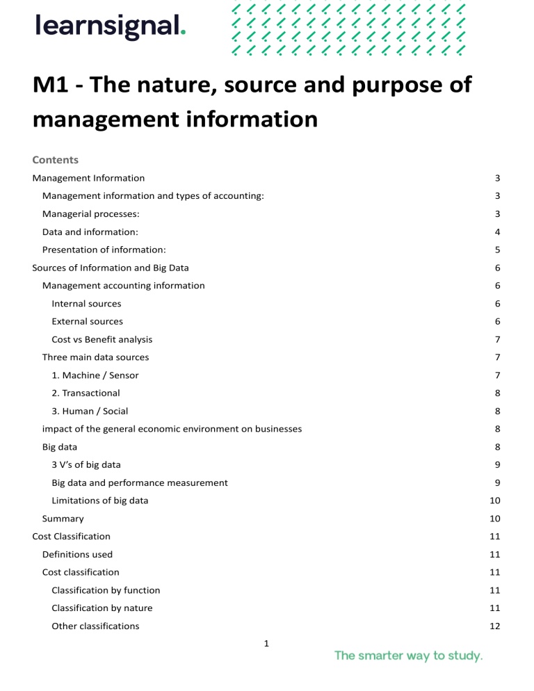 M1 - The nature, source and purpose of management information Contents Management Information 3 Management information and types of accounting: 3 Managerial processes: 3 Data and information: 4 Presentation of information: 5 Sources of Information and Big Data 6 Management accounting information 6 Internal sources 6 External sources 6 Cost vs Benefit analysis 7 Three main data sources 7 1. Machine / Sensor 7 2. Transactional 8 3. Human / Social 8 impact of the general economic environment on businesses 8 Big data 8 3 V’s of big data 9 Big data and performance measurement 9 Limitations of big data 10 Summary 10 Cost Classification 11 Definitions used 11 Cost classification 11 Classification by function 11 Classification by nature 11 Other classifications 12 1 Capital and revenue expenditure 12 Responsibility centres 12 Cost Behaviour 14 Classification of costs by their behaviour 14 Variable 14 Semi-variable 14 Fixed 15 Stepped fixed 15 Presentation of Information 16 Column, Bar and Line Charts 16 Line Graphs 17 Compound Column, Bar and Line Charts 17 Component/Stacked Column and Bar Charts 18 Pie Charts 18 100% Stacked Column Charts 19 Scatter Diagrams 19 coding system 20 preparing reports 20 Summary 20 2 Management Information MANAGEMENT INFORMATION AND TYPES OF ACCOUNTING: Management information is the information provided to managers to allow them to do their jobs. There are three types of accounting: 1. Cost accounting; 2. Management accounting; 3. Financial accounting. To understand these types of accounting, we need to consider the following questions: a) Does the information relate to the past or to the future? b) Is the information of a financial or of a non-financial nature? c) Is the information used by internal or external users? d) Is there a legal requirement for cost accounts, management accounts or financial accounts to be prepared by an organisation? Cost accounting Management accounting Financial accounting Past or future? Past Past and future Past Financial or non-financial? Financial (Product/Service costing) Financial and non-financial Financial (Published accounts) Internal or external use? Internal (Cost information) Internal (For managers) Internal & External (For shareholders) Legal requirement? No legal requirement No legal requirement Legal requirement (Limited companies) MANAGERIAL PROCESSES: Roles of the management accountant: 1. 2. 3. 4. 5. Analysis of past financial information which includes costs and revenues; Forecast of future financial information which includes costs and revenues; Preparation of regular reports, for example, monthly management accounts; Analysis of past non-financial information (orders processed, number of staff leaving etc.); Planning, decision-making and control - the main role. Planning is about what we want to achieve in the future and how we will go about reaching our goal. 3 Types of planning: 1) Strategic planning is concerned with the long-term aims and looks at the plans for the next five to ten years; 2) Tactical planning is concerned with specific short-term actions on how to carry out the strategic plan over the next one to three years; 3) Operational planning is concerned with the shorter term, for example, achieving the tactical objectives on a daily or monthly basis. The decision-making process involves looking at information and using it to ‘make a decision’. Control involves looking at the actual results of an organisation and comparing them with the planned results (or the results that we were expecting based on the information that we were given at a certain time). The comparison of these results gives rise to ‘variances’, calculation and analysis of which is an important part of management accounting. DATA AND INFORMATION: Data is ‘crude’ information or information which hasn’t been processed into a more meaningful form. Data can be financial or non-financial. Information is data which has been processed into a meaningful form so that it can be used, for example, in the managerial processes of planning, decision making and control. Information can be financial or non-financial. Internal sources of data and information: External sources of data and information: − Accounting records; − Government statistics; − Production records (usage, hours spent − Newspapers and television; etc.); − Libraries; − Payroll system; − Internet; − Employee records. − Journals and magazines; − Financial press; − Trade associations; − Customers and suppliers; − Quotations and price lists. Information should be: A - Accurate; 4 C - Cost effective; C - Complete; U - User focused; R - Relevant; A - Authoritative; T - Timely; E - Easy to understand and use. Note: If some of these attributes are not present in management information, then it might have an adverse effect on the decisions made by an organisation. Limitations of management information are: − Cost outweighs benefit; − Information is out-of-date; − Information contains errors; − Information is not complete; − The importance of non-financial information is overlooked; − Information is based on incorrect assumptions. PRESENTATION OF INFORMATION: Ways of presentation: − Reports; − Tables; − Charts; − Graphs. 5 Sources of Information and Big Data MANAGEMENT ACCOUNTING INFORMATION Management accounting information is far more than debits and credits, and financial information. In their modern role, accountants increasingly measure externally focused, nonfinancial, forward-looking information to help with decision-making and performance management in the organisation. This makes the potential sources of management accounting information huge: Internal sources Internal sources may be considered: − Formal: For example: - Management accounts and underlying systems; Human resources information stores; Inventory ledgers; Production control; Procurement plans; Activity. − Informal: For example: - Chats around the coffee machine; 