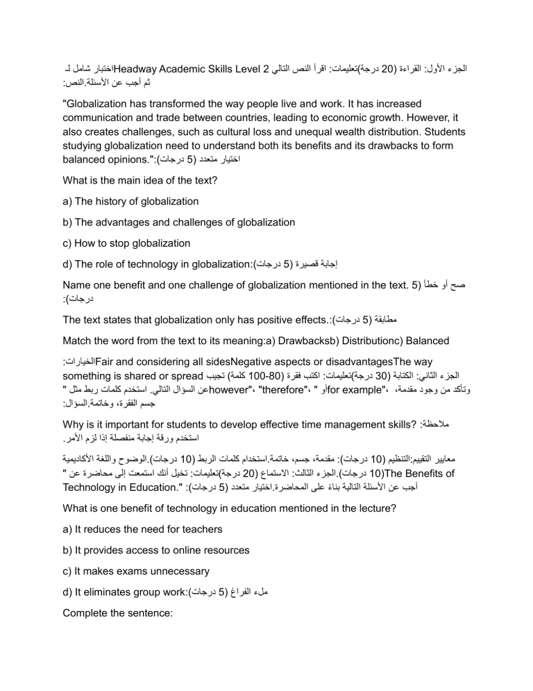 اختبار شامل لـHeadway Academic Skills Level 2 اقرأ النص التالي: درجة)تعليمات20( القراءة:الجزء األول :النص.ثم أجب عن األسئلة "Globalization has transformed the way people live and work. It has increased communication and trade between countries, leading to economic growth. However, it also creates challenges, such as cultural loss and unequal wealth distribution. Students studying globalization need to understand both its benefits and its drawbacks to form balanced opinions.":) درجات5( اختيار متعدد What is the main idea of the text? a) The history of globalization b) The advantages and challenges of globalization c) How to stop globalization d) The role of technology in globalization:) درجات5( إجابة قصيرة Name one benefit and one challenge of globalization mentioned in the text. 5( صح أو خطأ :)درجات The text states that globalization only has positive effects.:) درجات5( مطابقة Match the word from the text to its meaning:a) Drawbacksb) Distributionc) Balanced :الخياراتFair and considering all sidesNegative aspects or disadvantagesThe way something is shared or spread كلمة) تجيب100-80( اكتب فقرة: درجة)تعليمات30( الكتابة:الجزء الثاني " استخدم كلمات ربط مثل.عن السؤال التاليhowever"، "therefore"، " أوfor example"، ،وتأكد من وجود مقدمة :السؤال. وخاتمة،جسم الفقرة Why is it important for students to develop effective time management skills? :مالحظة .استخدم ورقة إجابة منفصلة إذا لزم األمر الوضوح واللغة األكاديمية.) درجات10( استخدام كلمات الربط. خاتمة، جسم، مقدمة:) درجات10( التنظيم:معايير التقييم " تخيل أنك استمعت إلى محاضرة عن: درجة)تعليمات20( االستماع:الجزء الثالث.) درجات10(The Benefits of Technology in Education." :) درجات5( اختيار متعدد.أجب عن األسئلة التالية بناء على المحاضرة What is one benefit of technology in education mentioned in the lecture? a) It reduces the need for teachers b) It provides access to online resources c) It makes exams unnecessary d) It eliminates group work:) درجات5( ملء الفراغ Complete the sentence: "Technology allows students to learn at their own ______.":) درجات10( إجابة قصيرة List two examples of technology used in education and explain one advantage of using them. تخيل أنك. جهز إجابة شفهية (يمكنك كتابتها كممارسة) للسؤال التالي: درجة)تعليمات20( التحدث:الجزء الرابع :السؤال. دقيقة2-1 اجب خالل.تشارك في مناقشة جماعية What is one academic skill you find challenging, and how are you working to improve it? الجزء.) درجات5( الطالقة والثقة.) درجات5( استخدام مفردات أكاديمية.) درجات10( الوضوح والتنظيم:معايير التقييم إجابة. أجب عن األسئلة التالية بناء على استراتيجيات الدراسة في الكتاب: درجات)تعليمات10( مهارات الدراسة:الخامس :) درجات5( قصيرة Name one technique for organizing notes during a lecture.:) درجات5( اختيار متعدد Which of the following is the best way to prepare for an exam? a) Studying only the night before b) Reviewing notes regularly c) Copying answers from a friend d) Skipping difficult topics