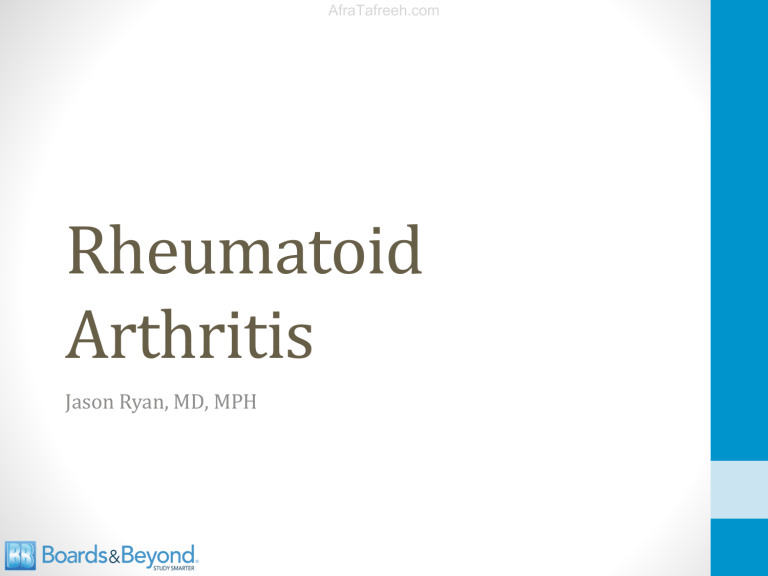 AfraTafreeh.com Rheumatoid Arthritis Jason Ryan, MD, MPH Rheumatoid Arthritis • Autoimmune disorder • Inflammation of joints especially hands, wrists • More common in women • Usual age of onset 40 - 60 AfraTafreeh.com Pixabay/Public Domain AfraTafreeh.com Rheumatoid Arthritis • Synovium • Thin layer of tissue (few cells thick) • Lines joints and tendon sheaths • Secretes hyaluronic acid to lubricate joint space • Inflammation • Unknown trigger • Overproduction of TNF and IL-6 Rheumatoid Arthritis • Synovial hypertrophy • Thickens into pannus • Infiltrated with inflammatory cells, granulation tissue • Increase in synovial fluid • Erodes into cartilage, bone AfraTafreeh.com • Antibody-mediated • Type III hypersensitivity AfraTafreeh.com Synovial Joint Open Stax College/Wikipedia Rheumatoid Arthritis • Symmetric joint inflammation • Gradual onset • Pain, stiffness, swelling • Classically “morning stiffness” AfraTafreeh.com • Joint stiffness >1 hour after rising • Improves with use • May have systemic symptoms (fever) AfraTafreeh.com Rheumatoid Arthritis • Classically affects MCP and PIP joints of hands • Often tender to touch • DIP joints spared James Heilman, MD/Wikipedia davida__jones/Flikr Rheumatoid Arthritis • Bones can erode/deviate • Ulnar deviation • Swelling of MCP joints → deviated wrist • Swan neck deformity AfraTafreeh.com • Hyperextended PIP joint • Flexed DIP Phoenix119/Wikipedia AfraTafreeh.com Rheumatoid Arthritis • Other joints: • Wrists • Elbows • Knees • Hips • Toes Wikipedia/Public Domain Rheumatoid Arthritis • Baker's cyst (popliteal cyst) • Synovium-lined sac at back of knee • Continuous with the joint space • If ruptures → symptoms similar to DVT AfraTafreeh.com Wikipedia/Public Domain AfraTafreeh.com Rheumatoid Arthritis • Serositis • Pleuritis, pleural effusion • Pericarditis, pericardial effusion Subcutaneous nodules • Palpable nodules common (20 to 35% patients) • Almost always occur in patients with RF+ • Common on elbow (can occur anywhere) • Central necrosis surrounded by AfraTafreeh.com macrophages/lymphocytes • Usually no specific treatment Nephron/Wikipedia AfraTafreeh.com Rheumatoid Arthritis • Episcleritis • Red, painful without discharge • Scleritis • Often bilateral • Dark, red eyes • Deep ocular pain on eye movement • Uveitis • Anterior/posterior • Floaters if posterior Image courtesy of Kribz Sjogren’s Syndrome • Salivary and lacrimal glands • Dry eyes, dry mouth (sicca symptoms) • Commonly associated with rheumatoid arthritis AfraTafreeh.com Lusb/Wikipedia Joyhill09 AfraTafreeh.com Osteoporosis • Accelerated by RA • Also often worsened by steroid treatment • 30 percent ↑risk of major fracture • 40 percent ↑risk hip fracture James Heilman, MD/Wikipedia Rheumatoid Arthritis • ~80% positive rheumatoid factor • Antibodies against Fc portion of IgG antibody • “Seropositive” rheumatoid arthritis • Poor specificity • Positive in endocarditis,AfraTafreeh.com Hep B, Hep C • Positive in Sjogren’s, Lupus • Antibodies to citrullinated peptides (ACPA) • Specific marker of RA AfraTafreeh.com Urea Cycle Carbamoyl Phosphate Aspartate ATP Citrulline Ornithine Urea Argininosuccinate Arginine Fumarate Citrulline • Non-standard amino acid - not encoded by genome • Incorporated into proteins via post-translational modification • More incorporation in inflammation • Anti-citrulline peptideAfraTafreeh.com antibodies used in RA • Up to 80% of patients with RA AfraTafreeh.com Rheumatoid Arthritis • Elevated CRP and ESR • Strong association with HLA-DR4 Treatment • NSAIDs • Steroids • Disease-modifying antirheumatic drugs (DMARDs) • Protect joints from destruction AfraTafreeh.com • Methotrexate • Azathioprine • Cyclosporine • Hydroxychloroquine • Sulfasalazine • Leflunomide • TNF-a inhibitors (antibodies against TNF-α) AfraTafreeh.com Sulfasalazine Sulfasalazine Acetylsalicylic acid (aspirin) Colonic Bacteria Sulfapyridine 5-aminosalicylic acid (5-ASA) Leflunomide • Inhibits dihydroorotate dehydrogenase • Inhibits pyrimidine synthesis • Side effects: diarrhea, abnormal LFTs, ↓WBCs • Also used in psoriatic arthritis AfraTafreeh.com CMP Dihydroorotate Dehydrogenase Dihydroorotic acid UMP Orotic Acid TMP AfraTafreeh.com Infliximab • Antibody against TNF-α • Used in rheumatoid arthritis, Crohn’s • Risk of reactivation TB • PPD screening done prior to treatment • Risk of other infections: bacterial, zoster Other TNF-α Inhibitors • Adalimumab (monoclonal antibody TNF-α) • Golimumab (monoclonal antibody TNF-α) • Etanercept • Recombinant protein of TNF receptor AfraTafreeh.com • “Decoy receptor” • Binds TNF instead of TNF receptor AfraTafreeh.com Long Term Complications • Increased risk of coronary disease • Leading cause of mortality • Amyloidosis • Secondary (AA) amyloidosis Ed Uthman, MD/Wikipedia Felty Syndrome • Syndrome of splenomegaly, neutropenia in RA • Classically occurs many years after onset RA • Usually in patient with severe RA • Joint deformity • Extra-articular disease AfraTafreeh.com • Improves with RA therapy Bob Blaylock/Wikipedia Wikipedia/Public Domain