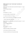 NCERT solutions for class 11 maths chapter 7 permutation and combinations Question:1(i) How many 3-digit numbers can be formed from the digits 1, 2, 3, 4 and 5 assuming that ut e repetition of the digits is allowed? The five digits are 1, 2, 3, 4 and 5 tit Answer: In s As we know that repetition of the digits is allowed, so , unit place can be filled by any of five digits. Similarly , tens and hundreds digits can also be filled by any of five digits. sh Number of 3-digit numbers can be formed Question:1(ii) How many 3-digit numbers can be formed from the digits 1, 2, 3, 4 and 5 ka assuming that repetition of the digits is not allowed? Aa Answer: The five digits are 1, 2, 3, 4 and 5 As we know that repetition of the digits is not allowed, so, the unit place can be filled by any of five digits. Tens place can be filled with any of the remaining four digits. Hundreds place can be filled with any of the remaining three digits. Number of 3-digit numbers can be formed when repetition is not allowed ut e Question:2 How many 3-digit even numbers can be formed from the digits 1, 2, 3, 4, 5, 6 if the digits can be repeated? The six digits are 1, 2, 3, 4 ,5 and 6 tit Answer: In s As we know that repetition of the digits is allowed, so, the unit place can be filled by any of even digits i.e.2,4 or 6 sh Similarly, tens and hundreds of digits can also be filled by any of six digits. Number of 3-digit even numbers can be formed Question:3 How many 4-letter code can be formed using the first 10 letters of the ka English alphabet, if no letter can be repeated? Aa Answer: There are 10 letters of English alphabets. As we know that repetition of the letters is not allowed, so, the first place can be filled by any of 10 letters. Second place can be filled with any of the remaining 9 letters. Third place can be filled with any of the remaining 8 letters. The fourth place can be filled with any of the remaining 7 letters. Number of 4-letter code can be formed when the repetition of letters is not ut e allowed Hence, 5040 4-letter codes can be formed using the first 10 letters of the English tit alphabet, if no letter can be repeated. Question:4 How many 5-digit telephone numbers can be constructed using the digits 0 In s to 9 if each number starts with 67 and no digit appears more than once? Answer: It is given that 5-digit telephone numbers always start with 67. ka variable. sh First, two digits among 5-digit telephone numbers are fixed and rest 3 digits are The 10 digits are from 0 to 9. Aa As we know that repetition of the digits is not allowed, so, the first and second place is filled by two digits 67 Third place can be filled with any of the remaining 8 digits. The fourth place can be filled with any of the remaining 7 digits. The fifth place can be filled with any of the remaining 6 digits. Number of 5-digit telephone numbers can be formed when repetition is not allowed ut e Question:5 A coin is tossed 3 times and the outcomes are recorded. How many possible outcomes are there? tit Answer: When a coin is tossed the number of outcomes is 2 i.e. head or tail. the number of outcomes In s When a coin is tossed 3 times then by multiplication principle, Question:6 Given 5 flags of different colours, how many different signals can be Answer: sh generated if each signal requires the use of 2 flags, one below the other? ka Each signal requires use of 2 flags. There will be as many flags as there are ways of filling in 2 vacant places in succession Aa by the given 5 flags of different colours. The upper vacant place can be filled in 5 different ways with any of 5 flags and lower vacant place can be filled in 4 different ways by any of rest 4 flags. Hence, by multiplication principle number of different signals that can be generated NCERT solutions for class 11 maths chapter 7 permutation and combinations-Exercise: 7.2 ut e Question:1(i) Evaluate Answer: Question:1(ii) Evaluate Answer: Aa ka sh Factorial can be given as : In s tit Factorial can be given as : Question:2 Is Answer: Factorial can be given as : To prove : ut e R.H.S : Answer: sh Question:3 Compute In s tit L.H.S : Aa ka To compute the factorial : So the answer is 28 Question:4 If find x Answer: Factorial can be given as : Aa ka Given : sh In s tit ut e To find x : Question:5(i) Evaluate Answer: when To evaluate Answer: ka To evaluate when sh Question:5(ii) Evaluate In s tit ut e Put Aa Put NCERT solutions for class 11 maths chapter 7 permutation and combinations-Exercise: 7.3 ut e Question:1 How many 3-digit numbers can be formed by using the digits 1 to 9 if no digit is repeated? tit Answer: 3-digit numbers have to be formed by using the digits 1 to 9. In s Here, the order of digits matters. Therefore, there will be as many 3-digit numbers as there are permutations of 9 different digits taken 3 at a time. Aa ka sh Therefore, the required number of 3-digit numbers Question:2 How many 4-digit numbers are there with no digit repeated? Answer: The thousands place of 4-digit numbers has to be formed by using the digits 1 to 9(0 cannot be included). Therefore, the number of ways in which thousands place can be filled is 9. ut e Hundreds,tens, unit place can be filled by any digits from 0 to 9. The digit cannot be repeated in 4-digit numbers and thousand places is occupied with a tit digit. Hundreds, tens, unit place can be filled by remaining any 9 digits. digits taken 3 at a time. In s Therefore, there will be as many 3-digit numbers as there are permutations of 9 different Aa ka sh Therefore, the required number of 3-digit numbers Thus, by multiplication principle, required 4 -digit numbers is Question:3 How many 3-digit even numbers can be made using the digits 1, 2, 3, 4, 6, 7, if no digit is repeated? Answer: 3-digit even numbers can be made using the digits 1, 2, 3, 4, 6, 7, if no digit is repeated. The unit place can be filled in 3 ways by any digits from 2,4 or 6. The digit cannot be repeated in 3-digit numbers and the unit place is occupied with a 