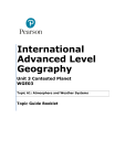 International Advanced Level Geography Unit 3 Contested Planet WGE03 Topic A1: Atmosphere and Weather Systems Topic Guide Booklet Contents Introduction ................................................................................................................................ 3 The Big Picture .......................................................................................................................... 4 3.3.1 Global atmospheric circulation ................................................................................ 5 3.3.2 Extreme weather hazards ....................................................................................... 13 3.3.3 Managing extreme weather ................................................................................... 18 Introduction Unit 3: Contested Planet Topic A1: Atmosphere and Weather Systems This booklet has been written to support teachers and learners teaching and studying the International Advanced Level Geography qualification. This guide should be used alongside other published teaching and learning materials available on the IAL Geography web page. Videos / animations: This Topic Booklet contains some links to videos and animations within YouTube. To view these without distracting comments and adverts being visible, copy and paste the URL into http://viewpure.com/ The Big Picture The Atmosphere and Weather Systems topic has three Enquiry Questions which must be covered. Enquiry Questions 1 and 2 are focused on physical process understanding, whereas Enquiry Question 3 is focused on management of extreme weather. • • • • • • EQ1 Weather, climate and the global climate system Weather and climate Global circulation Precipitation Air masses ITCZ Jet stream / Rossby waves EQ2 Causes of extreme weather events • • • • Depressions Anticyclones Tropical cyclones Drought EQ3 Managing extreme weather risk. • • • • • • Forecasting Players Prediction, warning and evacuation Engineering Managing drought Governance Assessment Topic A1 is assessed in Unit 3 Contested Planet by either: A 10 mark data stimulus question Or A 10 mark data stimulus question + a 15 mark essay style question. In an exam series where there is not a 15 mark essay style question on Topic A1, there will be one on Topic A2. In addition Topic A1 may form part of the content for the 15 mark Synoptic question (Question 3 on the exam paper). Please see the accompanying Assessment Guide for Unit 3 Contested Planet for further details. 3.3.1 Global atmospheric circulation Enquiry question: What are weather and climate and how are they influenced by the global climate system? Weather versus climate “Climate is what you expect, weather is what you get” This well-known phrase neatly sums up the difference between weather and climate – a source of confusion among students: Climate refers to the average annual conditions of a place, with reference to precipitation and temperature (and other metrics such as sunshine hours, air pressure). Usually 30 years worth of data are required to calculate climate averages. Weather is the day to day variation in atmospheric conditions of a place. The climate data below is for Toronto in Canada. These are averages for the period 1981-2010. Toronto’s climate is markedly seasonal in terms of temperature, but precipitation is much less seasonal varying from 53.7 mm to 84.7 mm. In June, people in Toronto might expect temperatures of around 19C with an average daily low of about 15C. However, the record June low is -2.2C. The record January high temperature is +16.1C. Those record days show how the weather was not what was expected based on the average climate. Month Daily mean °C Average precipitat ion mm Ja n −3. 7 Fe b −2. 6 Ma r 1.4 Ap r 7.9 Ma y 14. 1 Ju n 19. 4 61. 5 55. 4 53. 7 68. 0 82. 0 70. 9 Jul 22. 3 Au g 21. 5 Se p 17. 2 Oc t 10. 7 No v 4.9 De c −0. 5 Yea r 9.4 63. 9 81. 1 84. 7 64. 4 84. 1 61. 5 831 .1 The atmosphere Almost all of the world’s weather takes place in the lowest layers of the atmosphere, the troposphere, which extends to an altitude of about 20 km at the equator and 7 km at the poles: The troposphere contains about 75% of all of the mass of atmospheric gases and 99% of all water vapour. The upper limit of the troposphere is a boundary layer called the tropopause; here temperature stops falling with increasing altitude (a temperature inversion). Above the tropopause is the stratosphere. Only very major thunderstorms can reach into the lower stratosphere, as well as major volcanic eruptions clouds. The ozone layer, containing a concentration of O3, is found between 20-30 km altitude in the stratosphere. Gases in the atmosphere have various functions: Name Formula Percentage What is does % Nitrogen N2 78.1 Required for plant growth Oxygen O2 20.9 Animal / human respiration Ozone O3 Trace Filters out some harmful UV rays Argon Ar 0.9 Trace gas Carbon dioxide CO2 0.04 Greenhouse gas; reflects outgoing radiation back to earth. Plant respiration and growth Neon Ne 0.002 Trace gas Helium He 0.0005 Trace gas Methane CH4 0.0002 Greenhouse gas; reflects outgoing radiation back to earth Water vapor H2O 0.001% – Cloud formation; scatters 5% some incoming radiation back into space A question of scale? One important point about atmospheric gases is how much their volume has changed as a result of human activity. Carbon dioxide has increased from 0.027% to 0.04% as a result of human pollution since about 1850. This is a percentage change of 48%. If the amount of oxygen in the atmosphere changed by the same volume (0.013%) it would be a barely noticeable percentage decrease or increase on the 20.9% of the atmosphere that is oxygen. The concern about carbon dioxide levels is a result of the large percentage change in concentration. Carbon dioxide is responsible for the greenhouse effect along with water vapour and other gases. Incoming short-wave radiation from the sun passes through CO2 