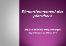 Dimensionnement des planchers Ecole Nationale Polytechnique Département de Génie Civil Dalle associée à des poutres principales et secondaires Dalle associée à des poutres principales et secondaires Ce type de planchers est le plus couramment utilisé dans les bâtiments industriels ou d'habitation. Il est constitué par une dalle (également appelée hourdis), d'épaisseur constante, reposant sur un système de poutres secondaires et de poutres principales. Nadjia MIHOUBI BAOUCHE Poutre principale Poutre secondaire Transmission des efforts Figure P6: Plancher avec dalle, poutres secondaires et poutres principale 5 Comment déterminer les efforts dans une dalle? Calcul des efforts dans une dalle Définitions 1) Une dalle est une plaque portant dans les deux directions (appuyée sur son pourtour) 2) Une poutre dalle est une plaque présentant deux bords libres sensiblement parallèles, distants d'au moins trois fois l'épaisseur. 3) On appelle "élancement" du panneau le rapport ο‘ = lX/lY ≤ 1 Par convention : lx = petite portée → lX et lY mesurées entre nus des appuis Aspect théorique w = flèche de la plaque, c'est-à-dire, sa déformation perpendiculaire à son plan. q = fonction de la charge (charge uniformément repartie d'intensité q). π¬ππ D = rigidité de la plaque = ππ(π−ππ ) E = module d'Young Nadjia MIHOUBI BAOUCHE La théorie du calcul des plaques chargées transversalement et dont les déformations restent petites conduit à la résolution de l'équation aux dérivées partielles: ππ π πππ π ππ π π + + = πππ πππ πππ πππ π« ν = coefficient de Poisson du matériau (ν = 0 à l'E.L.U et 0.2 à l'E.L.S) e = épaisseur de la plaque 7 Calcul des efforts dans une dalle Calcul des moments et des efforts tranchants d'après les abaques de Pigeaud Pigeaud a publié dans les annales des Ponts et Chaussées des abaques permettant de déterminer les moments maximaux suivant la petite et la grande portée pour les plaques rectangulaires simplement appuyées sur leur pourtour , soumises aux charges suivantes: ο§ charge uniformément repartie sur la surface de la plaque; ο§ charge uniformément repartie sur un rectangle concentrique à la plaque. En désignant par: π ππ α = π → α’ = ππ ππ lX et lY = dimensions des plaques mesurées entre nus des appuis et telles que lX ≤ lY 1) Panneau rectangulaire isostatique Moments de flexion Mox et Moy par unité de longueur, au centre de la plaque : ο§ Suivant le sens de la petite portée: π΄ππ = (π΄π + ππ΄π )π ππ ππ (daN.m/m) ο§ Suivant le sens de la grande portée: π΄ππ = (π΄π + ππ΄π )π ππ ππ (daN.m/m) Nadjia MIHOUBI BAOUCHE A) Cas des plaques chargées uniformément q = charge uniformément repartie M1 = valeur donnée par l'abaque en fonction de α M2= valeur donnée par l'abaque en fonction de α' 8 Calcul des efforts dans une dalle 2) Dalle continue a) Déterminer les moments de flexion, Mox et Moy, dans chaque plaque comme si elle était simplement appuyée, b) Calculer les moments dans les plaques « réelles » comme étant égaux à ces moments isostatiques multipliés par des coefficients forfaitaires pris égaux à : Pour un panneau courant (continu sur ses 4 bords) Mtx = 0.75Mox ο Dans le sens de la petite portée Mty = 0.75Moy Nadjia MIHOUBI BAOUCHE Pour les dalles continues, constituées de panneaux rectangulaires considérés comme encastrés sur leurs bords (panneau relié à des appuis présentant un moment d'inertie important, il en résulte un encastrement partiel de ses bords, donc apparition d'un moment négatif à ce niveau), le calcul des moments de flexion s'effectue par la méthode forfaitaire suivante: οDans le sens de la grande portée Max = -0.5Mox May = -0.5 Mox= Max Pour un panneau de rive (à l'extrémité de la dalle) Mtx = 0.85 Mox ο Dans le sens de la petite portée Max, extrême = -0.3 Mox Max, continu = -0.5 Mox Mty = 0.85 M0y ο Dans le sens de la grande portée May, extrême = -0.3 M0x May, continu = -0.5 M0x Le moment sur appui commun à deux panneaux est le plus grand en valeur absolue. 9 Calcul des efforts dans une dalle Panneau de rive ππ Nadjia MIHOUBI BAOUCHE Panneau continu ππ Figure P7: Dispositions forfaitaires 10 Calcul des efforts dans une dalle 3) Effort tranchant Effort tranchant par unité de longueur pour les dalles s’appuyant sur quatre côtés: Effort maximal au milieu de ly : π½π = ο Effort tranchant maximal au milieu de ππ : π½π = (daN/m) π ≤ π½π πππ (daN/m) p = charge totale uniformément repartie sur la surface de la plaque → p = q . lx . Ly → π½π = πππ ππ et π½π = π π+α π B) Cas des plaques chargées par un rectangle de dimensions u x v centré Soit P la valeur de la charge localisée centrée Les moments de flexion pour une plaque simplement appuyée sont: ο Sens de lx : Mx = (M1 + νM2) P (daNm/m) ο Sens de ly : My = (M2 + νM1) P (daNm/m) Nadjia MIHOUBI BAOUCHE π πππ +ππ ο π π π et ππ ππ ππ M1 donné par un graphe en fonction de α = π , π π π et ππ ππ ππ M2 donné par un graphe en fonction de α = π , La remarque concernant l'encastrement partiel des bords (cas des plaques chargées uniformément) reste valable. D’une manière générale, il faut toujours respecter la relation suivante: Mt + π΄ππ +π΄ππ ≥ 1,25 M0X π 11 Calcul des efforts dans une dalle Remarque: Rectangle d’impact Toute force appliquée à la face supérieure de la dalle d’épaisseur h sur un rectangle d’impact de dimension uo x vo est supposée agir uniformément (après diffusion des charges suivant un angle de 45°) au niveau du feuillet moyen sur un rectangle de dimensions u x v tel que: - u = uo + h et v = vo + h → si la force est appliquée directement sur la dalle Figure P8: Dimensions du rectangle d’impact Nadjia MIHOUBI BAOUCHE - u = uo + h + ξ h1 et v = vo + h + ξ h1 → s’il existe un revêtement d’épa