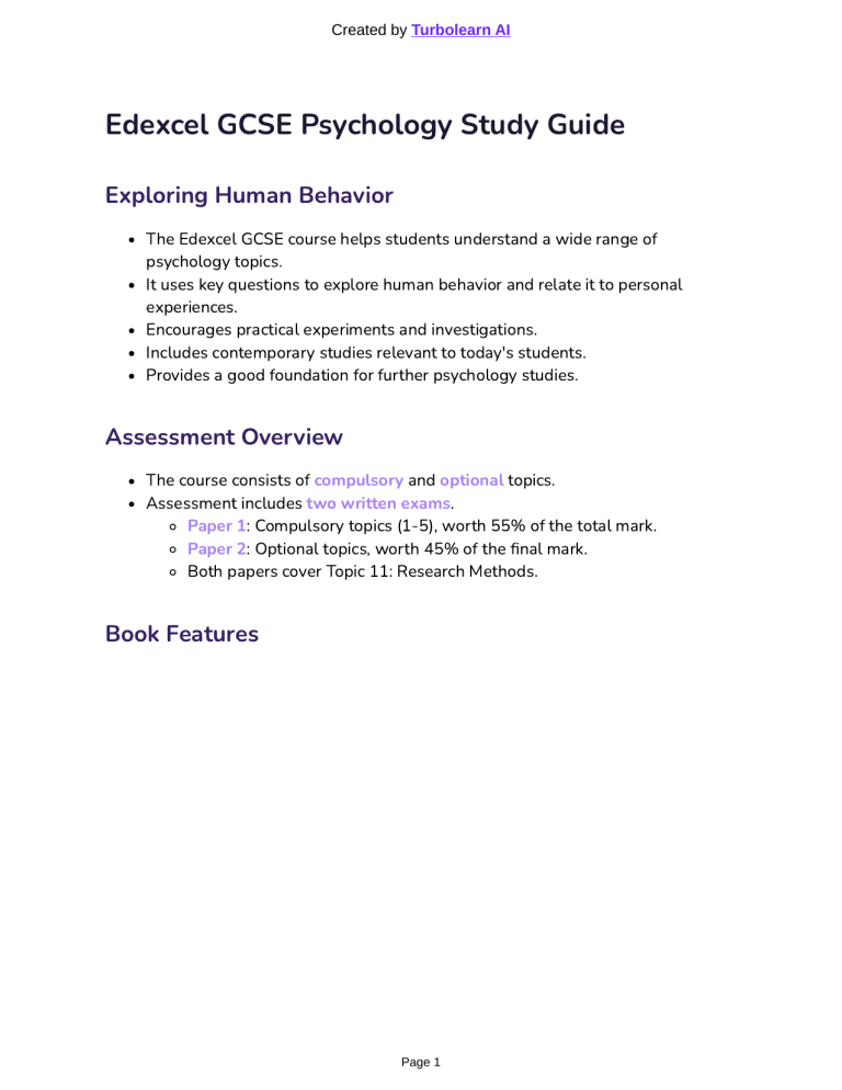 Created by Turbolearn AI Edexcel GCSE Psychology Study Guide Exploring Human Behavior The Edexcel GCSE course helps students understand a wide range of psychology topics. It uses key questions to explore human behavior and relate it to personal experiences. Encourages practical experiments and investigations. Includes contemporary studies relevant to today's students. Provides a good foundation for further psychology studies. Assessment Overview The course consists of compulsory and optional topics. Assessment includes two written exams. Paper 1: Compulsory topics (1-5), worth 55% of the total mark. Paper 2: Optional topics, worth 45% of the final mark. Both papers cover Topic 11: Research Methods. Book Features Page 1 Created by Turbolearn AI Exploring the Topic: Key questions to explore. Glossary of Key Terms: Definitions available online. Getting Started: Activities and questions to begin thinking about the topic. What You Will Learn: Summary of the topic content. Your Learning: Bullet point list of what is covered in each section. Key Terms: Important terms explained in the text and in key terms boxes. Apply It: Applying theory to specific tasks or questions. Try It: Building practical research skills. Link It Up: Connecting different parts of the course. Develop It: Activities to encourage reflection and broader discussion. Psychology in Action: Examples of psychology in everyday life. Exam Tip: Hints and tips for exams. Maths Tip: Hints for mathematical tasks. Exam-Style Question: Practice questions. Preparing for Your Exam: Dedicated exam preparation sections. Topic 1: Development – How Did You Develop? Importance of Understanding Development Development underpins everything we do, say, and believe. It's influenced by both nature and nurture. Psychology suggests that existing knowledge can hinder development; challenges lead to improvement. Practice and effort enhance skills. Key Topics Covered Early brain development Piaget’s stages of development and their role in education Piaget’s theory of cognitive development Dweck’s mindset theory and the effects of learning on development Willingham’s learning theory and the effects of learning on development Development studies by Piaget and Inhelder (1956) and Gunderson et al. (2013) Issues and debates around the development of morality Page 2 Created by Turbolearn AI Investigating Your Own Development Consider how age, upbringing, and experiences affect development. Reflect on abilities gained over time. Interview someone who knew you when you were young. Gather information from other students to see if gender affects development. Early Brain Development Development of the Brain At 3-4 weeks old, a long tube develops in the brain, divided into three sections: Forebrain Midbrain Hindbrain By 5 weeks, the forebrain and hindbrain split further, resulting in five cavities. The midbrain does not divide. Cerebellum and Medulla Development Cerebellum and medulla develop from birth to 3 years old. 700-1000 new connections form every second. Brain doubles in size in the first year, reaching 80% of its size by age 3. Early connections are important and reinforced by use. Cerebellum: Can be seen in the foetus at about 6 weeks, triples in size within a year after birth. Controls physical skills. Involved in responses such as fear and in processing sense information. Medulla Oblongata: In the hindbrain, in front of the cerebellum. Controls involuntary responses like sneezing, breathing, heart rate, and blood pressure. Formed by 20 weeks in the foetus. Connects the rest of the brain to the spinal cord. Key Terms Related to Brain Development Page 3 Created by Turbolearn AI Term Brain Forebrain Midbrain Hindbrain Anterior Posterior Cerebellum Medulla oblongata Involuntary response Neural connections Definition The organ in your head made up of nerves that processes information and controls behaviour. The anterior part of the brain, including the hemispheres and the central brain structures. The middle section of the brain forming part of the central nervous system. The lower part of the brain that includes the cerebellum, pons and medulla oblongata. Directed towards the front, when used in relation to our biology. Directed towards the back, when used in relation to our biology. An area of the brain near to the brainstem that controls motor movements (muscle activity). Connects the upper brain to the spinal cord and controls automatic responses. A response to a stimulus that occurs without someone making a conscious choice. Links formed by messages passing from one nerve cell (neuron) to another. Piaget's Four Stages of Development Overview Part of Piaget's theory of cognitive development. Involves four distinct stages; thinking abilities do not change much during these stages. Change in thinking indicates when the next stage is reached. During transition, features of both stages may be present. Each stage consolidates developing abilities in preparation for the next stage. Sensorimotor Stage (Birth to 2 Years) Page 4 Created by Turbolearn AI Infants use senses and movements to gather information about their world. Live in the present, rather than understanding time and space. Learn by linking senses (seeing, hearing, touching, tasting, smelling) to objects. Begin with reflex actions, then learn to control movements. Around 6 months, develop object permanence (understanding that objects exist even when they cannot be seen). Develop a sense of themselves as separate from the world. Repeat actions from around 4 months old. Object permanence: knowing something exists even if it is out of sight. Pre-Operational Stage (2 to 7 Years) Start of reasoning. Two stages within: Symbolic Function Stage (2 to 4 years): Start imitating others and use objects as symbols. Engage in symbolic play, using one object to represent different objects. Think in pictures and use symbols. Begin to use words as symbols for objects. Display egocentrism, seeing the world 
