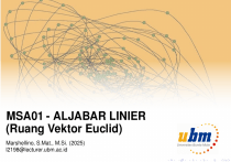 MSA01 - ALJABAR LINIER (Ruang Vektor Euclid) Marshellino, S.Mat., M.Si. (2025) l2198@lecturer.ubm.ac.id VEKTOR Definisi 1 (Vektor dan Skalar) Vektor adalah suatu besaran yang memiliki besar/nilai dan arah, sedangkan skalar adalah suatu besaran yang hanya mempunyai nilai saja. Vektor 2 dimensi dan 3 dimensi dapat direpresentasikan dengan menggunakan garis panah. Arah panah menentukan arah vektor dan panjang panah menentukan besarnya. Secara matematika ini dikenal sebagai vektor geometris. Marshellino, S.Mat., M.Si. Ruang Vektor Euclid / Vektor 1 / 26 Vektor secara umum dinotasikan menggunakan huruf kecil tebal, atau huruf kecil dengan tanda panah di atasnya. v, ⃗v −→ Vektor v dengan titik awal A dan titik akhir B dapat dituliskan sebagai AB. Dua vektor dikatakan ekuivalen jika panjang dan arah yang sama. Ruang vektor merupakan tempat vektor didefinisikan atau disebut juga ruang Euclid Marshellino, S.Mat., M.Si. Ruang Vektor Euclid / Vektor 2 / 26 Operasi Vektor Geometris 1. Penjumlahan Vektor Aturan Jajar Genjang: Penjumlahan dengan Translasi: Aturan Segitiga: Marshellino, S.Mat., M.Si. Ruang Vektor Euclid / Vektor 3 / 26 2. Pengurangan Vektor 3. Perkalian Vektor dengan Skalar Marshellino, S.Mat., M.Si. Ruang Vektor Euclid / Vektor 4 / 26 Definisi 2 (Vektor dalam Sistem Koordinat) Misalkan v ∈ Rn , v dapat dinyatakan dalam bentuk kartesius v = koordinat v 1 .. . (v1 , · · · , vn ) atau dapat ditulis dalam bentk matriks . vn v1 , · · · , vn merupakan komponen-komponen dari v dan vektor v dapat dikatakan vektor posisi dari titik (v1 , · · · , vn ). Marshellino, S.Mat., M.Si. Ruang Vektor Euclid / Vektor 5 / 26 Operasi dasar pada vektor: Jika u, v ∈ Rn , c merupakan skalar, maka 1. u + v = (u1 , · · · , un ) + (v1 , · · · , vn ) = (u! + v1 , · · · , un + vn ) 2. u − v = (u1 , · · · , un ) − (v1 , · · · , vn ) = (u! − v1 , · · · , un − vn ) 3. cu = c.(u1 , · · · , un ) = (cu1 , · · · , cun ) Jika suatu vektor dimulai dari titik A(a1 , · · · , an ) dan diakhiri titik B(b1 , · · · , bn ), maka −→ AB = (b1 − a1 , · · · , bn − an ) Contoh 1 Jika v = (1, −3, 2) dan w = (4, 2, 1), maka tentukan: 1. v + w 2. 2v 3. 2v − w Contoh 2 −−→ Tentukan vektor v = P1 P2 , dengan P1 (2, −1, 4) dan P2 (7, 5, −8). Marshellino, S.Mat., M.Si. Ruang Vektor Euclid / Vektor 6 / 26 Sifat-sifat vektor: Jika u, v, w ∈ Rn , c, d merupakan skalar, maka 1. u + v = v + u (sifat komutatif) 2. (u + v) + w = u + (v + w) (sifat asosiatif) 3. u + 0 = 0 + u = u (adanya elemen netral, yaitu vektor nol) 4. u + (−u) = 0 (setiap vektor memiliki invers) 5. c(u + v) = cu + cv 6. c(du) = (cd)u 7. (c + d)u = cu + du 8. 1u = u Marshellino, S.Mat., M.Si. Ruang Vektor Euclid / Vektor 7 / 26 Definisi 3 (Kombinasi Linier) Misalkan w merupakan vektor di Rn . Vektor w dikstakan kombinasi linier dari vektor-vektor v1 , · · · , vr di Rn , jika dapat dinyatakan sebagai w = k1 v1 + · · · + kr vr dengan k1 , · · · , kr adalah skalar yang disebut sebagai koefisien kombinasi linier. Contoh 3 Misalkan vektor di R3 , yaitu u = (1, 2, −1) dan v = (6, 4, 2). Tentukan apakah w1 = (9, 2, 7) dan w2 = (4, −1, 8) merupakan kombinasi linier dari u dan v. Penyelesaian: Marshellino, S.Mat., M.Si. Ruang Vektor Euclid / Vektor 8 / 26 NORM & JARAK Definisi 4 (Norm) Panjang dari suatu vektor atau biasa disebut norm vektor v dituliskan sebagai ∥v∥. Jika vektor di Rn , v = (v1 , · · · , vn ), maka q ∥v∥ = v12 + · · · + vn2 Contoh 4 Tentukan norm dari vektor-vektor berikut 1. v = (6, −2, 3) −−→ 2. vektor P1 P2 , jika P1 (2, −1, −5) dan P2 (4, −3, 1) Marshellino, S.Mat., M.Si. Ruang Vektor Euclid / Norm & Jarak 9 / 26 Definisi 5 (Vektor Satuan) Vektor satuan adalah suatu vektor yang memiliki norm 1 satuan. Vektor satuan dari vektor tak nol v di Rn , didefinisikan sebagai uv = 1 v ∥v∥ Contoh 5 Tentukan vektor satuan dari vektor di R3 , yaitu v = (−3, 2, 1). Penyelesaian: Marshellino, S.Mat., M.Si. Ruang Vektor Euclid / Norm & Jarak 10 / 26 Vektor satuan standar Pada sistem koordinat di R2 atau R3 , vektor satuan yang searah dengan sumbu positif disebut vektor satuan standar. Di R2 vektor satuan standar dinotasikan oleh i = (1, 0) dan j = (0, 1). Di R3 vektor satuan standar dinotasikan oleh i = (1, 0, 0), j = (0, 1, 0), dan k = (0, 0, 1). Di Rn vektor satuan standar dinotasikan oleh e1 = (1, 0, · · · , 0, 0), e2 = (0, 1, · · · , 0, 0), · · · , dan en = (0, 0, · · · , 0, 1). Jadi, setiap vektor di Rn , v = (v1 , · · · , vn ) dapat dituliskan sebagai kombinasi linier dari vektor satuan standar, v = v1 e1 + · · · + vn en . Marshellino, S.Mat., M.Si. Ruang Vektor Euclid / Norm & Jarak 11 / 26 Definisi 6 (Jarak) Jika u = (u1 , · · · , un ) dan v = (v1 , · · · , vn ) merupakan vektor di Rn , maka jarak kedua vektor tersebut didefinisikan sebagai q d(u, v) = ∥u − v∥ = (u1 − v1 )2 + · · · + (un − vn )2 Contoh 6 Tentukan jarak u = (0, 2, 1, 3, 7) dengan v = (3, 4, 1, −2, 0). Penyelesaian: Marshellino, S.Mat., M.Si. Ruang Vektor Euclid / Norm & Jarak 12 / 26 HASIL KALI TITIK / DOT PRODUCT Definisi 7 (Hasil Kali Titik) Jika u dan v merupakan vektor tak nol di Rn , dan θ merupakan sudut yang dibentuk oleh u dan v, maka hasil kali titik u dan v adalah u • v = ∥u∥∥v∥ cos θ Jika θ = π = 90◦ , maka u dan v saling tegak lurus atau saling orthogonal. 2 Hasil kali titik juga dapat ditentukan menggunakan elemen vektor. Misalkan u = (u1 , · · · , un ) dan v = (v1 , · · · , vn ), maka u•v= n X ui vi = u1 v1 + · · · + un vn i=1 Marshellino, S.Mat., M.Si. Ruang Vektor Euclid / Hasil Kali Titik 13 / 26 Contoh 7 Tentukan u • v! 1. u = (0, 0, 1), v = (0, 2, 2), dengan sudut 45◦ 2. u = (−1, 3, 5, 7) dan v = (−3, −4, 1, 0) Penyelesaian: Contoh 8 Tentukan sudut antara vektor u = (2, −1, 1) dan v = (1, 1, 2). Penyelesaian: Marshellino, S.Mat., M.Si. Ruang Vektor Euclid / Hasil Kali Titik 14 / 26 S