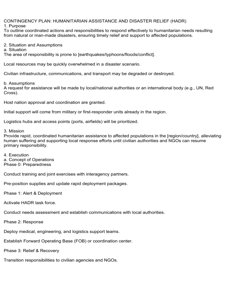 CONTINGENCY PLAN: HUMANITARIAN ASSISTANCE AND DISASTER RELIEF (HADR) 1. Purpose To outline coordinated actions and responsibilities to respond effectively to humanitarian needs resulting from natural or man-made disasters, ensuring timely relief and support to affected populations. 2. Situation and Assumptions a. Situation The area of responsibility is prone to [earthquakes/typhoons/floods/conflict]. Local resources may be quickly overwhelmed in a disaster scenario. Civilian infrastructure, communications, and transport may be degraded or destroyed. b. Assumptions A request for assistance will be made by local/national authorities or an international body (e.g., UN, Red Cross). Host nation approval and coordination are granted. Initial support will come from military or first-responder units already in the region. Logistics hubs and access points (ports, airfields) will be prioritized. 3. Mission Provide rapid, coordinated humanitarian assistance to affected populations in the [region/country], alleviating human suffering and supporting local response efforts until civilian authorities and NGOs can resume primary responsibility. 4. Execution a. Concept of Operations Phase 0: Preparedness Conduct training and joint exercises with interagency partners. Pre-position supplies and update rapid deployment packages. Phase 1: Alert & Deployment Activate HADR task force. Conduct needs assessment and establish communications with local authorities. Phase 2: Response Deploy medical, engineering, and logistics support teams. Establish Forward Operating Base (FOB) or coordination center. Phase 3: Relief & Recovery Transition responsibilities to civilian agencies and NGOs. Provide sustainment support as needed. Prepare for redeployment and demobilization. b. Tasks to Subordinate Units Medical Teams: Set up field hospitals, triage centers. Logistics: Coordinate supply chain management (food, water, shelter). Engineering: Clear roads, restore power/water. Security Forces: Maintain order, protect aid convoys if required. Liaison Officers: Deploy to local government and NGO coordination centers. c. Coordinating Instructions Prioritize life-saving activities and vulnerable populations (e.g., children, elderly). Follow international humanitarian law and host nation regulations. Ensure accountability and tracking of aid. 5. Administration and Logistics a. Logistics Use existing supply chains and air/sea routes. Establish staging areas and forward logistics bases. Coordinate with UN Humanitarian Air Service (UNHAS), WFP, etc. b. Medical Support Field hospitals and CASEVAC plans in place. Coordination with WHO, Red Cross, and local health authorities. c. Transportation Airlift capabilities for personnel and critical supplies. Ground transport via military or contracted assets. d. Sustainment Plan for 30-60 days of sustainment for deployed forces. Resupply via military logistics or international aid corridors. 6. Command and Signal a. Command HADR Command Element (e.g., Joint Task Force or Emergency Operations Center) led by [designated authority]. Clear chain of command and Rules of Engagement (ROE). b. Control Utilize mobile C2 platforms and satellite communications. Integrate with local and international coordination structures (e.g., UN OCHA cluster system). c. Communications Ensure interoperability with civilian agencies. Use redundant communication methods (radio, satellite, mobile networks). Daily SITREPs and coordination briefings.