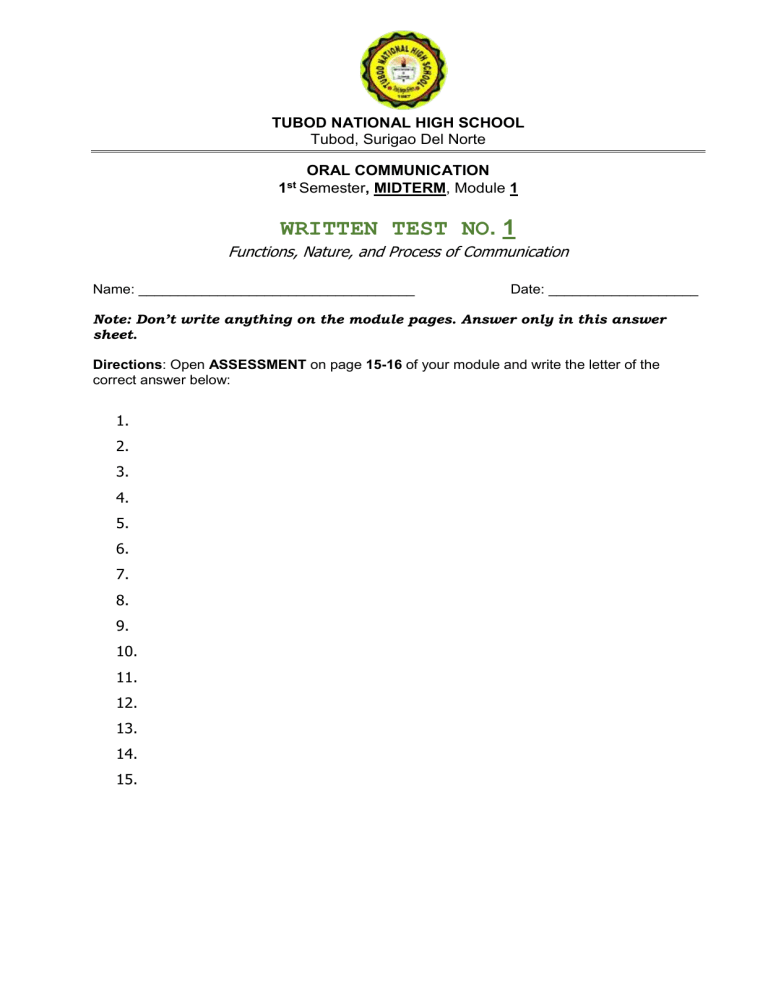 TUBOD NATIONAL HIGH SCHOOL Tubod, Surigao Del Norte ORAL COMMUNICATION 1st Semester, MIDTERM, Module 1 WRITTEN TEST NO. 1 Functions, Nature, and Process of Communication Name: ___________________________________ Date: ___________________ Note: Don’t write anything on the module pages. Answer only in this answer sheet. Directions: Open ASSESSMENT on page 15-16 of your module and write the letter of the correct answer below: 1. 2. 3. 4. 5. 6. 7. 8. 9. 10. 11. 12. 13. 14. 15. TUBOD NATIONAL HIGH SCHOOL Tubod, Surigao Del Norte ORGANIC AGRICULTURE 1st Semester, MIDTERM PERFORMANCE TASK NO. 3 Name: ___________________________________ Date: ___________________ My Composting Lesson 1. What the Video Was About: I watched a video about ________________________________________________________________________ ________________________________________________________________________ ________________________________________________________________________ ________________________________________________________________________ ________ 2. Three Things I Learned: I learned that ____________________________________________________________. I learned that ____________________________________________________________. I learned that ____________________________________________________________. 3. How I Feel About Composting: I think composting is ______________________________________________________ because ________________________________________________________________. 4. My Favorite Part: My favorite part of the video was ____________________________________________ because ________________________________________________________________.