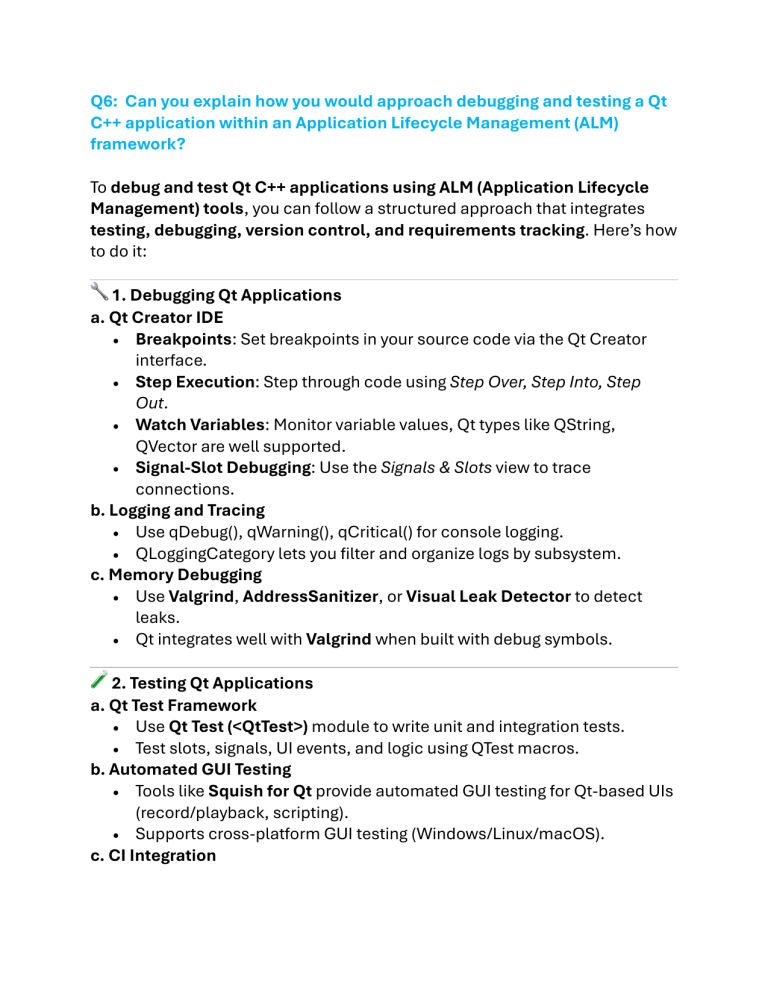 Q6: Can you explain how you would approach debugging and testing a Qt C++ application within an Application Lifecycle Management (ALM) framework? To debug and test Qt C++ applications using ALM (Application Lifecycle Management) tools, you can follow a structured approach that integrates testing, debugging, version control, and requirements tracking. Here’s how to do it: 🔧 1. Debugging Qt Applications a. Qt Creator IDE • Breakpoints: Set breakpoints in your source code via the Qt Creator interface. • Step Execution: Step through code using Step Over, Step Into, Step Out. • Watch Variables: Monitor variable values, Qt types like QString, QVector are well supported. • Signal-Slot Debugging: Use the Signals & Slots view to trace connections. b. Logging and Tracing • Use qDebug(), qWarning(), qCritical() for console logging. • QLoggingCategory lets you filter and organize logs by subsystem. c. Memory Debugging • Use Valgrind, AddressSanitizer, or Visual Leak Detector to detect leaks. • Qt integrates well with Valgrind when built with debug symbols. 🧪 2. Testing Qt Applications a. Qt Test Framework • Use Qt Test (<QtTest>) module to write unit and integration tests. • Test slots, signals, UI events, and logic using QTest macros. b. Automated GUI Testing • Tools like Squish for Qt provide automated GUI testing for Qt-based UIs (record/playback, scripting). • Supports cross-platform GUI testing (Windows/Linux/macOS). c. CI Integration • • Integrate Qt tests with CI tools like Jenkins, GitLab CI, GitHub Actions, etc. Run headless GUI tests using Xvfb (on Linux) for CI pipelines. 🛠 3. Using ALM Tools for Qt C++ Application Lifecycle Management (ALM) integrates requirements, source control, test management, and issue tracking. a. Requirements and Traceability • Use ALM tools like Atlassian Jira, Polarion, CodeBeamer, or Azure DevOps to track feature requirements and link them to code and tests. b. Version Control Integration • Integrate Git or SVN with your ALM system to manage source code history. • Use branching models (e.g., Git Flow) for structured development and testing. c. Test Management • Connect test results from Qt Test or Squish to ALM test plans (via plugins or API). • Track test coverage and link failed tests to bugs. d. Issue/Bug Tracking • Automatically create bug reports from test failures using tools like Jira, Bugzilla, or Redmine. Example Workflow: 1. Develop Qt app in Qt Creator using C++. 2. Write unit tests using Qt Test. 3. Set up Squish for UI automation. 4. Integrate with Git and push code. 5. CI server (e.g., Jenkins) builds the app, runs tests, collects results. 6. Results sync with ALM tools (like Jira or Polarion). 7. Bugs or issues are logged automatically if tests fail. 8. Use the ALM dashboard to trace requirement → implementation → test → result.