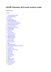 IGCSE Chemistry 2012 exam revision notes by Samuel Lees Contents: 1. The particulate nature of matter 2. Experimental techniques 2.1 Measurement 2.2 (a) Criteria of purity 2.2 (b) Methods of purification 3. Atoms, elements and compounds 3.1 Atomic structure and the Periodic Table 3.2 Bonding the structure of matter 3.2 (a) Ions and ionic bonds 3.2 (b) Molecules and covalent bonds 3.2 (c) Macromolecules 3.2 (d) Metallic bonding 4 Stoichiometry 4.2 The mole concept 5 Electricity and chemistry 6 Chemical energetics 6.2 Energetics of a reaction 6.3 Production of energy 7 Chemical reactions 7.2 Speed of reaction 7.3 Reversible reactions 7.4 Redox 8 Acids, bases and salts 8.2 The characteristic properties of acids and bases 8.3 Types of oxides 8.4 Preparation of salts 8.5 Identification of ions and gases 9 Periodic table 9.2 Periodic trends 9.3 Group properties 9.4 Transition elements 9.5 Noble gases 10 Metals 10.1 Properties of metals 10.2 Reactivity series 10.3 (a) Extraction of metals 10.3 (b) Uses of metals 11 Air and water 12 Sulphur 13 Carbonates 14 Organic chemistry 14.1 Names of compounds 14.2 Fuels 14.3 Homologous series 14.4 Alkanes 14.5 Alkenes 14.6 Alcohols 14.7 Acids 14.8 Macromolecules 14.8 (a) Synthetic polymers 14.8 (b) Natural molecules -stuff in blue is not on the syllabus but it might help you to understand to know those things, or is an example question (in the stoichiometry section) -the section titles are underlined and in bold and in size 14. The sub-sections are only underlined and in bold. -words in red are the ones which you have to know the definition of. 1. The particulate nature of matter Kinetic Theory: All substances are made of atoms, which consist of protons, electrons and neutrons. States of matter: Solid: 1. Strong forces of attraction between particles 2. Have a fixed pattern (lattice) 3. Atoms vibrate but can’t change position therefore fixed volume and shape Liquid: 1. Weaker attractive forces than solids 2. No fixed pattern, liquids take up the shape of their container but have a fixed volume 3. Particles slide past each other. Gas: 1. Almost no intermolecular forces 2. Particles are far apart, and move quickly 3. They collide with each other and bounce in all directions. Changes of state: Condensation and solidification: condensation is when a gas turns back into a liquid. When a gas is cooled, the particles lose energy. They move more and more slowly. When they bump in to each other, they do not have enough energy to bounce away again. They stay close together, and a liquid forms. When a liquid cools, the particles slow down even more. Eventually they stop moving except for vibrations and a solid forms. Evaporation and boiling: evaporation constantly occurs on the surface of liquids. The high energy particles escape from the liquid, even at low temperatures. Boiling occurs at the boiling point (I bet you did not know that) and then the liquid evaporates everywhere in the liquid (not just on the surface) and is much faster. During a change of state the temperature of the mixture does not change. Diffusion: the process in which particles mix/spread by colliding randomly with each other, and bouncing off in all directions. Particles travel in random zigzag motions, this is how smells spread, solids dissolve, dust particles travel in a random way when suspended in air. Evidence for diffusion: In liquids: potassium manganate (VII) in a beaker of water. (The colour will spread as a result of Brownian/random motion, this is dissolving.) In gases: a gas jar of air and a gas jar of bromine are connected, the bromine travels up the tube. Factors that affect the rate of diffusion: Temperature increases → rate of diffusion increases Particle mass decreases → rate of diffusion increases and vice versa (this is shown by the following experiment): Dissolving can be sped up by increasing temperature or stirring 2. Experimental techniques 2.1 Measurement Variable Apparatus Time Stopwatch Clock Temperature Mass Thermometer Balance (liquid in glass, thermistor or thermocouple) Volume -beaker (a) -burette (b) -pipettes (c) -measuring cylinder (d) -gas syringe 2.2 (a) Criteria of purity Paper chromatography: (To separate substances) a drop of the substance is placed at the centre of a piece of filter paper and allowed to dry. Three or four more drops are added to it. Water is dripped on, drip by drip, so the ink spreads creating different coloured circles. Paper + rings = chromatogram. Rings are created because different substances travel at different rates. (To identify substances) Spots of substances placed onto a pencilled line (as ink would separate) which is called the origin, and labelled. Paper goes in solvent, and solvent travels up paper, then paper is taken out. There are spots which have travelled different distances. -Interpreting simple chromatograms: 1. Number of rings/dots = number of substances 2. If two dots travel the same distance up the paper they are the same substance. 3. You can calculate the Rf value to identify a substance, given by the formula: Rf value = distance moved by substance / distance moved by solvent To make colourless substances visible you use a locating agent: 1. Dry paper in oven 2. Spray it with locating agent 3. Heat it for 10 minutes in oven. The stationary phase is the material on which the separation takes place (e.g. the paper). The mobile phase consists of the mixture you want to separate, dissolved in a solvent. Measuring Purity: Pure substances have a definite, sharp meting/boiling point; a substance + impurity has lower melting point and higher boiling point, at a range of temperatures; more impurity means bigger change. This is why salt is used on roads to prevent the formation of ice or to melt ice. Purity is important in drugs and foodstuffs, they cannot contain harmful substances. 2.2 (b) Methods of purification -Filtration: Mixture goes in a funnel with filter paper, into a flask. Residue is insoluble and stays at