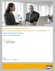 Currency Conversion Guide SAP BusinessObjects Planning and Consolidation 7.5 version for the Microsoft platform version for SAP NetWeaver Target Audience Technical Consultants System Administrators PUBLIC Document version: 1.1 – 08/20/2010 Copyright © Copyright 2010 SAP AG. All rights reserved. No part of this publication may be reproduced or transmitted in any form or for any purpose without the express permission of SAP AG. The information contained herein may be changed without prior notice. Some software products marketed by SAP AG and its distributors contain proprietary software components of other software vendors. Microsoft, Windows, Excel, Outlook, and PowerPoint are registered trademarks of Microsoft Corporation. IBM, DB2, DB2 Universal Database, System i, System i5, System p, System p5, System x, System z, System z10, System z9, z10, z9, iSeries, pSeries, xSeries, zSeries, eServer, z/VM, z/OS, i5/OS, S/390, OS/390, OS/400, AS/400, S/390 Parallel Enterprise Server, PowerVM, Power Architecture, POWER6+, POWER6, POWER5+, POWER5, POWER, OpenPower, PowerPC, BatchPipes, BladeCenter, System Storage, GPFS, HACMP, RETAIN, DB2 Connect, RACF, Redbooks, OS/2, Parallel Sysplex, MVS/ESA, AIX, Intelligent Miner, WebSphere, Netfinity, Tivoli and Informix are trademarks or registered trademarks of IBM Corporation. Linux is the registered trademark of Linus Torvalds in the U.S. and other countries. Adobe, the Adobe logo, Acrobat, PostScript, and Reader are either trademarks or registered trademarks of Adobe Systems Incorporated in the United States and/or other countries. Oracle is a registered trademark of Oracle Corporation. UNIX, X/Open, OSF/1, and Motif are registered trademarks of the Open Group. Citrix, ICA, Program Neighborhood, MetaFrame, WinFrame, VideoFrame, and MultiWin are trademarks or registered trademarks of Citrix Systems, Inc. HTML, XML, XHTML and W3C are trademarks or registered trademarks of W3C®, World Wide Web Consortium, Massachusetts Institute of Technology. Java is a registered trademark of Sun Microsystems, Inc. JavaScript is a registered trademark of Sun Microsystems, Inc., used under license for technology invented and implemented by Netscape. SAP, R/3, SAP NetWeaver, Duet, PartnerEdge, ByDesign, Clear Enterprise, SAP BusinessObjects Explorer and other SAP products and services mentioned herein as well as their respective logos are trademarks or registered trademarks of SAP AG in Germany and other countries. Business Objects and the Business Objects logo, BusinessObjects, Crystal Reports, Crystal Decisions, Web Intelligence, Xcelsius, and other Business Objects products and services mentioned herein as well as their respective logos are trademarks or registered trademarks of SAP France in the United States and in other countries. All other product and service names mentioned are the trademarks of their respective companies. Data contained in this document serves informational purposes only. National product specifications may vary. These materials are subject to change without notice. These materials are provided by SAP AG and its affiliated companies ("SAP Group") for informational purposes only, without representation or warranty of any kind, and SAP Group shall not be liable for errors or omissions with respect to the materials. The only warranties for SAP Group products and services are those that are set forth in the express warranty statements accompanying such products and services, if any. Nothing herein should be construed as constituting an additional warranty. 2010-20-08 PUBLIC 2/20 Icons in Body Text Icon Meaning Caution Example Note Recommendation Syntax Additional icons are used in SAP Library documentation to help you identify different types of information at a glance. For more information, see Help on Help General Information Classes and Information Classes for Business Information Warehouse on the first page of any version of SAP Library. Typographic Conventions Type Style Description Example text Words or characters quoted from the screen. These include field names, screen titles, pushbuttons labels, menu names, menu paths, and menu options. Cross-references to other documentation. Example text Emphasized words or phrases in body text, graphic titles, and table titles. EXAMPLE TEXT Technical names of system objects. These include report names, program names, transaction codes, table names, and key concepts of a programming language when they are surrounded by body text, for example, SELECT and INCLUDE. Example text Output on the screen. This includes file and directory names and their paths, messages, names of variables and parameters, source text, and names of installation, upgrade and database tools. Example text Exact user entry. These are words or characters that you enter in the system exactly as they appear in the documentation. <Example text> Variable user entry. Angle brackets indicate that you replace these words and characters with appropriate entries to make entries in the system. EXAMPLE TEXT Keys on the keyboard, for example, F2 or ENTER. 2010-20-08 PUBLIC 3/20 Table of Contents Currency Conversion................................................................................................................... 5 Setting up an Application ......................................................................................................... 8 Dimension Property Setup ....................................................................................................... 9 Business Rules Setup ............................................................................................................ 13 Defining Script Logic .............................................................................................................. 16 Exchange Rate Import/Update ............................................................................................... 18 Loading Financial Data .................................................