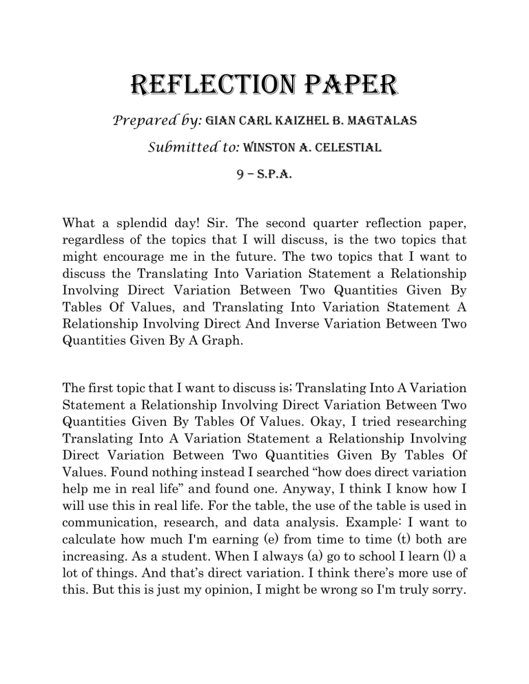 REFLECTION PAPER Prepared by: Gian Carl Kaizhel B. Magtalas Submitted to: Winston A. Celestial 9 – S.P.A. What a splendid day! Sir. The second quarter reflection paper, regardless of the topics that I will discuss, is the two topics that might encourage me in the future. The two topics that I want to discuss the Translating Into Variation Statement a Relationship Involving Direct Variation Between Two Quantities Given By Tables Of Values, and Translating Into Variation Statement A Relationship Involving Direct And Inverse Variation Between Two Quantities Given By A Graph. The first topic that I want to discuss is; Translating Into A Variation Statement a Relationship Involving Direct Variation Between Two Quantities Given By Tables Of Values. Okay, I tried researching Translating Into A Variation Statement a Relationship Involving Direct Variation Between Two Quantities Given By Tables Of Values. Found nothing instead I searched “how does direct variation help me in real life” and found one. Anyway, I think I know how I will use this in real life. For the table, the use of the table is used in communication, research, and data analysis. Example: I want to calculate how much I'm earning (e) from time to time (t) both are increasing. As a student. When I always (a) go to school I learn (l) a lot of things. And that’s direct variation. I think there’s more use of this. But this is just my opinion, I might be wrong so I'm truly sorry. The second topic that I want to discuss is; Translating Into a Variation Statement A Relationship Involving Direct and inverse Variation Between Two Quantities Given By A Graph. In my opinion, it's the same as the table, but instead of the table. It’s a graph so let's apply this in myself. How do I use this in real life? We use graphs to present information quickly and easily. And what about the direct and inverse? Of course, I cannot forget about direct and inverse variations. We all know about direct that when the “x” is increasing then “y” is also increasing because “y” is dependent on “x”. and for the inverse when “y” Increases the “x” is decreasing because like what I said earlier “x” is dependant on “y”. How do I exactly use this in real life? Well, the first thing is graph is also used in businesses like the growth of crops every month graph is used to scale things. for example; over time the harvest action of plants is increasing from time to time. That is direct because the harvest action (h) and the time (t) are both increasing. and for the inverse. For example; in Covid 19 as the virus (v) increases, many people (p) are decreasing or dying. I noticed that you didn’t read my reflection paper, but it's okay I truly understand it because you are very busy. I remember you saying to us that you’ll only read some of the reflection papers because there are too many and you can't read it all. I hope you read this reflection paper. Thank you, sir. I am trying to improve my grammar so if you spot something I'm truly sorry… thank you! Anyway, I may like some games like you did this second quarter. I don’t have much to say and I don’t have any expectations for the upcoming quarter but you’re a great teacher, not gonna lie. Love u 😊 ahhhhhhhhhhhhhhh hi. Mwua AHAHAHHAHHA The growth of a crop varies directly over time