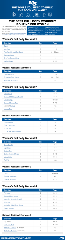 THE TOOLS YOU NEED TO BUILD THE BODY YOU WANT ® Store Workouts Diet Plans Expert Guides Videos Tools THE BEST FULL BODY WORKOUT ROUTINE FOR WOMEN Get in the best shape of your life over the course of the next 12 weeks by using the best full body workout routine for women! Read on and learn more! Link to Workout: https://www.muscleandstrength.com/ workouts/best-full-body-workout-routine-for-women Main Goal: Lose Fat Equipment: Bands, Barbell, Training Level: Beginner Bodyweight, Cables, Dumbbells, Program Duration: 10 Weeks EZ Bar, Exercise Ball, Machines Days Per Week: 4 Days Target Gender: Female Time Per Workout: 60 - 90 Mins Author: M&S Team Women's Full Body Workout 1 Exercise Sets Reps Squat 4 6-8 Leg Press 3 10 - 15 Rear Foot Elevated Split Squat 3 8 - 12 Each Overhead Press 4 8 One Arm Dumbbell Row 4 6-8 Lat Pull Down 3 8 - 12 Sets Reps Hyperextension 3 15 - 20 Single Leg Glute Bridge 3 10 - 15 Each Mini Band Hip Thruster 3 15 Exercise Sets Reps Goblet Squat 3 12 - 15 Dumbbell Stiff Legged Deadlift 3 10 - 12 Lateral Lunge 3 12 Each Dumbbell Bench Press 3 8 - 10 (Assisted) Pull Up 3 Max Inverted Row 3 Max Sets Reps Dumbbell Curl 3 12 Rope Pressdown 3 12 EZ Bar Curl 3 12 EZ Bar Overhead Extension 3 12 Exercise Sets Reps Sumo Deadlift 4 6-8 Hip Thrust 4 6-8 Barbell Row 4 6-8 Seated Dumbbell Press 3 8 - 12 Lateral Raise 3 10 - 12 Push Up 3 Max Sets Reps Plank 3 Max Time Exercise Ball Crunch 3 20 Hanging Leg Raise 3 12 - 15 Exercise Sets Reps Plie Squat 3 12 - 15 Dumbbell Rear Lunge 3 12 - 15 Landmine Romanian Deadlift 3 12 - 15 T-Bar Row 4 8 - 12 Incline Dumbbell Bench Press 3 12 - 15 Cable Face Pull 3 15 - 20 Exercise Sets Reps Fog Pumps 3 20 - 25 Glute Kick Back 3 15 Each Adduction Machine (or Banded) 3 12 Abduction Machine (or Banded) 3 12 Optional Additional Exercises 1 Exercise Women's Full Body Workout 2 Optional Additional Exercises 2 Exercise Women's Full Body Workout 3 Optional Additional Exercises 3 Exercise Women's Full Body Workout 4 Optional Additional Exercises 4 MUSCLEANDSTRENGTH.COM
