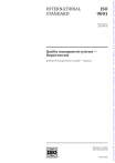 Fifth edition 2015-09-15 Quality management systems — Requirements Systèmes de management de la qualité — Exigences No further reproduction or networking is permitted. © ISO 2015 Distributed by Thomson Reuters (Scientific) LLC, www.techstreet.com. Reference number ISO 9001:2015(E) Copyrighted material licensed to Byron Lollis on 2015-10-13 for licensee's use only. ISO 9001 INTERNATIONAL STANDARD Copyrighted material licensed to Byron Lollis on 2015-10-13 for licensee's use only. ISO 9001:2015(E) No further reproduction or networking is permitted. © ISO 2015, Published in Switzerland All rights reserved. Unless otherwise specified, no part of this publication may be reproduced or utilized otherwise in any form or by any means, electronic or mechanical, including photocopying, or posting on the internet or an intranet, without prior written permission. Permission can be requested from either ISO at the address below or ISO’s member body in the country of the requester. ISO copyright office Ch. de Blandonnet 8 • CP 401 CH-1214 Vernier, Geneva, Switzerland Tel. +41 22 749 01 11 Fax +41 22 749 09 47 copyright@iso.org www.iso.org ii © ISO 2015 – All rights reserved Distributed by Thomson Reuters (Scientific) LLC, www.techstreet.com. COPYRIGHT PROTECTED DOCUMENT Contents Page Foreword...........................................................................................................................................................................................................................................v Introduction................................................................................................................................................................................................................................. vi 1 2 3 4 5 7 Terms and definitions...................................................................................................................................................................................... 1 Context of the organization........................................................................................................................................................................ 1 4.1 Understanding the organization and its context........................................................................................................ 1 4.2 Understanding the needs and expectations of interested parties............................................................... 2 4.3 Determining the scope of the quality management system.............................................................................. 2 4.4 Quality management system and its processes........................................................................................................... 2 Leadership................................................................................................................................................................................................................... 3 5.1 Leadership and commitment...................................................................................................................................................... 3 5.1.1 General...................................................................................................................................................................................... 3 5.1.2 Customer focus................................................................................................................................................................... 3 5.2 Policy................................................................................................................................................................................................................ 4 5.2.1 Establishing the quality policy.............................................................................................................................. 4 5.2.2 Communicating the quality policy..................................................................................................................... 4 5.3 Organizational roles, responsibilities and authorities.......................................................................................... 4 Planning.......................................................................................................................................................................................................................... 4 6.1 Actions to address risks and opportunities.................................................................................................................... 4 6.2 Quality objectives and planning to achieve them....................................................................................................... 5 6.3 Planning of changes............................................................................................................................................................................. 5 Support............................................................................................................................................................................................................................ 6 7.1 Resources...................................................................................................................................................................................................... 6 7.1.1 General...................................................................................................................................................................................... 6 7.1.2 People......................................................................................................................................................................................... 6 7.1.3 Infrastructure..............................................................................................................