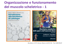 Organizzazione e funzionamento del muscolo scheletrico - 1 Biochimica 6 CFU (Scienze Motorie AA2019-20) – Prof. MISCHIATI Organizzazione della lezione • Cenni sull’organizzazione anatomica del muscolo • La fibra muscolare: citologia • Il sarcomero: o Organizzazione ultrastrutturale o Actina e miosina o Meccanismo molecolare della contrazione: Eccitazione della membrana Accoppiamento eccitazione/contrazione Scorrimento dei filamenti Recupero energetico Biochimica 6 CFU (Scienze Motorie AA2019-20) – Prof. MISCHIATI Il muscolo scheletrico è un organo poiché costituito da cellule di diversi tessuti (cellule del sistema nervoso, del tessuto connettivo e del tessuto muscolare stesso). è l’organo più grande, rappresenta il 40 - 50% del peso totale dell’essere umano. è l’organo più rappresentato, ce ne sono più di 600 in tutto il corpo umano I muscoli - funzioni: • la funzione primaria è muovere le ossa dello scheletro alle quali i muscoli sono collegati tramite i tendini (tessuto connettivo) per produrre il movimento del corpo • mantengono la postura • accumulano e mobilitano sostanze nel corpo generano calore Struttura anatomica del muscolo • • • • EPIMISIO Tessuto connettivo Vasi sanguigni Nervi Fasci di fibre muscolari Tre strati separati di tessuto connettivo rinforzano e Tratto da: Biochimica metabolica dello sport e dell’esercizio fisico proteggono il muscolo: MacLaren & Morton – edi-ermes editore Epimisio, più esterno, racchiude gruppi di fascicoli. Perimisio, avvolge ciascun fascicolo (questi sono formati da dieci a cento fibre muscolari, le cellule muscolari). Endomisio (sarcolemma) contorna ogni fibra muscolare. PERIMISIO FIBRA MUSCOLARE ENDOMISIO Biochimica 6 CFU (Scienze Motorie AA2019-20) – Prof. MISCHIATI Fibra muscolare (cellula muscolare scheletrica) Il numero delle fibre muscolari presenti in un singolo muscolo varia da diverse centinaia a più di un milione • La fibra muscolare ha una forma tipica (allungata-cilindrica) ed è costituita da acqua (75%), proteine (20%), altre sostanze (5%, vitamine, minerali, ioni, aminoacidi, carboidrati e grassi). • Si estende per tutta la lunghezza del muscolo … lunghezza variabile a seconda del muscolo: muscoli dell’occhio lunga pochi millimetri; muscoli della coscia lunga fino a 30 cm • Contiene numerosi mitocondri (in numero variabile a seconda del grado di allenamento della fibra) • È un sincizio plurinucleato (la cellula ha più di cento nuclei) ed ha perso la capacità di replicare (per mitosi) Biochimica 6 CFU (Scienze Motorie AA2019-20) – Prof. MISCHIATI Miogenesi (sviluppo embrionale) La fibra muscolare è un sincizio plurinucleato derivato • I mioblasti moltiplicano quando sono presenti i fattori mitogeni (FGF, TGF e dalla fusione di cellule IGF). mesodermiche (mioblasti) • Smettono di replicare quando viene prodotta la miogenina • Fondono le membrane cellulari per formare un sincizio trasformandosi in miotubi (che non possono più replicare). • Subiscono il processo di «differenziamento» (attivazione dei geni che producono le proteine muscolari specifiche) diventando fibre muscolari con la formazione delle miofibrille contrattili. Tratto da: Introduzione alla Biochimica di Lehninger Nelson & Cox – Zanichelli editore Biochimica 6 CFU (Scienze Motorie AA2019-20) – Prof. MISCHIATI Fibre muscolari • il numero delle fibre muscolari contenute in un muscolo è stabilito alla nascita la crescita del muscolo che avviene dall’adolescenza all’età adulta è solamente dovuta all’aumento di dimensioni delle fibre muscolari preesistenti Biochimica 6 CFU (Scienze Motorie AA2019-20) – Prof. MISCHIATI Cellule satelliti i mioblasti permangono anche durante la vita adulta: cellule satelliti Tratto da: Biochimica metabolica dello sport e dell’esercizio fisico MacLaren & Morton – edi-ermes editore Sono cellule mononucleate con capacità di replicazione. Esse restano quiescenti attorno alla fibra muscolare fino allo stimolo opportuno (infortunio, allenamento intenso, ormoni) Possono differenziare a fibre muscolari mature in condizioni di infortunio o durante l’allenamento intenso, fondendo la loro membrana con quella della fibra muscolare di cui entrano a farne parte (allugamento ed ingrossamento della fibra muscolare). Biochimica 6 CFU (Scienze Motorie AA2019-20) – Prof. MISCHIATI l’aumento della dimensione delle fibre muscolari avviene grazie alla proliferazione di cellule SATELLITI non è dovuto all’aumento del numero delle fibre ma SOLO all’aumento della loro larghezza e lunghezza Le cellule satelliti si moltiplicano e poi si fondono con la fibra muscolare per aumentarne le dimensioni accrescimento della massa muscolare Biochimica 6 CFU (Scienze Motorie AA2019-20) – Prof. MISCHIATI La fibra muscolare (cellula) Tratto da: Introduzione alla Biochimica di Lehninger - Nelson & Cox – Zanichelli editore delimitata esternamente dal Sarcolemma (membrana plasmatica a doppio strato lipidico) che si infila all’interno della fibra come tante dita (tubuli T o tubuli trasversi: estremamente importanti nella contrazione del muscolo, in quanto permettono al potenziale d’azione di propagarsi all’interno delle fibre e di attivare tutto l’apparato contrattile Biochimica 6 CFU (Scienze Motorie AA2019-20) – Prof. MISCHIATI La fibra muscolare (cellula) Il citoplasma delle fibre del muscolo scheletrico (Sarcoplasma) contiene tutti gli organelli subcellulari (mitocondri, nuclei, reticolo sarcoplasmatico, etc.) contiene anche i depositi energetici come il glicogeno muscolare (la forma di deposito dei carboidrati nelle cellule muscolari) e i trigliceridi muscolari (la forma di deposito dei grassi delle cellule muscolari) così come una piccola quantità di ATP. contiene la proteina mioglobina, che funziona come deposito di ossigeno per i mitocondri che lo utilizzano per la produzione di ATP. contiene le miofibrille che sono la componente più abbondante. Biochimi