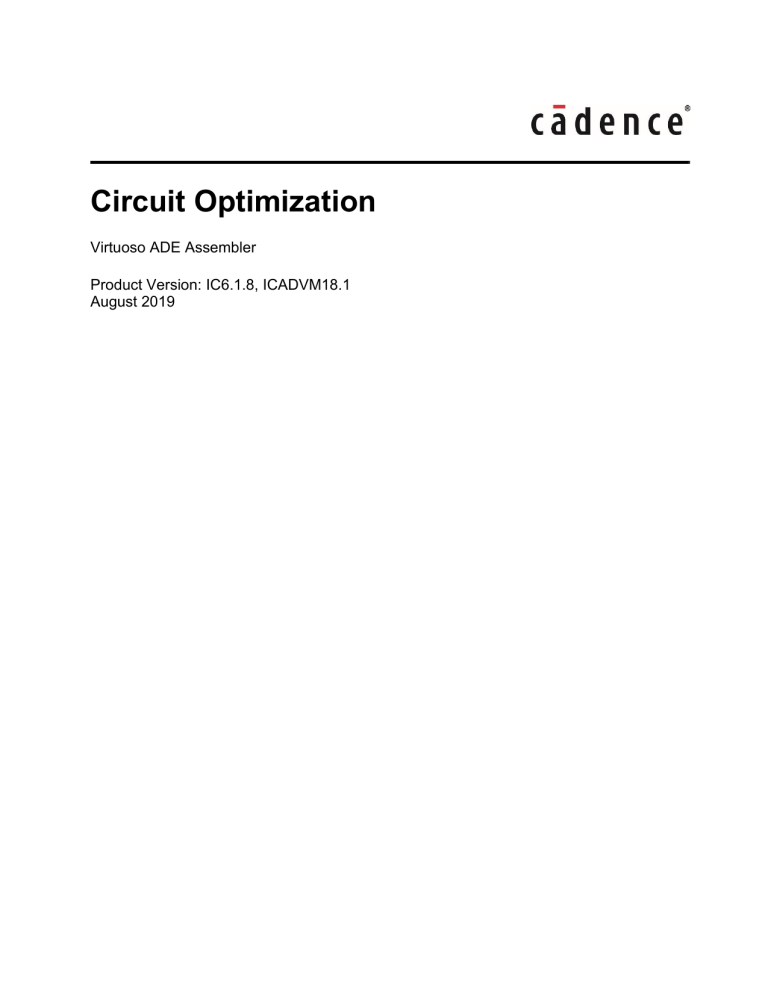 Circuit Optimization Virtuoso ADE Assembler Product Version: IC6.1.8, ICADVM18.1 August 2019 Copyright Statement © 2019 Cadence Design Systems, Inc. All rights reserved worldwide. Cadence and the Cadence logo are registered trademarks of Cadence Design Systems, Inc. All others are the property of their respective holders. Learn more at Cadence Support Portal - https://support.cadence.com © 2019 Cadence Design Systems, Inc. All rights reserved worldwide. Page 2 Circuit Optimization Contents Introduction .............................................................................................................. 4 Intended Audience................................................................................................ 4 Overview .............................................................................................................. 4 Circuit Optimization Overview .................................................................................. 5 Circuit Optimization Definitions ............................................................................. 5 Pros and Cons of Circuit Optimization .................................................................. 8 Circuit Optimization Flow ......................................................................................... 9 Data Preparation .................................................................................................... 11 Setup Common to Global and Local Optimization.................................................. 12 Running Circuit Optimization with Global Optimization .......................................... 21 Running Circuit Optimization with Local Optimization ............................................ 26 Running Circuit Optimization Considering Process Variation ................................. 33 Overall Flow........................................................................................................ 33 Steps to Run Optimization Considering Process Variation ................................. 34 Circuit Optimization Results ................................................................................... 41 Results ............................................................................................................... 41 Comparison between Manual Design and Circuit Optimization Design .............. 42 Support .................................................................................................................. 42 Feedback ............................................................................................................... 42 Learn more at Cadence Support Portal - https://support.cadence.com © 2019 Cadence Design Systems, Inc. All rights reserved worldwide. Page 3 Circuit Optimization Introduction This document describes the application of circuit optimization using Virtuoso ADE. Intended Audience The audience includes circuit designers who are interested in reducing the time and effort spent in sizing the circuit device parameters to meet the specifications over corners. Overview This document focuses on the steps to apply circuit optimization. Learn more at Cadence Support Portal - https://support.cadence.com © 2019 Cadence Design Systems, Inc. All rights reserved worldwide. Page 4 Circuit Optimization Circuit Optimization Overview This chapter describes circuit optimization and algorithm types. Circuit Optimization Definitions Circuit optimization is an iterative mathematical process to search the circuit design space to find the most optimal solution without simulating all possible combinations as in a brute force sweep. The optimization algorithm does not have circuit knowledge itself. The algorithm attempts to solve a mathematical optimization problem. • • Device parameters with sweep ranges Output measurements including specification targets Circuit Optimization Optimal Solution Figure 1 Optimization Flow Overview Inputs to optimization include the circuit device parameters, output measurements, and target specifications. The device parameter ranges define the design space. Learn more at Cadence Support Portal - https://support.cadence.com © 2019 Cadence Design Systems, Inc. All rights reserved worldwide. Page 5 Circuit Optimization The optimizer varies device parameter values (within the allowed ranges defined by the user), simulates the circuit, and determines the cost of each simulated design point. The goal is to minimize the cost. A design point (candidate circuit for simulation) that meets all specifications has lower cost than a design point which fails to meet one or more specifications. Circuit Performance Cost Starting Point Local Optimum Global Optimum Input Parameter Figure 2 One-Dimension Example of Global and Local Optimum Global Optimization Global optimization searches multiple areas of the circuit design space to find the global minimum cost and optimal design point. The Virtuoso ADE global optimizer is based on the proven NeoCircuit technology, now in use for more than 15 years (Neolinear developed NeoCircuit and was acquired by Cadence). The global optimizer applies machine learning techniques to circuit optimization. Local Optimization Local optimization begins with a starting point and searches locally for the optimal solution. Given the one-dimensional example of Figure 2, local optimization searches the curve around the starting point and applies sensitivity analysis to determine the search direction. Learn more at Cadence Support Portal - https://support.cadence.com © 2019 Cadence Design Systems, Inc. All rights reserved worldwide. Page 6 Circuit Optimization The Virtuoso ADE local optimization algorithms are based on publicly documented methods. BFGS is the default and recommended local optimization algorithm in Virtuoso ADE. Algorithm Description BFGS Broyden-Fletcher-Goldfarb-Shanno algorithm. This is the default and recommended algorithm for local optimization. BFGS is a gradient-based method. Gradient