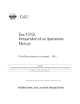 Doc 10153 Preparation of an Operations Manual First Edition (Advance unedited) — 2021 Disclaimer This document is an unedited version of an ICAO publication and has not yet been approved in final form. As its content may still be supplemented, removed, or otherwise modified during the editing process, ICAO shall not be responsible whatsoever for any costs or liabilities incurred as a result of its use. Approved by and published under the authority of the Secretary General INTERNATIONAL CIVIL AVIATION ORGANIZATION FOREWORD The original Preparation of an Operations Manual (Doc 9376) was published in 1997 and was not subsequently updated. A task to review and update this document began in 2016, but it was then determined that a revision was not possible due to the number of amendments required. Doc 9376 was therefore rendered obsolete and a complete redraft of the material was undertaken. This manual provides updated guidance material on those parts of the Operations Manual (OM) which are usually developed by the operator. An essential element leading to the approval of an OM is the development and specification of an appropriate approach to the supervision of operations; this manual has been prepared to provide guidance for regulators on developing such supervisory capability. In addition, the OM serves a primary role in regulatory oversight and the issuance of an air operator certificate. This manual is not written as a checklist against which the contents of an OM should be compared, nor does it purport to be totally comprehensive as to the possible contents of an OM. It is intended to identify the topics that should be considered by the operator in developing an OM and in accordance with the specifications in Annex 6 — Operation of Aircraft, Part I — International Commercial Air Transport — Aeroplanes (and specifically in its Appendix 2). The contents of a particular OM depend on many factors, not the least of which are the number and different types of aircraft being operated. The geographical extent of the operation is another significant factor in the determination of content. In selecting the contents of an OM, the guiding principle should be to decide, in a pragmatic and common sense manner, what information and guidance must be included to ensure a safe and efficient operation. The operator should be allowed the greatest possible latitude in developing an OM specific to the operation and commensurate with the international obligations and requirements of the State of the Operator. In preparing this manual, the requirements of a number of States were examined, as were a selection of OMs. Throughout this document when a Standard, recommended practice or guidance material being discussed is based on the provisions of Annex 6, Part I, the term “aeroplane” is used. This manual is also intended to be a companion document to the Manual of Procedures for Operations Inspection, Certification and Continued Surveillance (Doc 8335). Whilst this manual is directed towards operations with aeroplanes, it can be used as a guide to the requirements for an OM in operations using other types of aircraft (e.g., helicopters). Comments on this manual, particularly with respect to its application, usefulness and scope of coverage, would be appreciated from States and operators. These will be taken into consideration in the preparation of subsequent editions. Please address your comments to: The Secretary General International Civil Aviation Organization 999 Robert Bourassa Street Montréal, Quebec Canada H3C 5H7 ______________________ (i) TABLE OF CONTENTS Page Glossary .......................................................................................................................................................... List of acronyms ......................................................................................................................................... Definitions................................................................................................................................................... Reference Documents ................................................................................................................................ (iii) (iii) (v) (xi) Chapter 1. INTRODUCTION.......................................................................................................................... 1-1 Chapter 2. 2.1 2.2 2.3 2.4 ADMINISTRATION AND CONTROL OF THE OPERATIONS MANUAL ................................... Requirement for an operations manual ........................................................................................ Volumes of an operations manual ................................................................................................ Organization of the operations manual ........................................................................................ Electronic flight bag (EFB) ........................................................................................................... 2-1 2-1 2-2 2-6 2-8 Chapter 3. 3.1 3.2 3.3 3.4 3.5 OPERATIONS ADMINISTRATION AND SUPERVISION ........................................................... General ........................................................................................................................................ Flight operations manager ........................................................................................................... Chief pilot ..................................................................................................................................... Training manager ......................................................................................................................... Safety manager ............................................................................................................................ 3-1 3-1 3-2 3-2 3-2 3-2 Chapter 4. 4.1 4.2 4.3 4.4 4.5 4.6 4.7 4.8 4.9 4.10 4.11 TRAININ