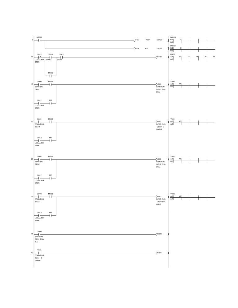 M8002 0 MOV H4081 D8120 D8120 B/D 1 B/D MOV K11 D8121 D8121 B/D 6 B/D X012 X010 X011 11 M100 LOCAL/MA START M100 A/S 13 A/S STOP STER M100 Y000 Y000 A/S SYNC EN X000 M100 SINKRON A/S GEN1 GEN1 ENA 17 41 BLE X012 M0 LOCAL/MA STER X001 M100 23 DEAD BUS GEN1 Y001 Y001 A/S DEAD BUS A/S 43 GEN 1 E NABLE X012 M1 LOCAL/MA STER X002 M100 Y002 Y002 A/S SYNC EN SINKRON A/S GEN2 GEN2 ENA 29 45 BLE X012 M2 LOCAL/MA STER X003 M100 35 DEAD BUS GEN2 Y003 Y003 A/S DEAD BUS A/S GEN2 EN ABLE X012 M3 LOCAL/MA STER Y000 41 M200 SINKRON GEN1 ENA BLE Y001 43 M201 DEAD BUS GEN 1 E NABLE 47 18 24 30 36 Y002 45 M202 SINKRON GEN2 ENA BLE Y003 47 M203 DEAD BUS GEN2 EN ABLE X013 M211 M211 A/S 57 69 PLN ENAB PLN 1ST B/D 60 72 LE ON 61 75 70 73 49 X014 Y005 Y004 Y004 A/S 58 GEN 1 EN GEN 2 BU GEN 1 BU B/D 55 ABLE S S 51 X015 Y004 Y005 Y005 A/S 63 GEN 2 EN GEN 1 BU GEN 2 BU B/D 52 ABLE S S D0 A/S 82 54 M211 Y004 X006 X004 PLN 1ST GEN 1 BU SYNCH TO RPR 1 KONTAKTO ON S PLN R GEN 1 57 Y006 M211 Y004 PLN 1ST GEN 1 BU ON S Y005 X007 X014 GEN 2 BU SYCN 2 G GEN 1 EN S EN ABLE M211 Y005 PLN 1ST GEN 2 BU SYNCH TO RPR2 X006 X005 KONTAKTO ON S PLN R GEN 2 69 Y007 M211 Y005 PLN 1ST GEN 2 BU ON S Y004 X007 X015 GEN 1 BU SYCN 2 G GEN 2 EN S EN ABLE M8000 81 MOV D0 D10 A/S D10 B/D 82 B/D M8000 87 MOV D1 D11 D1 A/S 88 A/S D11 B/D B/D 88 93 END