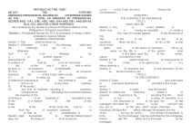 REPUBLIC ACT NO. 10607 AN ACT STRENGTHENING THE INSURANCE INDUSTRY, FURTHER AMENDING PRESIDENTIAL DECREE NO. 612, OTHERWISE KNOWN AS THE INSURANCE CODE, AS AMENDED BY PRESIDENTIAL DECREE NOS. 1141, 1280, 1455, 1460, 1814 AND 1981, AND BATAS PAMBANSA BLG. 874, AND FOR OTHER PURPOSES Be it enacted by the Senate and House of Representatives of the Philippines in Congress assembled: Section 1. Presidential Decree No. 612, as amended, is hereby further amended to read as follows: GENERAL PROVISIONS Section 1. This Decree shall be known as ‘The Insurance Code’. Section 2. Whenever used in this Code, the following terms shall have the respective meanings hereinafter set forth or indicated, unless the context otherwise requires: (a) A contract of insurance is an agreement whereby one undertakes for a consideration to indemnify another against loss, damage or liability arising from an unknown or contingent event. A contract of suretyship shall be deemed to be an insurance contract, within the meaning of this Code, only if made by a surety who or which, as such, is doing an insurance business as hereinafter provided. (b) The term doing an insurance business or transacting an insurance business, within the meaning of this Code, shall include: (1) Making or proposing to make, as insurer, any insurance contract; (2) Making or proposing to make, as surety, any contract of suretyship as a vocation and not as merely incidental to any other legitimate business or activity of the surety; (3) Doing any kind of business, including a reinsurance business, specifically recognized as constituting the doing of an insurance business within the meaning of this Code; (4) Doing or proposing to do any business in substance equivalent to any of the foregoing in a manner designed to evade the provisions of this Code. In the application of the provisions of this Code, the fact that no profit is derived from the making of insurance contracts, agreements or transactions or that no separate or direct consideration is received therefor, shall not be deemed conclusive to show that the making thereof does not constitute the doing or transacting of an insurance business. (c) As used in this Code, the term Commissioner means the Insurance Commissioner. CHAPTER I THE CONTRACT OF INSURANCE TITLE 1 WHAT MAY BE INSURED Section 3. Any contingent or unknown event, whether past or future, which may damnify a person having an insurable interest, or create a liability against him, may be insured against, subject to the provisions of this chapter. The consent of the spouse is not necessary for the validity of an insurance policy taken out by a married person on his or her life or that of his or her children. All rights, title and interest in the policy of insurance taken out by an original owner on the life or health of the person insured shall automatically vest in the latter upon the death of the original owner, unless otherwise provided for in the policy. Section 4. The preceding section does not authorize an insurance for or against the drawing of any lottery, or for against any chance or ticket in a lottery drawing a prize. Section 5. All kinds of insurance are subject to the provisions of this chapter so far as the provisions can apply. TITLE 2 PARTIES TO THE CONTRACT Section 6. Every corporation, partnership, or association, duly authorized to transact insurance business as elsewhere provided in this Code, may be an insurer. Section 7. Anyone except a public enemy may be insured. Section 8. Unless the policy otherwise provides, where a mortgagor of property effects insurance in his own name providing that the loss shall be payable to the mortgagee, or assigns a policy of insurance to a mortgagee, the insurance is deemed to be upon the interest of the mortgagor, who does not cease to be a party to the original contract, and any act of his, prior to the loss, which would otherwise avoid the insurance, will have the same effect, although the property is in the hands of the mortgagee, but any act which, under the contract of insurance, is to be performed by the mortgagor, may be performed by the mortgagee therein named, with the same effect as if it had been performed by the mortgagor. Section 9. If an insurer assents to the transfer of an insurance from a mortgagor to a mortgagee, and, at the time of his assent, imposes further obligations on the assignee, making a new contract with him, the acts of the mortgagor cannot affect the rights of said assignee. TITLE 3 INSURABLE INTEREST Section 10. Every person has an insurable interest in the life and health: (a) Of himself, of his spouse and of his children; (b) Of any person on whom he depends wholly or in part for education or support, or in whom he has a pecuniary interest; (c) Of any person under a legal obligation to him for the payment of money, or respecting property or services, of which death or illness might delay or prevent the performance; and (d) Of any person upon whose life any estate or interest vested in him depends. Section 11. The insured shall have the right to change the beneficiary he designated in the policy, unless he has expressly waived this right in said policy. Notwithstanding the foregoing, in the event the insured does not change the beneficiary during his lifetime, the designation shall be deemed irrevocable. Section 12. The interest of a beneficiary in a life insurance policy shall be forfeited when the beneficiary is the principal, accomplice, or accessory in willfully bringing about the death of the insured. In such a case, the share forfeited shall pass on to the other beneficiaries, unless otherwise disqualified. In the absence of other beneficiaries, the proceeds shall be paid in accordance with the policy contract. If the policy contract is silent, the proceeds shall be paid to the estate of the insured. Section 13. Every interest in property, whether real or personal, or any relation thereto, or liability in respect thereof, of such nature tha
