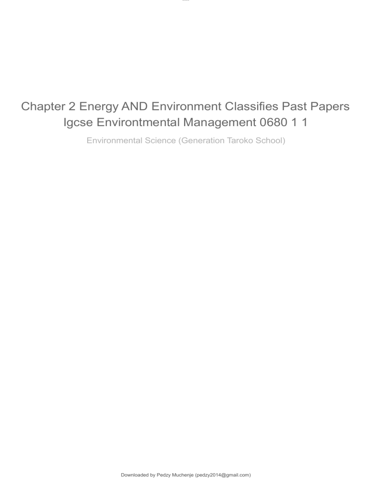 lOMoAR cPSD| 55726887 Chapter 2 Energy AND Environment Classifies Past Papers Igcse Environtmental Management 0680 1 1 Environmental Science (Generation Taroko School) Downloaded by Pedzy Muchenje (pedzy2014@gmail.com) lOMoAR cPSD| 55726887 2 The photograph shows an energy resource being used to generate electricity. (a) Name the energy resource in the photograph. [1] (b) Suggest one advantage and one disadvantage of using the energy resource shown in the photograph compared with using fossil fuels. [2] (c) Using electricity in a house can be expensive. Describe two strategies to reduce the amount of electricity used in a house. [2] [Total: 5] © UCLES 2020 0680/11/O/N/20 Downloaded by Pedzy Muchenje (pedzy2014@gmail.com) lOMoAR cPSD| 55726887 14 (e) Look at the diagram of a geothermal power station. turbine steam hot water generator cooling tower cold water rock Using the diagram, explain how electricity is produced in a geothermal power station. (i) . [4] (ii) Suggest why Iceland generates much of its electricity from geothermal power stations. [1] (iii) Is geothermal energy a sustainable energy source? Give reasons for your answer. [3] Downloaded by Pedzy Muchenje (pedzy2014@gmail.com) lOMoAR cPSD| 55726887 (iv) Much of the world’s electricity is generated using fossil fuels. Explain why environmental groups want to reduce the use of fossil fuels. [4] (f) Are the advantages of living in an area of active volcanoes greater than the disadvantages? Give reasons for your answer. [6] © UCLES 2016 0680/22/M/J/16 Downloaded by Pedzy Muchenje (pedzy2014@gmail.com) lOMoAR cPSD| 55726887 (b) Solar power is an example of an alternative energy source. (i) Suggest three reasons why many countries are increasing their use of solar power. [3] (ii) Give reasons why relying on solar power as a source of energy can be a problem. [3] (c) State two other alternative energy sources. [1] Downloaded by Pedzy Muchenje (pedzy2014@gmail.com) lOMoAR cPSD| 55726887 13 © UCLES 2018 7 0680/11/M/J/18 [Turn over (a) Describe the formation of oil. millions of years ago; plants / animals / plankton, died, fell to bottom of sea; covered by (layers of) mud or sediment; this increased the heat and pressure; this changed the animal and plant remains into crude oil; requires an aerobic conditions; [3] (b) Describe the advantages and disadvantages of oil as an energy resource. advantages maximum three from, advantages: (as a liquid oil) can be easily, pumped / transported / piped; (oil is) versatile in use (e.g. fuel for heating, cars, commercial vehicles, planes, ships, generating electricity);idea of ease of current use;idea of energy dense fuel;oil is widely available; disadvantages (oil is) non-renewable; releases carbon dioxide when burned, which causes, enhanced greenhouse effect / global warming; releases, oxides of nitrogen / sulfur oxides when burned, which causes acid rain; oil spills very damaging to, habitats / wildlife; [4] need to refine oil; [Turn over © UCLES 2019 0680/11/M/J/19 Downloaded by Pedzy Muchenje (pedzy2014@gmail.com) lOMoAR cPSD| 55726887 14 (c) The map shows average oil consumption per person in 2015. medium oil consumption per person high oil consumption per person (i) State the continent where oil use per person is low in all countries. Africa [1] (ii) State the continent with high oil use per person. North America; [1] (iii) Explain why oil use per person is much higher in some countries than in others. any three from: availability of oil explained (some countries have more oil than others); wealth / some countries can afford more; higher use of, vehicles / electrical appliances / dishwashers / fridge / freezer / TV; technological, advances / development, so more industry in developed © UCLES 2019 0680/11/M/J/19 Downloaded by Pedzy Muchenje (pedzy2014@gmail.com) lOMoAR cPSD| 55726887 15 countries; to generate (more) electricity (for, industry / households); greater need for heating in cold countries; greater need for air conditioning in hot countries; some countries don’t need oil because they have alternatives readily available (e.g. geothermal [3] in Iceland); price of oil varies between countries; (d) The map shows the location of oil spills in a seven-year period in the seas around part of north-west Europe. (i) Describe the distribution of the oil spills shown on the map. any three from: most in southern North Sea; in a line from, Belgium / north France to, Denmark / Norway; greatest concentration off, Belgium / Netherlands coast; scattered in, (northern) North Sea / off coast of Norway; (line through) the English Channel; cluster, off the North West coast of France / west of English Channel; along major shipping routes; [3] © UCLES 2019 0680/11/M/J/19 Downloaded by Pedzy Muchenje (pedzy2014@gmail.com) lOMoAR cPSD| 55726887 16 [Turn over (ii) Discuss strategies for minimising the impact of oil spills at sea. any three from: booms (to trap oil); detergents (to break up oil); skimmers (to remove oil from the surface); burning the oil on the sea surface; manual / mechanical, collection of oil washed up on beaches; [3] [Total: 18] Permission to reproduce items where third-party owned material protected by copyright is included has been sought and cleared where possible. Every reasonable effort has been made by the publisher (UCLES) to trace copyright holders, but if any items requiring clearance have unwittingly been included, the publisher will be pleased to make amends at the earliest possible opportunity. To avoid the issue of disclosure of answer-related information to candidates, all copyright acknowledgements are reproduced online in the Cambridge Assessment International Education Copyright Acknowledgements Booklet. This is produced for each series of examinations and is freely available to download at www.cambridgeinternational.org after the live examination series. Cambridge Assessment International Education is part of the Cambridge Assessment Group. Cambridge Assessment i