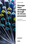 Benchmark Insights Stronger M&A strategies through AI-driven processes Ten tenets for electronics companies How IBM can help IBM partners with electronics companies to create secure, connected, and data-rich user experiences that continuously deliver insight and advantage. We help build enterprises and devices that can understand, reason, and learn. We bring expertise in strategy, platforms, the Internet of Things (IoT), AI, blockchain, security, and ERP. We define and design next-generation approaches and unique market plays across integrated and vertical high-performing platforms and ecosystems. We turn solutions, software, and data into fluid and forward-focused innovation engines. For more information, visit ibm.com/electronics. By Paul Price, Bruce Anderson, Christophe Begue, Lisa Fisher, and Cristene Gonzalez-Wertz Talking points The M&A route to reinvention Our analysis discovered ten tenets to embed analytics and automation into the M&A process. These tenets can help find high value targets, identify and reduce potential risks, and elevate a company’s portfolio above any one transaction. Automation, analytics, and AI are critical to scoping and scaling these tenets throughout the M&A cycle. Globally, organizations spent USD 4.1 trillion on mergers and acquisitions (M&A) in 2018.1 A significant chunk of capital changed hands: 44 deals were each worth over USD 10 billion.2 Governance, organization, and process, coupled with analytics and AI, define three distinct capability models for modern M&A execution. Our research revealed that companies fall within the Old Guard, New Guard, or Vanguard models. Leading Vanguard organizations report the highest use of automation, analytics, and AI in both the early and later stages M&A processes. Electronics companies demonstrate quantifiable success through merger and acquisitions (M&A) strategies. Companies choosing M&A to expand their market presence or geographic reach have increased their overall market share from an average of 22 percent pre-merger to 26 percent post-merger. The electronics industry is no stranger to M&A. Recent examples include Hitachi’s acquisition of ABB’s Power Grids business to create economies of scale.3 Apple purchased Intel’s mobile modem business to increase control of its supply chain.4 And Siemens purchased Mendix to accelerate research and development for lowcode environments.5 Large acquisitions reshape the marketplace, and powerhouse deals indicate the industry’s fundamental shifts and transformations (see Figure 1). Figure 1 How M&As both perpetuate and reflect industry trends Strategy Industry development M&A deal Breaking down boundaries Entering new markets, and creating capabilities or business models Whirlpool bought Yummly in 2017 to add services to connected appliances6 Microsoft purchased Nokia in 2013 for USD 7.6B7 SoftBank bought ARM in 2016 for USD 31.4B8 Crossing industry boundaries into automotive or mobility Intel purchased Mobileye in 2017 for USD 15B9 Samsung purchased Harman in 2017 for USD 8B10 Cloudenabled business models Shifting from hardware to software and services Cisco acquired MindMeld in 2017 to bring conversational AI to its products11 Moving from single points of purchase to more continuous revenue streams Dell purchased EMC in 2015 for USD 67B12 Enhanced efficiencies Pursuing verticalization/ consolidation for improved control, costs, and speed to market NXP bought Freescale for USD 11.8B in 201513 From physical to digital, and vice versa Co-mingling digital and physical presences Amazon purchased Whole Foods in 2017 for USD 13.7B14 1 30% of electronics companies have higher levels of M&A automation and intelligence, with higher performance gains 58% of total projected synergies were realized by surveyed electronics companies Electronics companies in our study that acquired unique IP reduced their time-to-market by 22% M&A deals are complex, time-consuming, and inherently risky. It takes electronics companies an average of 52 weeks to execute the M&A process from strategy to integration. On average, they achieve about 58 percent of projected synergies, taking an additional 56 weeks to do so. Respondents report taking 100 weeks post integration to realize a profit. Using analytics and AI to advance the M&A process It’s mission critical for buyers and sellers to know if their organizations can blend successfully. Until two organizations move beyond “dating” to merging, “mismatches” are a risk. How can organizations quantify and avoid them? As we embarked on the 2019 Cross-Industry M&A Benchmark Study, we knew that organizations were examining how advanced analytics and AI could answer these questions—and improve overall M&A performance. Less clear were: – What dimensions of the M&A functions (either on their own or as part of the larger corporate development structure) differentiate organizations and performance? – To what extent are companies applying advanced analytics and AI throughout the M&A lifecycle, and how are they applying them? – To what extent have analytics and AI improved M&A performance? Time kills deals, says the old adage. But what makes some deals—and more importantly some organizations— successful? 2 This approach to M&A is not simply about better strategy or better integration approaches. Organizations need both. About our research To better understand strategies behind M&A success, the IBM Institute for Business Value (IBV), in cooperation with Oxford Economics, surveyed leaders from 720 organizations across the electronics, chemicals and petroleum, and healthcare and life sciences industries. Respondents spanned 18 countries and included 280 electronics leaders. Each respondent holds overall responsibility for the M&A process, from the definition of M&A strategy to post-purchase integration. (See “Study approach and methodology” on page 18). Figure 2 Our research shows how high value contributors are driving effective, ino