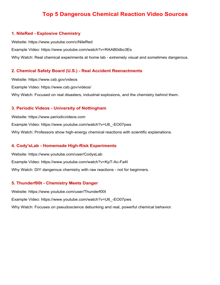 Top 5 Dangerous Chemical Reaction Video Sources 1. NileRed - Explosive Chemistry Website: https://www.youtube.com/c/NileRed Example Video: https://www.youtube.com/watch?v=RAAB0dbc3Es Why Watch: Real chemical experiments at home lab - extremely visual and sometimes dangerous. 2. Chemical Safety Board (U.S.) - Real Accident Reenactments Website: https://www.csb.gov/videos Example Video: https://www.csb.gov/videos/ Why Watch: Focused on real disasters, industrial explosions, and the chemistry behind them. 3. Periodic Videos - University of Nottingham Website: https://www.periodicvideos.com Example Video: https://www.youtube.com/watch?v=U6_-EO07pws Why Watch: Professors show high-energy chemical reactions with scientific explanations. 4. Cody'sLab - Homemade High-Risk Experiments Website: https://www.youtube.com/user/CodysLab Example Video: https://www.youtube.com/watch?v=KpT-Ac-Fa4I Why Watch: DIY dangerous chemistry with raw reactions - not for beginners. 5. Thunderf00t - Chemistry Meets Danger Website: https://www.youtube.com/user/Thunderf00t Example Video: https://www.youtube.com/watch?v=U6_-EO07pws Why Watch: Focuses on pseudoscience debunking and real, powerful chemical behavior.