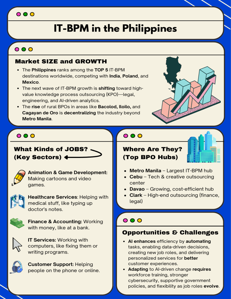 IT-BPM in the Philippines Market SIZE and GROWTH The Philippines ranks among the TOP 5 IT-BPM destinations worldwide, competing with India, Poland, and Mexico. The next wave of IT-BPM growth is shifting toward highvalue knowledge process outsourcing (KPO)—legal, engineering, and AI-driven analytics. The rise of rural BPOs in areas like Bacolod, Iloilo, and Cagayan de Oro is decentralizing the industry beyond Metro Manila. What Kinds of JOBS? (Key Sectors) Animation & Game Development: Making cartoons and video games. Healthcare Services: Helping with medical stuff, like typing up doctor's notes. Finance & Accounting: Working with money, like at a bank. IT Services: Working with computers, like fixing them or writing programs. Customer Support: Helping people on the phone or online. Where Are They? (Top BPO Hubs) Metro Manila – Largest IT-BPM hub Cebu – Tech & creative outsourcing center Davao – Growing, cost-efficient hub Clark – High-end outsourcing (finance, legal) Opportunities & Challenges AI enhances efficiency by automating tasks, enabling data-driven decisions, creating new job roles, and delivering personalized services for better customer experiences. Adapting to AI-driven change requires workforce training, stronger cybersecurity, supportive government policies, and flexibility as job roles evolve.
