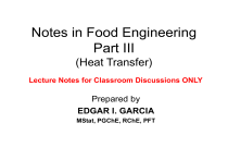 Notes in Food Engineering Part III (Heat Transfer) Lecture Notes for Classroom Discussions ONLY Prepared by EDGAR I. GARCIA MStat, PGChE, RChE, PFT HEAT TRANSFER THEORY • Heat transfer is an operation that occurs repeatedly in the food industry (cooking, baking, drying, sterilizing or freezing) • Heat transfer is a dynamic process in which heat is transferred spontaneously from one body to another cooler body. • The rate of heat transfer depends upon the differences in temperature between the bodies, the greater the difference in temperature, the greater the rate of heat transfer. HEAT TRANSFER THEORY • Temperature difference and the resistance to heat flow, affect the rate of heat transfer. These factors are connected by the general equation: rate of transfer = driving force / resistance For heat transfer: rate of heat transfer = temperature difference/ heat flow resistance of medium HEAT TRANSFER THEORY • During processing, temperatures may change and therefore the rate of heat transfer will change. This is called unsteady state heat transfer (ex. heating and cooling of cans in a retort to sterilize the contents) • Steady state heat transfer when the temperatures do not change. • Heat can be transferred in three ways: by conduction, by radiation and by convection. • Conduction – The transfer of heat or electric current from one substance to another by direct contact • Convection – The transfer of heat through a fluid (liquid or gas) caused by molecular motion • Radiation – Energy that is radiated or transmitted in the form of rays or waves of particles HEAT CONDUCTION • In the case of heat conduction, the equation, rate = driving force/resistance, can be applied directly. The driving force is the temperature difference per unit length of heat-transfer path, also known as the temperature gradient. Instead of resistance to heat flow, its reciprocal called the conductance is used. This changes the form of the general equation to: • rate of heat transfer = driving force x conductance, that is: dQ/dt = kA dT/dx (eq 5.1) • where dQ/dt is the rate of heat transfer, the quantity of heat energy transferred per unit of time, A is the area of crosssection of the heat flow path, dT/dx is the temperature gradient, that is the rate of change of temperature per unit length of path, and k is the thermal conductivity of the medium. Notice the distinction between thermal conductance, which relates to the actual thickness of a given material (k/x) and thermal conductivity, which relates only to unit thickness. HEAT CONDUCTION • The units of k, the thermal conductivity, can be found from eqn. (5.1) by transposing the terms k = dQ/dt x 1/A x 1/(dT/dx) • = J s-1 x m-2 x 1/(°C m-1) = J m-1 s-1 °C-1 • Equation (5.1) is known as the Fourier equation for heat conduction • Note: Heat flows from a hotter to a colder body, that is in the direction of the negative temperature gradient. Thus a minus sign should appear in the Fourier equation. Conduction through a Slab • Figure 5.1. Heat conduction through a slab Conduction through a Slab • If a slab of material, as shown in Fig. 5.1, has two faces at different temperatures T1 and T2 heat will flow from the face at the higher temperature T1 to the other face at the lower temperature T2. • The rate of heat transfer is given by Fourier's equation: • dQ/dt = kA ΔT/Δx = kA dT/dx • Under steady temperature conditions dQ/dt = constant, which may be called q: and so q = kA dT/dx • but dT/dx, the rate of change of temperature per unit length of path, is given by (T1 - T2)/x where x is the thickness of the slab, • so q = kA(T1 - T2)/x or q = kA ΔT/x = (k/x)A ΔT (5.2) • This may be regarded as the basic equation for simple heat conduction. It can be used to calculate the rate of heat transfer through a uniform wall if the temperature difference across it and the thermal conductivity of the wall material are known. EXAMPLE. Rate of heat transfer in cork • A cork slab 10 cm thick has one face at -12°C and the other face at 21°C. If the mean thermal conductivity of cork in this temperature range is 0.042 J m-1 s-1 °C-1, what is the rate of heat transfer through 1 m2 of wall? • T1 = 21°C T2 = -12°C ΔT = 33°C A = 1 m2 k = 0.042 J m-1 s-1 °C-1 x = 0.1 m q = [0.042 / 0.1] (1) (33) = 13.9 J s-1 Heat Conductances • Heat conductances are sometimes used instead of thermal conductivities. • Heat conductance is the quantity of heat that will pass in unit time, through unit area of a specified thickness of material, under unit temperature difference, • For a thickness x of material with a thermal conductivity of k in J m-1 s-1 °C-1, the conductance is k/x = C and the units of conductance are J m-2 s-1 °C-1. • Heat conductance = C = k/x. Figure 5.2 Heat conductances in series • Frequently in heat conduction, heat passes through several consecutive layers of different materials. For example, in a cold store wall, heat might pass through brick, plaster, wood and cork. • In this case, eqn. (5.2) can be applied to each layer. This is illustrated in Fig. 5.2. Equation of heat conductances in series • In the steady state, the same quantity of heat per unit time must pass through each layer. • q = A1ΔT1k1/x1 = A2 ΔT2k2/x2 = A3 ΔT3k3/x3 = …….. If the areas are the same, A1 = A2 = A3 = ….. = A • q = A ΔT1k1/x1 = A ΔT2k2/x2 = A ΔT3k3/x3 = …….. • So A ΔT1 = q(x1/k1) and A ΔT2 = q(x2/k2) and A ΔT3 = q(x3/k3).….. • A ΔT1 + A ΔT2 + A ΔT3 + … = q(x1/k1) + q(x2/k2) + q(x3/k3) + … • A(ΔT1 + ΔT2 + ΔT3 + ..) = q(x1/k1 + x2/k2 +x3/k3 + …) • The sum of the temperature differences over each layer is equal to the difference in temperature of the two outside surfaces of the complete system, i.e. • ΔT1 + ΔT2 + ΔT3 + … = ΔT Equation of heat conductances in series • Since k1/x1 is equal to the conductance of the material in the first layer, C1, and k2/x2 is equal to the condu