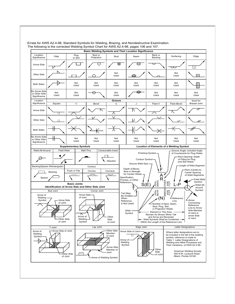 Errata for AWS A2.4-98, Standard Symbols for Welding, Brazing, and Nondestructive Examination. The following is the corrected Welding Symbol Chart for AWS A2.4-98, pages 106 and 107. Basic Welding Symbols and Their Location Significance Location Significance Spot or Projection Plug or Slot Fillet Stud Back or Backing Seam Edge Surfacing Arrow Side Not Used Other Side Not Used Both Sides No Arrow Side or Other Side Significance Not Used Not Used Not Used Not Used Not Used Not Used Not Used Not Used Not Used Not Used Not Used Not Used Square V Bevel U J Flare-V Flare-Bevel Scart for Brazed Joint Not Used Not Used Not Used Not Used Not Used Not Used Not Used Groove Location Significance Arrow Side Other Side Both Sides No Arrow Side or Other Side Significance Supplementary Symbols Weld-All-Around Field Weld Location of Elements of a Welding Symbol Melt-Thru Consumable Insert Groove Angle; included Angle of Countersink for Plug Welds Finishing Symbol Root Opening; Depth of Filling for Plug and Slot Welds Contour Symbol (Square) Groove Weld Size Backing/Spacer (Rectangular) Concave Specification, Process, or Other Reference Spacer Basic Joints Identification of Arrow Side and Other Side Joint Butt Joint T Corner Joint Tail (May Be Omitted When Reference is Not Used) Arrow Side of Joint Arrow of Welding Symbol Depth of Bevel; Size or Strength for Certain Welds Arrow Side of Joint (N) Other Side of Joint Edge Joint Lap Joint T-Joint Arrow of Welding Symbol Arrow of Welding Symbol Arrow Side of Joint Other Side Member of Joint Other Side of Joint Arrow of Welding Symbol L-P Field Weld Symbol Weld-AllAround Symbol Arrow Connecting Reference Line to Arrow Side Member of Joint or arrow Side of Joint Letter Designations Arrow Side of Joint Where letter designations are to be included in the tall of the welding symbol, reference is made to Table 1. Latter Designations of Welding and Allied Processes and Their Variations, of AWS A2.4-98. Arrow of Welding Symbol Arrow Side Member of Joint Pitch (Center-toCenter Spacing of Weld Segments Reference Line Number of Spot, Seam, Stud, Plug, Slot, or Projection Welds Element in This Area Remain As Shown When Tall and Arrow are Reversed Weld Symbols Shall be Contained Within the Length of the Reference Line Weld Symbol Other Side of Joint S(E) F ___ A R ARROW OTHER SIDE SIDE Convex SIDES Flush or Flat BOTH Backing Length of Weld Segment Contour Other Side of Joint American Welding Society 550 N.W. LeJeune Road Miami, Florida 33126
