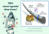 PM2.5 induced/aggravated allergic diseases? Free Presentation Template by EaTemp Recommended AQG levels and interim targets Overview of allergic diseases Allergic diseases, or hypersensitivity disorders, involve the immune system’s excessive or inappropriate response to foreign antigens, leading to hypersensitivity reactions that can impact multiple systems and damage various organs.ß Common allergic conditions include allergic rhinitis (AR), atopic dermatitis (AD), and allergic asthma (AA). ß Currently, affect an estimated 30–40 % of the global population, with projections indicating that approximately 50 % of the world’s population may be affected by 2050, resulting in a substantial socioeconomic burden. € ß Zhao ZY. Expert consensus on diagnosis and treatment of allergic diseases in children. Chin J Pediat 2019;57(3). https://doi.org/10.3760/cma.j.issn.0578- 1310.2019.03.002. € Burbank AJ, Sood AK, Kesic MJ, Peden DB, Hernandez ML. Environmental determinants of allergy and asthma in early life. J Allergy Clin Immunol 2017; 140(1):1–12. https://doi.org/10.1016/j.jaci.2017.05.010. Mechanism of PM2.5 induced/aggravated allergic diseases the mechanisms which induces or worsens allergic diseases remain unclear. The latest experimental research findings indicate that PM2.5 induces senescence in airway smooth muscle cells and elicits a senescence-associated secretory phenotype (SASP) through autophagy-induced GATA4/TRAF6/NF-κB signaling, thereby promoting the synthesis of collagen-i and α-smooth muscle actin ( α-SMA) and leading to airway smooth muscle remodeling. Cheng PP, Yu F, Chen SJ, Feng X, Jia ZH, Hu SH, et al. PM2.5 exposure-induced senescence-associated secretory phenotype in airway smooth muscle cells contributes to airway remodeling. Environ Pollut 2024;347:123674. https://doi. org/10.1016/j.envpol.2024.123674. https://www.biorender.com/template/senescence-associated-secretory-phenotype-sasp disrupts barrier function the potential mechanism of PM2.5 exposure resulting in disruption of the barrier function. https://www.sciencedirect.com/science/article/pii/S2949913524000120 increases oxidative stress the potential mechanism of PM2.5 exposure resulting in increased OS Created with MedPeer (www.medpeer.cn). interferes with immune balance the potential mechanism of PM2.5 exposure causing interference with the immune balance. https://www.sciencedirect.com/science/article/pii/S2949913524000120 synergistic sensitization effect the potential mechanism of the mechanism of PM2.5 inducing/aggravating allergic diseases. https://www.sciencedirect.com/science/article/pii/S2949913524000120 The results demonstrate that exposure with PM significantly exacerbates ocular allergy, evidenced by increased eye-lid edema, mast cell degranulation, inflammatory cytokines (IL-4, IL-5 and TNF-α), cell proliferation (Ki67), and serum IgE, polymorphonuclear leukocytes (PMN), and apoptosis and reduced goblet cells. These findings elucidate the detrimental impact of PM exposure on exacerbating the severity of AED. Noticeably, diminished goblet cells highlight disruptions in ocular surface integrity, while increased PMN infiltration with an elevated production of IgE signifies a systemic allergic response with inflammation. Schematic illustration of the mouse AED model with OVA sensitized PM exposed conjunctiva and cornea. Inflammation in the conjunctiva and cornea, indicative of allergic responses, was observed following sensitization with OVA and exposure to PM. (C) Eye features of naive, OVA and OVA+PMexposedgroupswereassessedbyslit-lamp microscopy. (D) Changes in the serum IgE concentration level in naive, OVA and OVA + PM exposed groups. In D, data are presented in bar graph with mean ± SEM (n = 8, * p < 0.05, *** p < 0.001), significant difference using one-way ANOVA followed by the Tukey test). • Exposure to PM2.5 significantly raised the likelihood of ocular redness (adjusted OR: 12.39, 95% CI), watering (adjusted OR: 2.56, 95% CI), and dryness (adjusted OR: 5.06, 95% CI). • Additionally, these symptoms had an exposure-response relationship with increasing 1-OHP levels. • Ocular symptoms worsened in frequency and severity during the high PM2.5 season, showing a strong link to elevated PM2.5 levels. • Lymphocyte counts were also positively correlated with redness, watering, and dryness during high PM2.5 exposure. • In conclusion,this study shows that subjects exposed to higher PM2.5 levels presented more significant ocular surface alterations. This illustration clearly portrays the impact of PM2.5 exposure on ocular health through inhalation and direct penetration into the eye. PM2.5 induces lacrimal and Meibomian gland dysfunction, leading to neovascularization, inflammation, apoptosis, and oxidative. Daily PM2.5 concentrations found in the Subdistrict, Thung Satok during the sampling period. Mean 1-hydroxypyrene (1-OHP) levels (µmol/mol Cr) during low and high PM2.5 seasons. Bars represent mean values with standard deviation (p < 0.001). Asian Pac J Allergy Immunol 2020;38:19-28 DOI 10.12932/AP-100619-0579 “Particulate matter exposure can exacerbate pre-existing asthma and may contribute to developing asthma, allergic rhinitis, and aeroallergen sensitization. Short-term and long-term strategies are needed to reduce disease severity and prevent new-onset disease development. Additional research is needed to identify effective avoidance strategies and therapeutic approaches.” J.-Z. Wu et al. / Chronic Diseases and Translational Medicine 4 (2018) 95e102 PM2.5-10 activates neutrophils and eosin ophils PM2.5 induces oxidative stress PM2.5 induces antigen-presenting cell-mediated inflammatory responses PM2.5 leads to apoptosis and autophagy PM2.5 causes imbalance of T helper cells. The contribution of particulate matter to respiratory allergies according to recent evidence Model showing the possible interactions between genetics, particulate matter exposure, and aeroallergen 